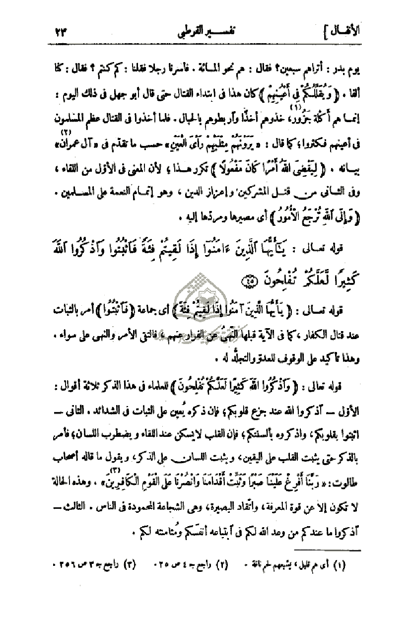 قَوْلُهُ تَعَالَى: (يَا أَيُّهَا الَّذِينَ آمَنُوا إِذا لَقِيتُمْ فِئَةً) أَيْ جَمَاعَةً (فَاثْبُتُوا) أَمْرٌ بِالثَّبَاتِ عِنْدَ قِتَالِ الْكُفَّارِ، كَمَا فِي الْآيَةِ قَبْلَهَا النَّهْيُ عَنِ الْفِرَارِ عَنْهُمْ، فَالْتَقَى الْأَمْرُ وَالنَّهْيُ عَلَى سَوَاءٍ. وَهَذَا تَأْكِيدٌ عَلَى الْوُقُوفِ لِلْعَدُوِّ وَالتَّجَلُّدِ لَهُ. قَوْلُهُ تَعَالَى: (وَاذْكُرُوا اللَّهَ كَثِيراً لَعَلَّكُمْ تُفْلِحُونَ) لِلْعُلَمَاءِ فِي هَذَا الذِّكْرِ ثَلَاثَةَ أَقْوَالٍ: الْأَوَّلُ- اذْكُرُوا اللَّهَ عِنْدَ جَزَعِ قُلُوبِكُمْ، فَإِنَّ ذِكْرَهُ يُعِينُ عَلَى الثَّبَاتِ فِي الشَّدَائِدِ. الثَّانِي- اثْبُتُوا بِقُلُوبِكُمْ، وَاذْكُرُوهُ بِأَلْسِنَتِكُمْ، فَإِنَّ الْقَلْبَ لَا يَسْكُنُ عِنْدَ اللِّقَاءِ وَيَضْطَرِبُ اللِّسَانُ، فَأَمَرَ بِالذِّكْرِ حَتَّى يَثْبُتَ الْقَلْبُ عَلَى الْيَقِينِ، وَيَثْبُتَ اللِّسَانُ عَلَى الذِّكْرِ، وَيَقُولَ مَا قَالَهُ أَصْحَابُ طَالُوتَ:" رَبَّنا أَفْرِغْ عَلَيْنا صَبْراً وَثَبِّتْ أَقْدامَنا وَانْصُرْنا عَلَى الْقَوْمِ الْكافِرِينَ" «٣» [البقرة: ٢٥٠]. وَهَذِهِ الْحَالَةُ لَا تَكُونُ إِلَّا عَنْ قُوَّةِ الْمَعْرِفَةِ، وَاتِّقَادِ الْبَصِيرَةِ، وَهِيَ الشُّجَاعَةُ الْمَحْمُودَةُ فِي النَّاسِ. الثَّالِثُ- اذْكُرُوا مَا عِنْدَكُمْ مِنْ وَعْدِ اللَّهِ لَكُمْ فِي ابْتِيَاعِهِ أَنْفُسَكُمْ وَمُثَامَنَتِهِ لَكُمْ.