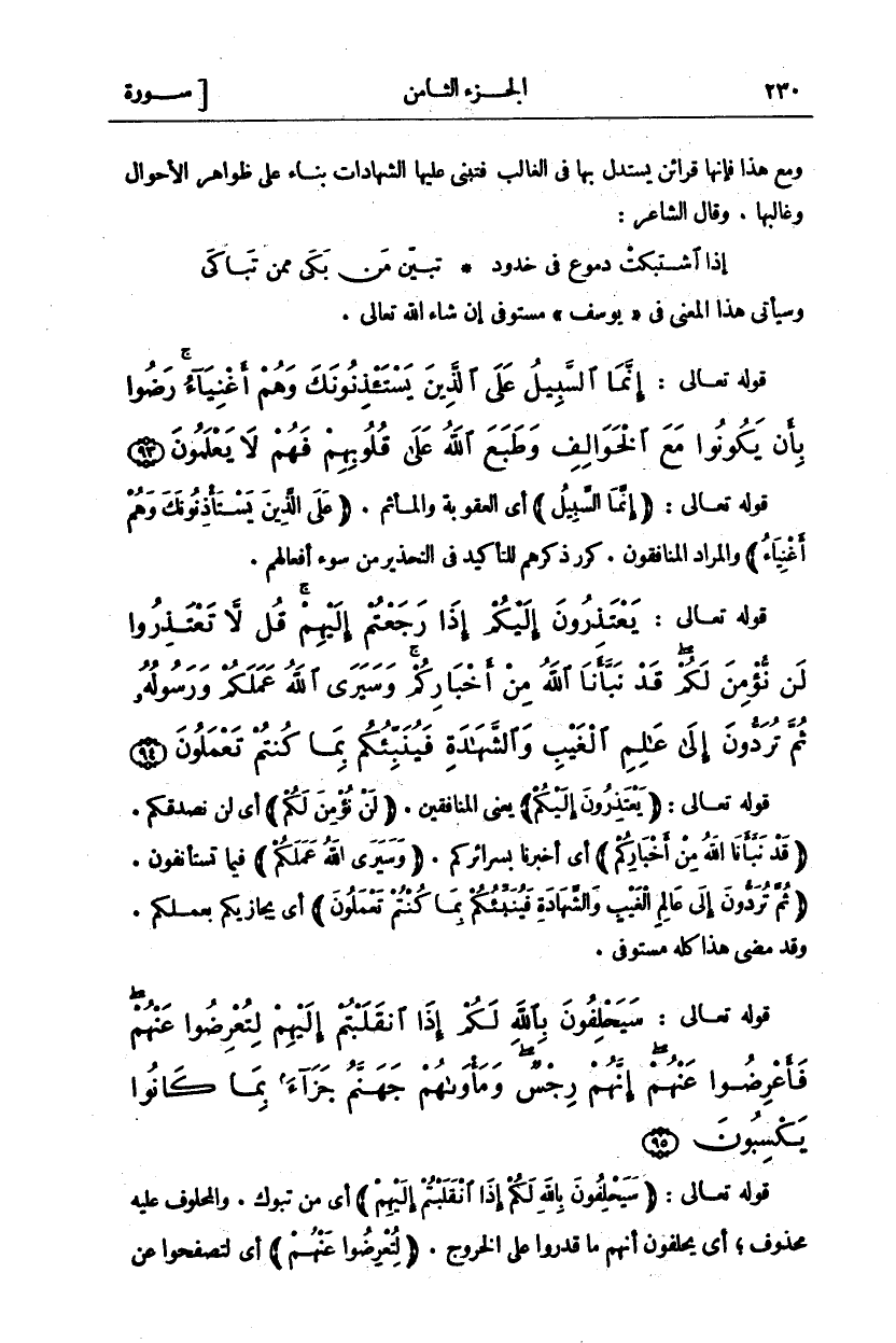 إِنَّمَا السَّبِيلُ عَلَى الَّذِينَ يَسْتَأْذِنُونَكَ وَهُمْ أَغْنِياءُ رَضُوا بِأَنْ يَكُونُوا مَعَ الْخَوالِفِ وَطَبَعَ اللَّهُ عَلى قُلُوبِهِمْ فَهُمْ لَا يَعْلَمُونَ (٩٣)