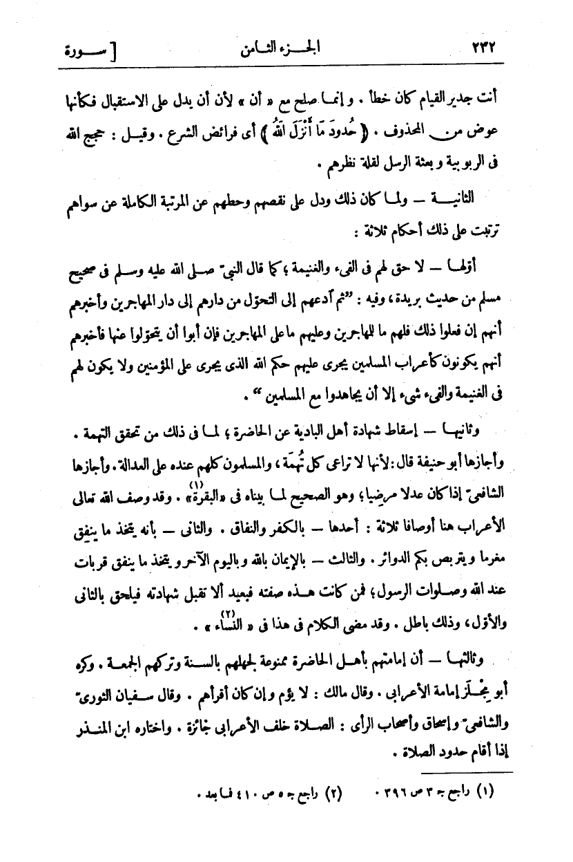 أَنْتَ جَدِيرٌ الْقِيَامَ كَانَ خَطَأً. وَإِنَّمَا صَلُحَ مَعَ" أَنْ" لِأَنَّ أَنْ يَدُلُّ عَلَى الِاسْتِقْبَالِ فَكَأَنَّهَا عِوَضٌ مِنَ الْمَحْذُوفِ. (حُدُودَ مَا أَنْزَلَ اللَّهُ) أَيْ فَرَائِضَ الشَّرْعِ. وَقِيلَ: حُجَجُ اللَّهِ في الربوبية وبعثة الرسل لقلة نظرهم. الثانية- وَلَمَّا كَانَ ذَلِكَ وَدَلَّ عَلَى نَقْصِهِمْ وَحَطِّهِمْ عَنِ الْمَرْتَبَةِ الْكَامِلَةِ عَنْ سِوَاهُمْ تَرَتَّبَتْ عَلَى ذَلِكَ أَحْكَامٌ ثَلَاثَةٌ: أَوَّلُهَا- لَا حَقَّ لَهُمْ فِي الْفَيْءِ وَالْغَنِيمَةِ كَمَا قَالَ النَّبِيُّ صَلَّى اللَّهُ عَلَيْهِ وَسَلَّمَ فِي صَحِيحِ مُسْلِمٍ مِنْ حَدِيثِ بُرَيْدَةَ وَفِيهِ:" ثُمَّ ادْعُهُمْ إِلَى التَّحَوُّلِ من دار هم إِلَى دَارِ الْمُهَاجِرِينَ وَأَخْبِرْهُمْ أَنَّهُمْ إِنْ فَعَلُوا ذَلِكَ فَلَهُمْ مَا لِلْمُهَاجِرِينَ وَعَلَيْهِمْ مَا عَلَى الْمُهَاجِرِينَ فَإِنْ أَبَوْا أَنْ يَتَحَوَّلُوا عَنْهَا فَأَخْبِرْهُمْ أَنَّهُمْ يَكُونُونَ كَأَعْرَابِ الْمُسْلِمِينَ يَجْرِي عَلَيْهِمْ حُكْمُ اللَّهِ الَّذِي يَجْرِي عَلَى الْمُؤْمِنِينَ وَلَا يَكُونُ لهم في الغنيمة والفيء شي إِلَّا أَنْ يُجَاهِدُوا مَعَ الْمُسْلِمِينَ". وَثَانِيهَا- إِسْقَاطُ شَهَادَةِ أَهْلِ الْبَادِيَةِ عَنِ الْحَاضِرَةِ لِمَا فِي ذلك من تحقق التهمة. وأجاز ها أَبُو حَنِيفَةَ قَالَ: لِأَنَّهَا لَا تُرَاعَى كُلُّ تُهْمَةٍ وَالْمُسْلِمُونَ كُلُّهُمْ عِنْدَهُ عَلَى الْعَدَالَةِ. وَأَجَازَهَا الشَّافِعِيُّ إِذَا كَانَ عَدْلًا مَرْضِيًّا وَهُوَ الصَّحِيحُ لِمَا بَيَّنَّاهُ فِي (الْبَقَرَةِ) «١». وَقَدْ وَصَفَ اللَّهُ تَعَالَى الْأَعْرَابَ هُنَا أَوْصَافًا ثَلَاثَةً: أَحَدُهَا- بِالْكُفْرِ وَالنِّفَاقِ. وَالثَّانِي- بِأَنَّهُ يَتَّخِذُ مَا يُنْفِقُ مَغْرَمًا وَيَتَرَبَّصُ بِكُمُ الدَّوَائِرَ. وَالثَّالِثُ- بِالْإِيمَانِ بِاللَّهِ وَبِالْيَوْمِ الْآخِرِ وَيَتَّخِذُ مَا يُنْفِقُ قُرُبَاتٍ عِنْدَ اللَّهِ وَصَلَوَاتِ الرَّسُولِ فَمَنْ كَانَتْ هَذِهِ صِفَتَهُ فَبَعِيدٌ أَلَّا تُقْبَلَ شَهَادَتُهُ فَيُلْحَقُ بِالثَّانِي وَالْأَوَّلِ وَذَلِكَ بَاطِلٌ. وَقَدْ مَضَى الْكَلَامُ فِي هَذَا فِي (النِّسَاءِ) «٢». وَثَالِثُهَا- أَنَّ إِمَامَتَهُمْ بِأَهْلِ الْحَاضِرَةِ مَمْنُوعَةٌ لِجَهْلِهِمْ بِالسُّنَّةِ وَتَرْكِهِمْ الْجُمْعَةَ. وَكَرِهَ أَبُو مِجْلَزٍ إِمَامَةَ الْأَعْرَابِيِّ. وَقَالَ مَالِكٌ: لَا يَؤُمُّ وَإِنْ كان أقرأ هم. وَقَالَ سُفْيَانُ الثَّوْرِيُّ وَالشَّافِعِيُّ وَإِسْحَاقُ وَأَصْحَابُ الرَّأْيِ: الصَّلَاةُ خَلْفَ الْأَعْرَابِيِّ جَائِزَةٌ. وَاخْتَارَهُ ابْنُ الْمُنْذِرِ إذا أقام حدود الصلاة.