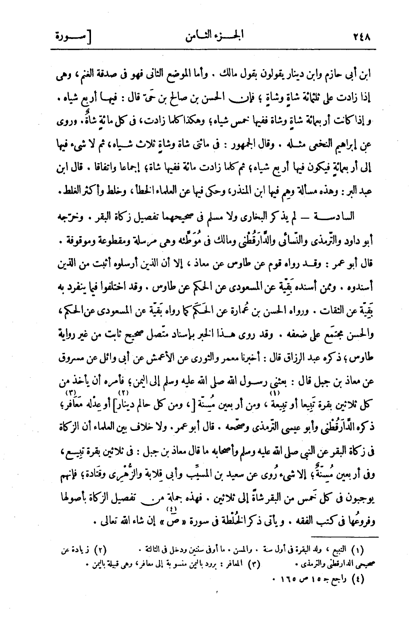 ابن أَبِي حَازِمٍ وَابْنَ دِينَارٍ يَقُولُونَ بِقَوْلِ مَالِكٍ. وَأَمَّا الْمَوْضِعُ الثَّانِي فَهُوَ فِي صَدَقَةِ الْغَنَمِ، وَهِيَ إِذَا زَادَتْ عَلَى ثَلَاثِمِائَةِ شَاةٍ وَشَاةٍ، فَإِنَّ الْحَسَنَ بْنَ صَالِحِ بْنِ حَيٍّ قَالَ: فِيهَا أَرْبَعُ شِيَاهٍ. وَإِذَا كَانَتْ أَرْبَعَمِائَةِ شَاةٍ وَشَاةٍ فَفِيهَا خَمْسُ شِيَاهٍ، وَهَكَذَا كُلَّمَا زَادَتْ، فِي كُلِّ مِائَةٍ شَاةٌ. وَرُوِيَ عَنْ إِبْرَاهِيمَ النَّخَعِيِّ مِثْلُهُ. وَقَالَ الْجُمْهُورُ: فِي مِائَتَيْ شَاةٍ وشاه ثلاث شياه، ثم لا شي فِيهَا إِلَى أَرْبَعِمِائَةٍ فَيَكُونُ فِيهَا أَرْبَعُ شِيَاهٍ، ثُمَّ كُلَّمَا زَادَتْ مِائَةً فَفِيهَا شَاةٌ، إِجْمَاعًا وَاتِّفَاقًا. قَالَ ابْنُ عَبْدِ الْبَرِّ: وَهَذِهِ مَسْأَلَةٌ وَهِمَ فِيهَا ابْنُ الْمُنْذِرِ، وَحَكَى فِيهَا عَنِ الْعُلَمَاءِ الْخَطَأَ، وَخَلَّطَ وَأَكْثَرَ الْغَلَطَ. السَّادِسَةُ- لَمْ يذكر البخاري ولا مسلم في صحيحهما تَفْصِيلَ زَكَاةِ الْبَقَرِ. وَخَرَّجَهُ أَبُو دَاوُدَ وَالتِّرْمِذِيُّ وَالنَّسَائِيُّ وَالدَّارَقُطْنِيُّ وَمَالِكٌ فِي مُوَطَّئِهِ وَهِيَ مُرْسَلَةٌ وَمَقْطُوعَةٌ وَمَوْقُوفَةٌ. قَالَ أَبُو عُمَرَ: وَقَدْ رَوَاهُ قَوْمٌ عَنْ طَاوُسٍ عَنْ مُعَاذٍ، إِلَّا أَنَّ الَّذِينَ أَرْسَلُوهُ أَثْبَتُ مِنَ الَّذِينَ أَسْنَدُوهُ. وَمِمَّنْ أَسْنَدَهُ بَقِيَّةُ عَنِ الْمَسْعُودِيِّ عَنِ الْحَكَمِ عَنْ طَاوُسٍ. وَقَدِ اخْتَلَفُوا فِيمَا يَنْفَرِدُ بِهِ بَقِيَّةُ عَنِ الثِّقَاتِ. وَرَوَاهُ الْحَسَنُ بْنُ عُمَارَةَ عَنِ الْحَكَمِ كَمَا رَوَاهُ بَقِيَّةُ عَنِ الْمَسْعُودِيِّ عَنِ الْحَكَمِ، وَالْحَسَنُ مُجْتَمَعٌ عَلَى ضَعْفِهِ. وَقَدْ رُوِيَ هَذَا الْخَبَرُ بِإِسْنَادٍ مُتَّصِلٍ صَحِيحٍ ثَابِتٍ مِنْ غَيْرِ رِوَايَةِ طَاوُسٍ، ذَكَرَهُ عَبْدُ الرَّزَّاقِ قَالَ: أَخْبَرَنَا مَعْمَرٌ وَالثَّوْرِيُّ عَنِ الْأَعْمَشِ عَنْ أَبِي وَائِلٍ عَنْ مَسْرُوقٍ عَنْ مُعَاذِ بْنِ جَبَلٍ قَالَ: بَعَثَنِي رَسُولُ اللَّهِ عَلَيْهِ وَسَلَّمَ إِلَى الْيَمَنِ فَأَمَرَهُ أَنْ يَأْخُذَ مِنْ كُلِّ ثَلَاثِينَ بَقَرَةً تَبِيعًا أَوْ تَبِيعَةً «١»، وَمِنْ أَرْبَعِينَ مُسِنَّةً [، ومن كل حالم دينار «٢»] أَوْ عِدْلَهُ مَعَافِرَ «٣»، ذَكَرَهُ الدَّارَقُطْنِيُّ وَأَبُو عِيسَى التِّرْمِذِيُّ وَصَحَّحَهُ. قَالَ أَبُو عُمَرَ. وَلَا خِلَافَ بَيْنِ الْعُلَمَاءِ أَنَّ الزَّكَاةَ فِي زَكَاةِ الْبَقَرِ عَنِ النَّبِيِّ صَلَّى اللَّهُ عَلَيْهِ وَسَلَّمَ وَأَصْحَابِهِ مَا قَالَ مُعَاذُ بْنُ جَبَلٍ: فِي ثَلَاثِينَ بقرة تبيع، وفي أربعين مسنة إلا شي رُوِيَ عَنْ سَعِيدِ بْنِ الْمُسَيَّبِ وَأَبِي قِلَابَةَ وَالزُّهْرِيِّ وَقَتَادَةَ، فَإِنَّهُمْ يُوجِبُونَ فِي كُلِّ خَمْسٍ مِنَ الْبَقَرِ شَاةً إِلَى ثَلَاثِينَ. فَهَذِهِ جُمْلَةٌ مِنْ تَفْصِيلِ الزَّكَاةِ بِأُصُولِهَا وَفُرُوعِهَا فِي كُتُبِ الْفِقْهِ. وَيَأْتِي ذِكْرُ الْخُلْطَةِ فِي سُورَةِ [ص «٤»] إِنْ شَاءَ اللَّهُ تَعَالَى.