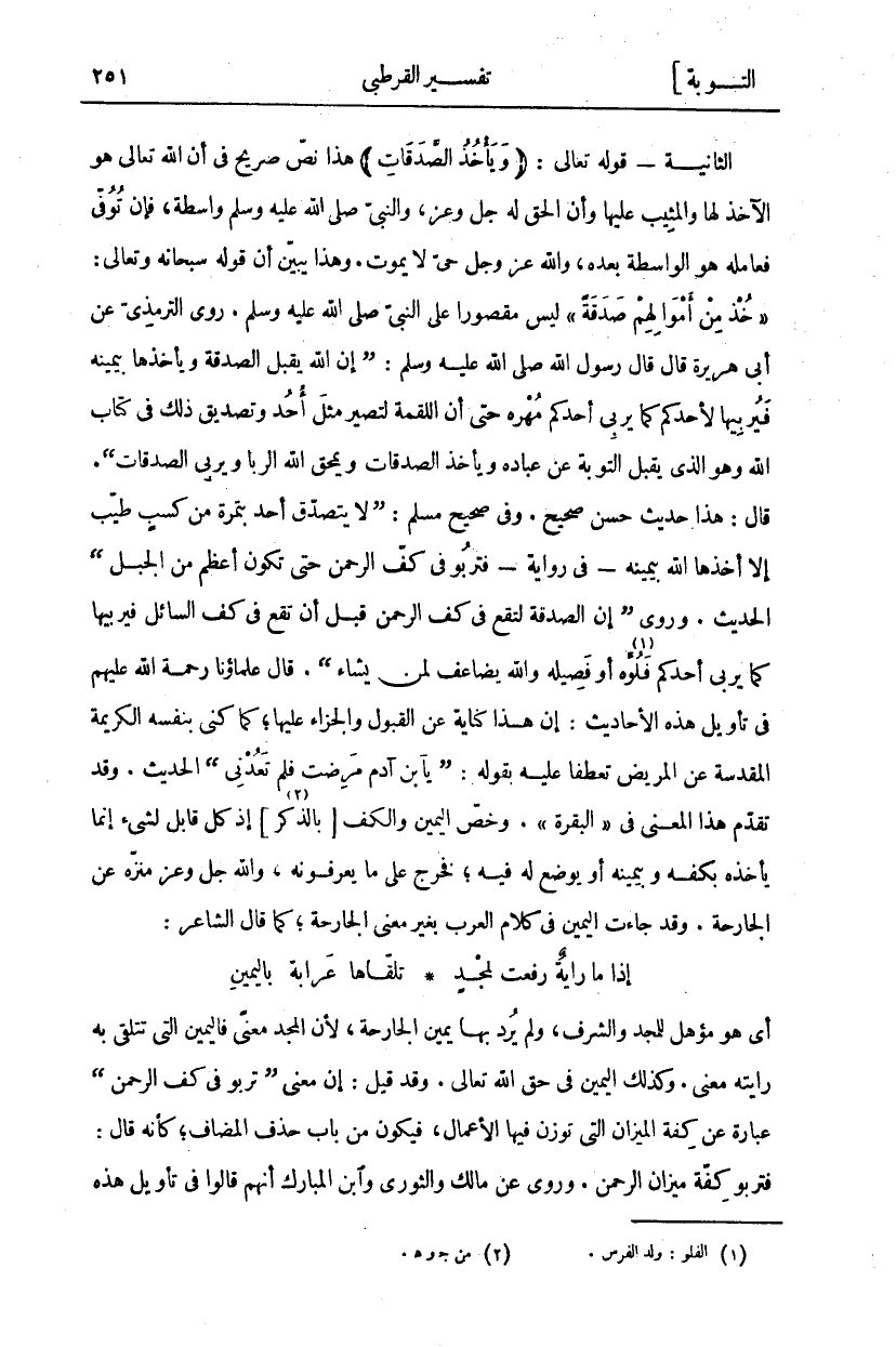 الثانية- قوله تعالى:" وَيَأْخُذُ الصَّدَقاتِ" هَذَا نَصٌّ صَرِيحٌ فِي أَنَّ اللَّهَ تَعَالَى هُوَ الْآخِذُ لَهَا وَالْمُثِيبُ عَلَيْهَا وأن الحق له عز وجل، وَالنَّبِيُّ صَلَّى اللَّهُ عَلَيْهِ وَسَلَّمَ وَاسِطَةٌ فَإِنْ تُوُفِّيَ فَعَامِلُهُ هُوَ الْوَاسِطَةُ بَعْدَهُ، وَاللَّهُ عَزَّ وَجَلَّ حَيٌّ لَا يَمُوتُ. وَهَذَا يُبَيِّنُ أَنَّ قَوْلَهُ سُبْحَانَهُ وَتَعَالَى:" خُذْ مِنْ أَمْوالِهِمْ صَدَقَةً" لَيْسَ مَقْصُورًا عَلَى النَّبِيِّ صَلَّى اللَّهُ عَلَيْهِ وَسَلَّمَ: رَوَى التِّرْمِذِيُّ عَنْ أَبِي هُرَيْرَةَ قَالَ قَالَ رَسُولُ اللَّهِ صَلَّى اللَّهُ عَلَيْهِ وَسَلَّمَ: (إِنَّ اللَّهَ يَقْبَلُ الصَّدَقَةَ وَيَأْخُذُهَا بِيَمِينِهِ فَيُرْبِيهَا لاحد كم كما يربي أحد كم مُهْرَهُ حَتَّى أَنَّ اللُّقْمَةَ لَتَصِيرُ مِثْلَ أُحُدٍ وتصديق ذلك في كتاب اللَّهَ" هُوَ يَقْبَلُ التَّوْبَةَ عَنْ عِبادِهِ وَيَأْخُذُ الصَّدَقاتِ" وَ" يَمْحَقُ اللَّهُ الرِّبا وَيُرْبِي الصَّدَقاتِ". قَالَ: هَذَا حَدِيثٌ حَسَنٌ صَحِيحٌ. وَفِي صَحِيحِ مُسْلِمٍ: (لَا يَتَصَدَّقُ أَحَدٌ بِتَمْرَةٍ مِنْ كَسْبٍ طَيِّبٍ إِلَّا أَخَذَهَا اللَّهُ بِيَمِينِهِ- فِي رِوَايَةٍ- فَتَرْبُو فِي كَفِّ الرَّحْمَنِ حَتَّى تَكُونَ أَعْظَمَ مِنَ الْجَبَلِ) الْحَدِيثَ. وَرُوِيَ (إِنَّ الصَّدَقَةَ لَتَقَعُ فِي كَفِّ الرَّحْمَنِ قَبْلَ أَنْ تَقَعَ فِي كَفِّ السَّائِلِ فَيُرَبِّيهَا كَمَا يُرَبِّي أَحَدُكُمْ فَلُوَّهُ «١» أَوْ فَصِيلَهُ وَاللَّهُ يُضَاعِفُ لِمَنْ يَشَاءُ (. قَالَ عُلَمَاؤُنَا رَحْمَةُ اللَّهِ عَلَيْهِمْ فِي تَأْوِيلِ هَذِهِ الْأَحَادِيثِ: إِنَّ هَذَا كِنَايَةٌ عَنِ الْقَبُولِ وَالْجَزَاءِ عَلَيْهَا، كَمَا كَنَّى بِنَفْسِهِ الْكَرِيمَةِ الْمُقَدَّسَةِ عَنِ المريض تعطفا عليه بقوله: (يَا بْنَ آدَمَ مَرِضْتُ فَلَمْ تَعُدْنِي) الْحَدِيثَ. وَقَدْ تَقَدَّمَ هَذَا الْمَعْنَى فِي [الْبَقَرَةِ]. وَخُصَّ الْيَمِينُ وَالْكَفُّ [بِالذِّكْرِ «٢»] إِذْ كُلُّ قَابِلٍ لِشَيْءٍ إِنَّمَا يَأْخُذُهُ بِكَفِّهِ وَبِيَمِينِهِ أَوْ يُوضَعُ لَهُ فِيهِ، فَخَرَجَ على ما يعرفونه، والله عز وجل مُنَزَّهٌ عَنِ الْجَارِحَةِ. وَقَدْ جَاءَتِ الْيَمِينُ فِي كَلَامِ الْعَرَبِ بِغَيْرِ مَعْنَى الْجَارِحَةِ، كَمَا قَالَ الشَّاعِرُ: