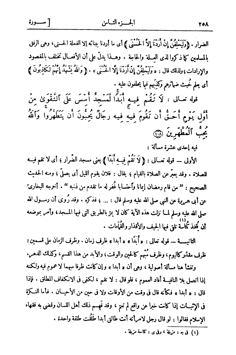 فِيهِ إِحْدَى عَشْرَةَ مَسْأَلَةً: الْأُولَى- قَوْلُهُ تَعَالَى: (لَا تَقُمْ فِيهِ أَبَداً) يَعْنِي مَسْجِدَ الضِّرَارِ، أَيْ لَا تَقُمْ فِيهِ لِلصَّلَاةِ. وَقَدْ يُعَبَّرُ عَنِ الصَّلَاةِ بِالْقِيَامِ، يُقَالُ: فُلَانٌ يَقُومُ اللَّيْلَ أَيْ يُصَلِّي، وَمِنْهُ الْحَدِيثُ الصَّحِيحُ: (مَنْ قَامَ رَمَضَانَ إِيمَانًا وَاحْتِسَابًا غُفِرَ لَهُ مَا تَقَدَّمَ مِنْ ذَنْبِهِ). أَخْرَجَهُ الْبُخَارِيِّ عَنْ أَبِي هُرَيْرَةَ عَنِ النَّبِيِّ صَلَّى اللَّهُ عَلَيْهِ وَسَلَّمَ قَالَ ... ، فَذَكَرَهُ. وَقَدْ رُوِيَ أَنَّ رَسُولَ اللَّهِ صَلَّى اللَّهُ عَلَيْهِ وَسَلَّمَ لَمَّا نَزَلَتْ هَذِهِ الْآيَةُ كَانَ لَا يَمُرُّ بِالطَّرِيقِ الَّتِي فِيهَا الْمَسْجِدُ، وَأَمَرَ بِمَوْضِعِهِ أَنْ يُتَّخَذَ كُنَاسَةً «١» تُلْقَى فِيهَا الْجِيَفُ وَالْأَقْذَارُ وَالْقُمَامَاتُ. الثَّانِيَةُ- قَوْلُهُ تَعَالَى:" أَبَداً"" أَبَداً" ظَرْفُ زَمَانٍ. وَظَرْفُ الزَّمَانِ عَلَى قِسْمَيْنِ: ظَرْفٌ مُقَدَّرٌ كَالْيَوْمِ، وَظَرْفٌ مُبْهَمٌ كَالْحِينِ وَالْوَقْتِ، وَالْأَبَدُ مِنْ هَذَا الْقَسَمِ، وَكَذَلِكَ الدَّهْرُ. وَتَنْشَأُ هُنَا مَسْأَلَةٌ أُصُولِيَّةٌ، وَهِيَ أَنَّ" أَبَدًا" وَإِنْ كَانَتْ ظَرْفًا مُبْهَمًا لَا عُمُومَ فِيهِ وَلَكِنَّهُ إِذَا اتَّصَلَ بِلَا النَّافِيَةِ أَفَادَ الْعُمُومَ، فَلَوْ قَالَ: لَا تَقُمْ، لَكَفَى فِي الِانْكِفَافِ الْمُطْلَقِ. فَإِذَا قَالَ:" أَبَدًا" فَكَأَنَّهُ قَالَ فِي وَقْتٍ مِنَ الْأَوْقَاتِ وَلَا فِي حِينٍ مِنَ الْأَحْيَانِ. فَأَمَّا النَّكِرَةُ فِي الْإِثْبَاتِ إِذَا كَانَتْ خَبَرًا عَنْ وَاقِعٍ لَمْ تَعُمْ، وَقَدْ فَهِمَ ذَلِكَ أَهْلُ اللِّسَانِ وَقَضَى بِهِ فُقَهَاءُ الْإِسْلَامِ فَقَالُوا: لَوْ قَالَ رَجُلٌ لِامْرَأَتِهِ أَنْتِ طالق أبدا طلقت طلقة واحدة.
