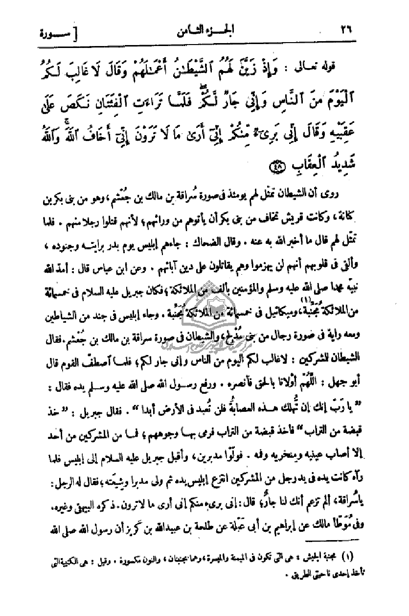 وَإِذْ زَيَّنَ لَهُمُ الشَّيْطانُ أَعْمالَهُمْ وَقالَ لَا غالِبَ لَكُمُ الْيَوْمَ مِنَ النَّاسِ وَإِنِّي جارٌ لَكُمْ فَلَمَّا تَراءَتِ الْفِئَتانِ نَكَصَ عَلى عَقِبَيْهِ وَقالَ إِنِّي بَرِيءٌ مِنْكُمْ إِنِّي أَرى مَا لَا تَرَوْنَ إِنِّي أَخافُ اللَّهَ وَاللَّهُ شَدِيدُ الْعِقابِ (٤٨)
