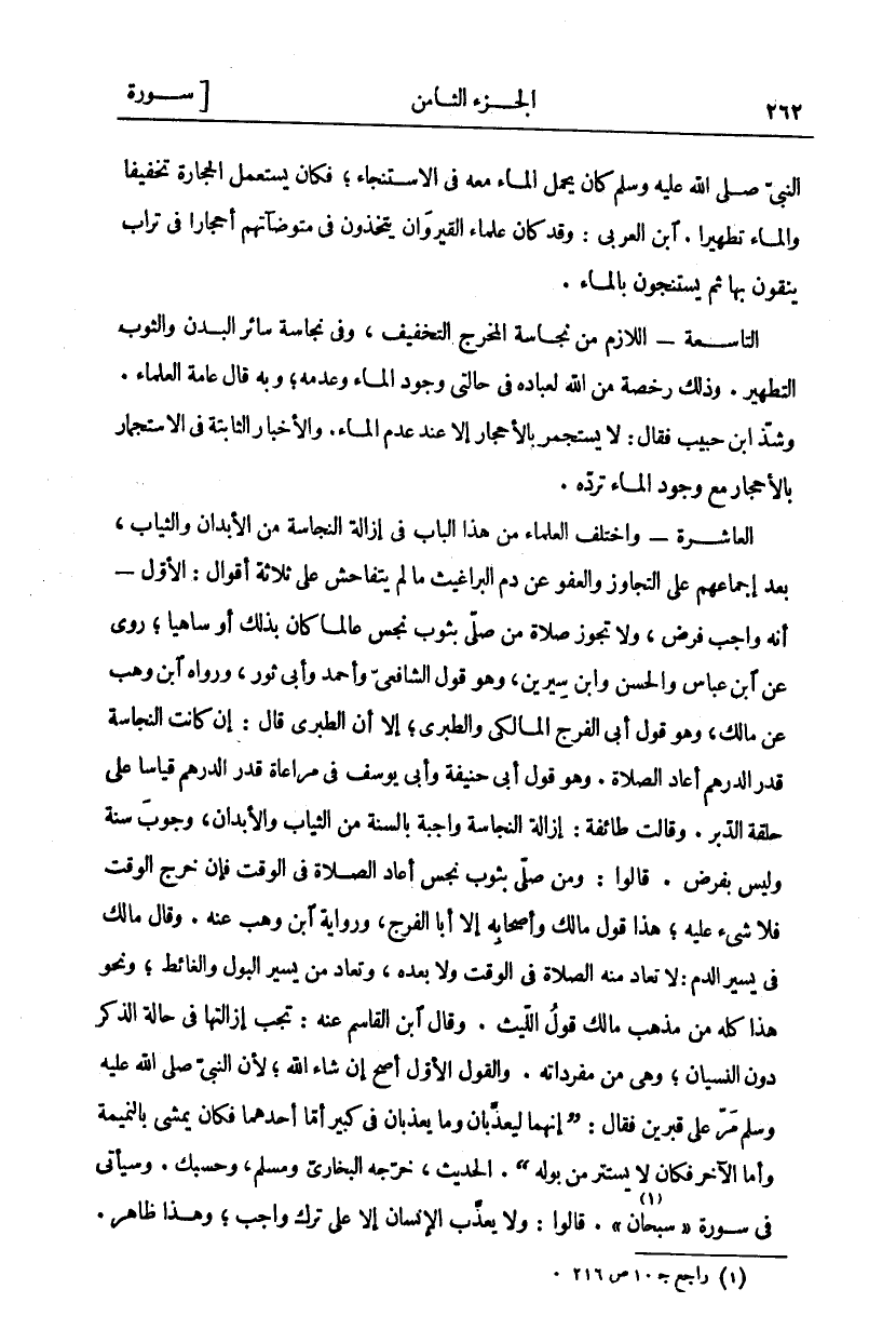النَّبِيَّ صَلَّى اللَّهُ عَلَيْهِ وَسَلَّمَ كَانَ يَحْمِلُ الْمَاءَ مَعَهُ فِي الِاسْتِنْجَاءِ، فَكَانَ يَسْتَعْمِلُ الْحِجَارَةَ تَخْفِيفًا وَالْمَاءَ تَطْهِيرًا. ابْنُ الْعَرَبِيِّ: وَقَدْ كَانَ عُلَمَاءُ الْقَيْرَوَانِ يَتَّخِذُونَ فِي مُتَوَضَّآتِهِمْ أَحْجَارًا فِي تُرَابٍ يُنَقَّوْنَ بِهَا ثُمَّ يَسْتَنْجُونَ بِالْمَاءِ. التَّاسِعَةُ- اللَّازِمُ مِنْ نَجَاسَةِ الْمَخْرَجِ التَّخْفِيفُ، وَفِي نَجَاسَةِ سَائِرِ الْبَدَنِ وَالثَّوْبِ التَّطْهِيرُ. وَذَلِكَ رُخْصَةٌ مِنَ اللَّهِ لِعِبَادِهِ فِي حَالَتَيْ وُجُودِ الْمَاءِ وَعَدَمِهِ، وَبِهِ قَالَ عَامَّةُ الْعُلَمَاءِ. وَشَذَّ ابْنُ حَبِيبٍ فَقَالَ: لَا يُسْتَجْمَرُ بِالْأَحْجَارِ إِلَّا عِنْدَ عَدَمِ الْمَاءِ. وَالْأَخْبَارُ الثَّابِتَةُ فِي الِاسْتِجْمَارِ بِالْأَحْجَارِ مَعَ وُجُودِ الْمَاءِ تَرُدُّهُ. الْعَاشِرَةُ- وَاخْتَلَفَ الْعُلَمَاءُ مِنْ هَذَا الْبَابِ فِي إِزَالَةِ النَّجَاسَةِ مِنَ الْأَبْدَانِ وَالثِّيَابِ، بَعْدَ إِجْمَاعِهِمْ عَلَى التَّجَاوُزِ وَالْعَفْوِ عَنْ دَمِ الْبَرَاغِيثِ مَا لَمْ يُتَفَاحَشْ عَلَى ثَلَاثَةِ أَقْوَالٍ: الْأَوَّلُ- أَنَّهُ وَاجِبُ فَرْضٍ، وَلَا تَجُوزُ صَلَاةُ مَنْ صَلَّى بِثَوْبٍ نَجِسٍ عَالِمًا كَانَ بِذَلِكَ أَوْ سَاهِيًا، رُوِيَ عَنِ ابْنِ عَبَّاسٍ وَالْحَسَنِ وَابْنِ سِيرِينَ، وَهُوَ قَوْلُ الشَّافِعِيِّ وَأَحْمَدَ وَأَبِي ثَوْرٍ، وَرَوَاهُ ابْنُ وَهْبٍ عَنْ مَالِكٍ، وَهُوَ قَوْلُ أَبِي الْفَرَجِ الْمَالِكِيِّ وَالطَّبَرِيِّ، إِلَّا أَنَّ الطَّبَرِيَّ قَالَ: إِنْ كَانَتِ النَّجَاسَةُ قَدْرَ الدِّرْهَمِ أَعَادَ الصَّلَاةَ. وَهُوَ قَوْلُ أَبِي حَنِيفَةَ وَأَبِي يُوسُفَ فِي مُرَاعَاةِ قَدْرِ الدِّرْهَمِ قِيَاسًا عَلَى حَلْقَةِ الدُّبُرِ. وَقَالَتْ طَائِفَةٌ: إِزَالَةُ النَّجَاسَةِ وَاجِبَةٌ بِالسُّنَّةِ مِنَ الثِّيَابِ وَالْأَبْدَانِ، وُجُوبَ سُنَّةٍ وَلَيْسَ بِفَرْضٍ. قَالُوا: وَمَنْ صَلَّى بِثَوْبٍ نَجِسٍ أَعَادَ الصَّلَاةَ فِي الْوَقْتِ فَإِنْ خَرَجَ الْوَقْتُ فلا شي عَلَيْهِ، هَذَا قَوْلُ مَالِكٍ وَأَصْحَابِهِ إِلَّا أَبَا الْفَرَجِ، وَرِوَايَةُ ابْنِ وَهْبٍ عَنْهُ. وَقَالَ مَالِكٌ فِي يَسِيرِ الدَّمِ: لَا تُعَادُ مِنْهُ الصَّلَاةُ فِي الْوَقْتِ وَلَا بَعْدَهُ، وَتُعَادُ مِنْ يَسِيرِ الْبَوْلِ وَالْغَائِطِ، وَنَحْوُ هَذَا كُلِّهِ مِنْ مَذْهَبِ مَالِكٍ قَوْلُ اللَّيْثِ. وَقَالَ ابْنُ الْقَاسِمِ عَنْهُ: تَجِبُ إِزَالَتُهَا فِي حَالَةِ الذِّكْرِ دُونَ النِّسْيَانِ، وَهِيَ مِنْ مُفْرَدَاتِهِ. وَالْقَوْلُ الْأَوَّلُ أَصَحُّ إِنْ شَاءَ اللَّهُ، لِأَنَّ النَّبِيَّ صَلَّى اللَّهُ عَلَيْهِ وَسَلَّمَ مَرَّ عَلَى قَبْرَيْنِ فَقَالَ: (إِنَّهُمَا لَيُعَذَّبَانِ وَمَا يُعَذَّبَانِ فِي كَبِيرٍ أَمَّا أحد هما فَكَانَ يَمْشِي بِالنَّمِيمَةِ وَأَمَّا الْآخَرُ فَكَانَ لَا يَسْتَتِرُ مِنْ بَوْلِهِ). الْحَدِيثَ، خَرَّجَهُ الْبُخَارِيُّ وَمُسْلِمٌ، وَحَسْبُكُ. وَسَيَأْتِي فِي سُورَةِ [سُبْحَانَ «١»]. قَالُوا: وَلَا يُعَذَّبُ الْإِنْسَانُ إِلَّا عَلَى تَرْكِ وَاجِبٍ، وَهَذَا ظاهر.