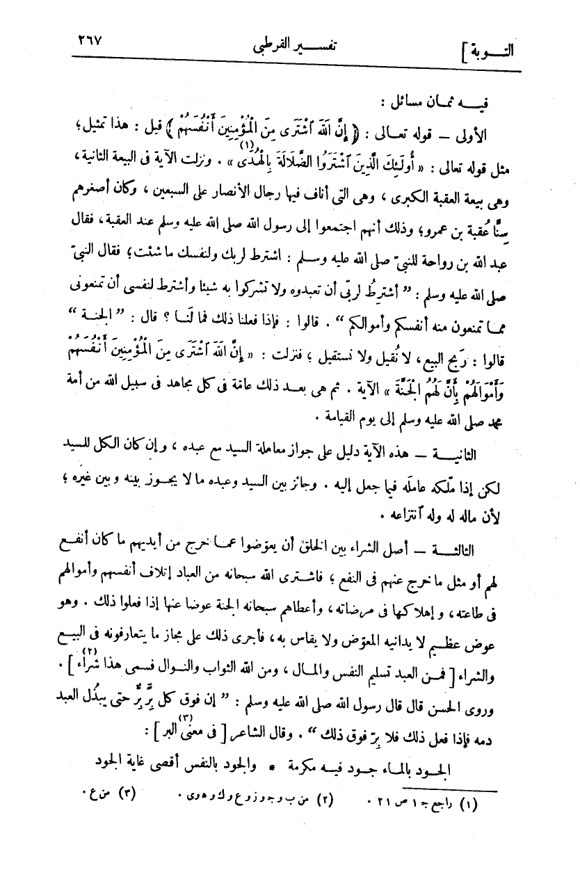 فِيهِ ثَمَانِ مَسَائِلَ: الْأُولَى- قَوْلُهُ تَعَالَى: (إِنَّ اللَّهَ اشْتَرى مِنَ الْمُؤْمِنِينَ أَنْفُسَهُمْ) قِيلَ: هَذَا تَمْثِيلٌ، مِثْلُ قَوْلُهُ تَعَالَى:" أُولئِكَ الَّذِينَ اشْتَرَوُا الضَّلالَةَ بِالْهُدى " «١» [البقرة: ١٦]. وَنَزَلَتِ الْآيَةُ فِي الْبَيْعَةِ الثَّانِيَةِ، وَهِيَ بَيْعَةُ الْعَقَبَةِ الْكُبْرَى، وَهِيَ الَّتِي أَنَافَ فِيهَا رِجَالُ الأنصار على السبعين، وكان أصغر هم سِنًّا عُقْبَةُ بْنُ عَمْرٍو، وَذَلِكَ أَنَّهُمُ اجْتَمَعُوا إِلَى رَسُولِ اللَّهِ صَلَّى اللَّهُ عَلَيْهِ وَسَلَّمَ عِنْدَ الْعَقَبَةِ، فَقَالَ عَبْدُ اللَّهِ بْنُ رَوَاحَةَ لِلنَّبِيِّ صَلَّى اللَّهُ عَلَيْهِ وَسَلَّمَ: اشْتَرِطْ لِرَبِّكَ وَلِنَفْسِكَ مَا شِئْتَ، فَقَالَ النَّبِيُّ صَلَّى اللَّهُ عَلَيْهِ وَسَلَّمَ: (أَشْتَرِطُ لِرَبِّي أَنْ تَعْبُدُوهُ وَلَا تُشْرِكُوا بِهِ شَيْئًا وَأَشْتَرِطُ لِنَفْسِيٍّ أَنْ تَمْنَعُونِي مِمَّا تَمْنَعُونَ مِنْهُ أَنْفُسَكُمْ وَأَمْوَالَكُمْ (. قَالُوا: فَإِذَا فَعَلْنَا ذَلِكَ فَمَا لَنَا؟ قَالَ:) الْجَنَّةُ) قَالُوا: رَبِحَ الْبَيْعُ، لَا نُقِيلُ وَلَا نَسْتَقِيلُ، فَنَزَلَتْ:" إِنَّ اللَّهَ اشْتَرى مِنَ الْمُؤْمِنِينَ أَنْفُسَهُمْ وَأَمْوالَهُمْ بِأَنَّ لَهُمُ الْجَنَّةَ" الْآيَةَ. ثُمَّ هِيَ بَعْدَ ذَلِكَ عَامَّةٌ فِي كُلِّ مُجَاهِدٍ فِي سَبِيلِ اللَّهِ مِنْ أُمَّةِ مُحَمَّدٍ صَلَّى اللَّهُ عَلَيْهِ وَسَلَّمَ إِلَى يَوْمِ الْقِيَامَةِ. الثَّانِيَةُ- هَذِهِ الْآيَةُ دَلِيلٌ عَلَى جَوَازِ مُعَامَلَةِ السَّيِّدِ مَعَ عَبْدِهِ، وَإِنْ كَانَ الْكُلُّ لِلسَّيِّدِ لَكِنْ إِذَا مَلَّكَهُ عَامِلَهُ فِيمَا جَعَلَ إِلَيْهِ. وَجَائِزٌ بَيْنَ السَّيِّدِ وَعَبْدِهِ مَا لَا يَجُوزُ بَيْنَهُ وَبَيْنَ غَيْرِهِ، لِأَنَّ مَالَهُ لَهُ وَلَهُ انْتِزَاعُهُ. الثَّالِثَةُ- أَصْلُ الشِّرَاءِ بَيْنَ الْخَلْقِ أَنْ يُعَوَّضُوا عَمَّا خَرَجَ مِنْ أَيْدِيهِمْ مَا كَانَ أَنْفَعَ لَهُمْ أَوْ مِثْلَ مَا خَرَجَ عَنْهُمْ فِي النَّفْعِ، فَاشْتَرَى اللَّهُ سُبْحَانَهُ مِنَ الْعِبَادِ إِتْلَافَ أَنْفُسِهِمْ وَأَمْوَالِهُمْ فِي طَاعَتِهِ، وَإِهْلَاكِهَا فِي مَرْضَاتِهِ، وَأَعْطَاهُمْ سُبْحَانَهُ الْجَنَّةَ عِوَضًا عَنْهَا إِذَا فَعَلُوا ذَلِكَ. وَهُوَ عِوَضٌ عَظِيمٌ لَا يُدَانِيهِ الْمُعَوَّضُ وَلَا يُقَاسَ بِهِ، فَأَجْرَى ذَلِكَ عَلَى مَجَازِ مَا يَتَعَارَفُونَهُ فِي الْبَيْعِ وَالشِّرَاءِ [فَمِنَ الْعَبْدِ تَسْلِيمُ النَّفْسِ وَالْمَالِ، وَمِنَ اللَّهِ الثَّوَابُ وَالنَّوَالُ فَسُمِّيَ هَذَا شِرَاءً «٢»]. وَرَوَى الْحَسَنِ قَالَ قَالَ رَسُولُ اللَّهِ صَلَّى اللَّهُ عَلَيْهِ وَسَلَّمَ: (إِنَّ فَوْقَ كُلِّ بِرٍّ بِرٌّ حَتَّى يَبْذُلَ الْعَبْدُ دَمَهُ فَإِذَا فَعَلَ ذَلِكَ فَلَا بِرَّ فَوْقَ ذَلِكَ). وَقَالَ الشَّاعِرُ [فِي مَعْنَى الْبِرِّ «٣»]: