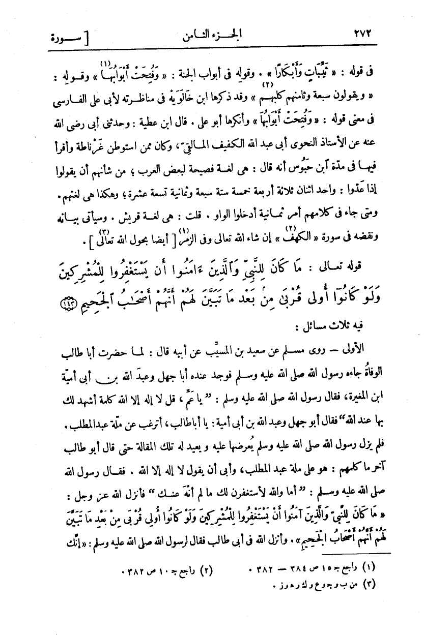 فِيهِ ثَلَاثُ مَسَائِلَ: الْأُولَى- رَوَى مُسْلِمٌ عَنْ سَعِيدِ بْنِ الْمُسَيَّبِ عَنْ أَبِيهِ قَالَ: لَمَّا حَضَرَتْ أَبَا طَالِبٍ الْوَفَاةُ جَاءَهُ رَسُولُ اللَّهِ صَلَّى اللَّهُ عَلَيْهِ وَسَلَّمَ فَوَجَدَ عِنْدَهُ أَبَا جَهْلٍ وعبد الله بن أبي أمية ابن الْمُغِيرَةِ، فَقَالَ رَسُولُ اللَّهِ صَلَّى اللَّهُ عَلَيْهِ وَسَلَّمَ: (يَا عَمُّ قُلْ لَا إِلَهَ إِلَّا اللَّهُ كَلِمَةً أَشْهَدُ لَكَ بِهَا عِنْدَ اللَّهِ) فقال أَبُو جَهْلٍ وَعَبْدُ اللَّهِ بْنُ أَبِي أُمَيَّةَ: يَا أَبَا طَالِبٍ أَتَرْغَبُ عَنْ مِلَّةِ عَبْدِ الْمُطَّلِبِ. فَلَمْ يَزَلْ رَسُولُ اللَّهِ صَلَّى اللَّهُ عَلَيْهِ وَسَلَّمَ يَعْرِضُهَا عَلَيْهِ وَيُعِيدُ لَهُ تِلْكَ الْمَقَالَةَ حَتَّى قَالَ أَبُو طَالِبٍ آخِرَ مَا كَلَّمَهُمْ: هُوَ عَلَى مِلَّةِ عَبْدِ الْمُطَّلِبِ وَأَبَى أَنْ يَقُولَ لَا إِلَهَ إِلَّا اللَّهِ. فَقَالَ رَسُولُ اللَّهِ صَلَّى اللَّهُ عَلَيْهِ وَسَلَّمَ: (أَمَا وَاللَّهِ لَأَسْتَغْفِرَنَّ لَكَ مَا لَمْ أُنْهَ عَنْكَ) فَأَنْزَلَ اللَّهُ عَزَّ وَجَلَّ:" مَا كانَ لِلنَّبِيِّ وَالَّذِينَ آمَنُوا أَنْ يَسْتَغْفِرُوا لِلْمُشْرِكِينَ وَلَوْ كانُوا أُولِي قُرْبى مِنْ بَعْدِ مَا تَبَيَّنَ لَهُمْ أَنَّهُمْ أَصْحابُ الْجَحِيمِ" وَأَنْزَلَ اللَّهُ فِي أَبِي طَالِبٍ فَقَالَ لِرَسُولِ اللَّهِ صَلَّى اللَّهُ عَلَيْهِ وَسَلَّمَ: