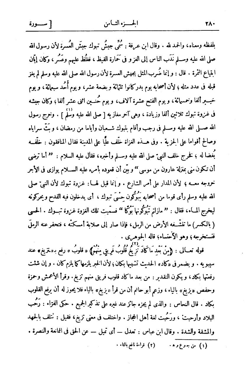 بِلَفْظِهِ وَمَعْنَاهُ، وَالْحَمْدُ لِلَّهِ. وَقَالَ ابْنُ عَرَفَةَ: سُمِّيَ جَيْشُ تَبُوكَ جَيْشَ الْعُسْرَةِ لِأَنَّ رَسُولَ اللَّهِ صَلَّى اللَّهُ عَلَيْهِ وَسَلَّمَ نَدَبَ النَّاسَ إِلَى الْغَزْوِ فِي حَمَارَةِ الْقَيْظِ، فَغَلُظَ عَلَيْهِمْ وَعَسُرَ، وَكَانَ إِبَّانَ ابْتِيَاعِ الثَّمَرَةِ. قَالَ: وَإِنَّمَا ضُرِبَ الْمَثَلُ بِجَيْشِ الْعُسْرَةِ لِأَنَّ رَسُولَ اللَّهِ صَلَّى اللَّهُ عَلَيْهِ وَسَلَّمَ لَمْ يَغْزُ قَبْلَهُ فِي عَدَدٍ مِثْلِهِ لِأَنَّ أَصْحَابَهُ يَوْمَ بَدْرٍ كَانُوا ثَلَاثَمِائَةٍ وَبِضْعَةَ عَشَرَ وَيَوْمَ أُحُدٍ سَبْعَمِائَةٍ وَيَوْمَ خَيْبَرَ أَلْفًا وَخَمْسَمِائَةٍ وَيَوْمَ الْفَتْحِ عَشَرَةَ آلَافٍ وَيَوْمَ حُنَيْنٍ اثْنَيْ عَشَرَ أَلْفًا وَكَانَ جَيْشُهُ فِي غَزْوَةِ تَبُوكَ ثَلَاثِينَ أَلْفًا وَزِيَادَةً، وَهِيَ آخِرُ مَغَازِيهِ [صَلَّى اللَّهُ عَلَيْهِ وَسَلَّمَ «١»]. وَخَرَجَ رَسُولُ اللَّهِ صَلَّى اللَّهُ عَلَيْهِ وَسَلَّمَ فِي رَجَبٍ وَأَقَامَ بِتَبُوكَ شَعْبَانَ وَأَيَّامًا مِنْ رَمَضَانَ وَبَثَّ سَرَايَاهُ وَصَالَحَ أَقْوَامًا عَلَى الْجِزْيَةِ. وَفِي هَذِهِ الْغَزَاةِ خَلَّفَ عَلِيًّا عَلَى الْمَدِينَةِ فَقَالَ الْمُنَافِقُونَ: خَلَّفَهُ بُغْضًا لَهُ، فَخَرَجَ خَلْفَ النَّبِيِّ صَلَّى اللَّهُ عَلَيْهِ وَسَلَّمَ وَأَخْبَرَهُ فَقَالَ عَلَيْهِ السَّلَامُ: (أَمَا تَرْضَى أَنْ تَكُونَ مِنِّي بِمَنْزِلَةِ هَارُونَ مِنْ مُوسَى) وَبَيَّنَ أَنَّ قُعُودَهُ بِأَمْرِهِ عَلَيْهِ السَّلَامُ يُوَازِي فِي الْأَجْرِ خُرُوجَهُ مَعَهُ لِأَنَّ الْمَدَارَ عَلَى أَمْرِ الشَّارِعِ. وَإِنَّمَا قِيلَ لَهَا: غَزْوَةُ تَبُوكَ لِأَنَّ النَّبِيَّ صَلَّى اللَّهُ عَلَيْهِ وَسَلَّمَ رَأَى قَوْمًا مِنْ أَصْحَابِهِ يَبُوكُونَ حِسْيِ تَبُوكَ أَيْ يُدْخِلُونَ فِيهِ الْقَدَحَ وَيُحَرِّكُونَهُ لِيَخْرُجَ الْمَاءُ، فَقَالَ: (مَا زِلْتُمْ تَبُوكُونَهَا بَوْكًا) فَسُمِّيَتْ تِلْكَ الْغَزْوَةُ غَزْوَةَ تَبُوكَ. الْحِسْيُ (بِالْكَسْرِ) مَا تُنَشِّفُهُ الْأَرْضُ مِنَ الرَّمَلِ فَإِذَا صَارَ إِلَى صَلَابَةٍ أَمْسَكَتْهُ فَتَحْفِرُ عَنْهُ الرَّمَلَ فَتَسْتَخْرِجُهُ وَهُوَ الِاحْتِسَاءُ قَالَهُ الْجَوْهَرِيُّ. قَوْلُهُ تَعَالَى: (مِنْ بَعْدِ مَا كادَ يَزِيغُ «٢» قُلُوبُ فَرِيقٍ مِنْهُمْ) " قُلُوبُ" رُفِعَ بِ"- تَزِيغُ" عِنْدَ سِيبَوَيْهِ. وَيُضْمَرُ فِي" كادَ" الْحَدِيثُ تَشْبِيهًا بِكَانَ، لِأَنَّ الْخَبَرَ يَلْزَمُهَا كَمَا يَلْزَمُ كَانَ. وَإِنْ شِئْتَ رَفَعْتَهَا بِكَادَ، وَيَكُونُ التَّقْدِيرُ: مِنْ بَعْدِ مَا كاد قُلُوبُ فَرِيقٍ مِنْهُمْ تَزِيغُ. وَقَرَأَ الْأَعْمَشُ وَحَمْزَةُ وَحَفْصٌ" يَزِيغُ" بِالْيَاءِ، وَزَعَمَ أَبُو حَاتِمٍ أَنَّ مَنْ قَرَأَ" يَزِيغُ" بِالْيَاءِ فَلَا يَجُوزُ لَهُ أن يرفع القلوب بكاد. قال النحاس: والذي لَمْ يُجِزْهِ جَائِزٌ عِنْدَ غَيْرِهِ عَلَى تَذْكِيرِ الْجَمِيعِ. حَكَى الْفَرَّاءُ: رَحُبَ الْبِلَادُ وَأَرْحَبَتْ، وَرَحُبَتْ لُغَةُ أَهْلِ الْحِجَازِ. وَاخْتُلِفَ فِي مَعْنَى تَزِيغُ، فَقِيلَ: تَتْلَفُ بِالْجَهْدِ وَالْمَشَقَّةِ وَالشِّدَّةِ. وَقَالَ ابْنُ عَبَّاسٍ: تَعْدِلُ- أَيْ تَمِيلُ- عَنِ الْحَقِّ فِي الممانعة والنصرة.