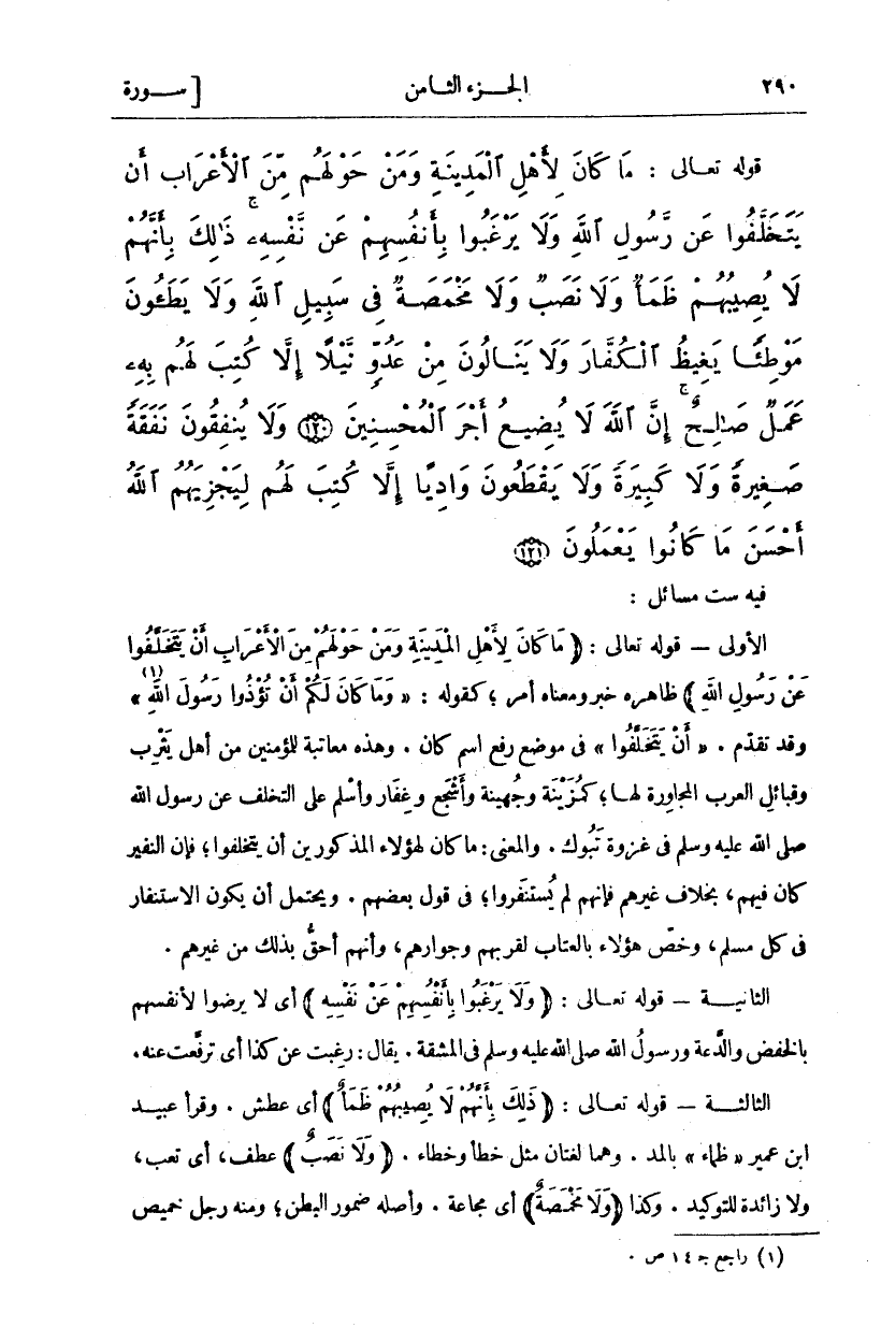 فِيهِ سِتُّ مَسَائِلَ: الْأُولَى- قَوْلُهُ تَعَالَى: (مَا كانَ لِأَهْلِ الْمَدِينَةِ وَمَنْ حَوْلَهُمْ مِنَ الْأَعْرابِ أَنْ يَتَخَلَّفُوا عَنْ رَسُولِ اللَّهِ) ظَاهِرُهُ خَبَرٌ وَمَعْنَاهُ أَمْرٌ، كَقَوْلِهِ:" وَما كانَ لَكُمْ أَنْ تُؤْذُوا رَسُولَ اللَّهِ" «١» [الأحزاب: ٣٥] وَقَدْ تَقَدَّمَ." أَنْ يَتَخَلَّفُوا" فِي مَوْضِعِ رَفْعِ اسْمِ كَانَ. وَهَذِهِ مُعَاتَبَةٌ لِلْمُؤْمِنِينَ مِنْ أَهْلِ يَثْرِبَ وَقَبَائِلِ الْعَرَبِ الْمُجَاوِرَةِ لَهَا، كَمُزَيْنَةَ وَجُهَيْنَةَ وَأَشْجَعَ وَغِفَارٍ وَأَسْلَمَ عَلَى التَّخَلُّفِ عَنْ رَسُولِ اللَّهِ صَلَّى اللَّهُ عَلَيْهِ وَسَلَّمَ في غزوة تَبُوكَ. وَالْمَعْنَى: مَا كَانَ لِهَؤُلَاءِ الْمَذْكُورِينَ أَنْ يَتَخَلَّفُوا، فَإِنَّ النَّفِيرَ كَانَ فِيهِمْ، بِخِلَافِ غَيْرِهِمْ فَإِنَّهُمْ لَمْ يُسْتَنْفَرُوا، فِي قَوْلِ بَعْضِهِمْ. وَيَحْتَمِلُ أَنْ يَكُونَ الِاسْتِنْفَارُ فِي كُلِّ مُسْلِمٍ، وَخَصَّ هؤلاء بالعتاب لقربهم وجوار هم، وأنهم أحق بذلك من غير هم. الثَّانِيَةُ- قَوْلُهُ تَعَالَى: (وَلا يَرْغَبُوا بِأَنْفُسِهِمْ عَنْ نَفْسِهِ) أَيْ لَا يَرْضُوَا لِأَنْفُسِهِمْ بِالْخَفْضِ وَالدَّعَةِ وَرَسُولُ اللَّهِ صَلَّى اللَّهُ عَلَيْهِ وَسَلَّمَ فِي الْمَشَقَّةِ. يُقَالُ: رَغِبْتُ عَنْ كَذَا أَيْ تَرَفَّعْتُ عَنْهُ. الثَّالِثَةُ- قَوْلُهُ تَعَالَى (ذلِكَ بِأَنَّهُمْ لَا يُصِيبُهُمْ ظَمَأٌ) أي عطش. وقرا عبيد ابن عُمَيْرٍ" ظَمَاءٌ" بِالْمَدِّ. وَهُمَا لُغَتَانِ مِثْلُ خَطَأٍ وخطاء. (وَلا نَصَبٌ) عطف، أي تعب، ولا زَائِدَةٌ لِلتَّوْكِيدِ. وَكَذَا (وَلا مَخْمَصَةٌ) أَيْ مَجَاعَةٌ. وأصله ضمور البطن، ومنه رجل خميص