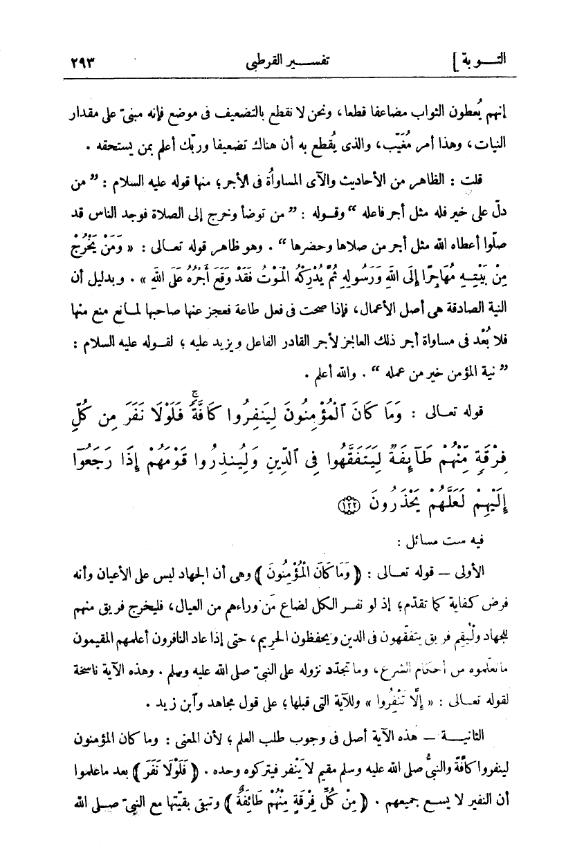 فيه ست مسائل: الاولى- قوله تعالى: (وَما كانَ الْمُؤْمِنُونَ) هي أَنَّ الْجِهَادَ لَيْسَ عَلَى الْأَعْيَانِ وَأَنَّهُ فَرْضُ كِفَايَةٍ كَمَا تَقَدَّمَ، إِذْ لَوْ نَفَرَ الْكُلُّ لَضَاعَ مَنْ وَرَاءَهُمْ مِنَ الْعِيَالِ، فَلْيَخْرُجْ فَرِيقٌ مِنْهُمْ لِلْجِهَادِ وَلْيُقِمْ فَرِيقٌ يَتَفَقَّهُونَ فِي الدِّينِ وَيَحْفَظُونَ الْحَرِيمَ، حَتَّى إِذَا عَادَ النَّافِرُونَ أَعْلَمَهُمُ الْمُقِيمُونَ مَا تَعَلَّمُوهُ مِنْ أَحْكَامِ الشَّرْعِ، وَمَا تجدد نزول عَلَى النَّبِيِّ صَلَّى اللَّهُ عَلَيْهِ وَسَلَّمَ. وَهَذِهِ الآية ناسخة لقوله تعالى:" إِلَّا تَنْفِرُوا" [التوبة: ٣٩] وَلِلْآيَةِ الَّتِي قَبْلَهَا، عَلَى قَوْلِ مُجَاهِدٍ وَابْنِ زَيْدٍ. الثَّانِيَةُ- هَذِهِ الْآيَةُ أَصْلٌ فِي وُجُوبِ طَلَبِ الْعِلْمِ، لِأَنَّ الْمَعْنَى: وَمَا كَانَ الْمُؤْمِنُونَ لِيَنْفِرُوا كَافَّةً وَالنَّبِيُّ صَلَّى اللَّهُ عَلَيْهِ وَسَلَّمَ مقيم لا ينفر فيتركوه وحده." فَلَوْلا نَفَرَ" بعد ما عَلِمُوا أَنَّ النَّفِيرَ لَا يَسَعُ جَمِيعَهُمْ." مِنْ كُلِّ فِرْقَةٍ مِنْهُمْ طائِفَةٌ" وَتَبْقَى بَقِيَّتُهَا مَعَ النَّبِيِّ صَلَّى اللَّهُ