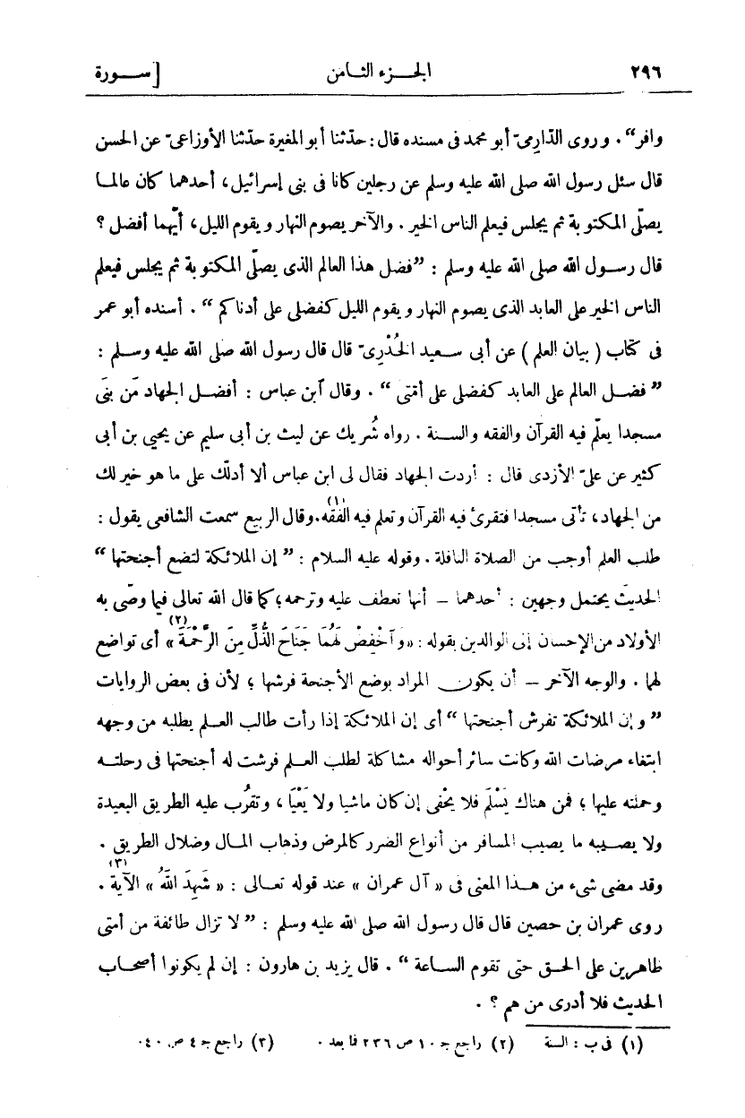 وَافِرٍ (. وَرَوَى الدَّارِمِيُّ أَبُو مُحَمَّدٍ فِي مُسْنَدِهِ قَالَ: حَدَّثَنَا أَبُو الْمُغِيرَةِ حَدَّثَنَا الْأَوْزَاعِيُّ عَنِ الْحَسَنِ قَالَ سُئِلَ رَسُولُ اللَّهِ صَلَّى اللَّهُ عَلَيْهِ وَسَلَّمَ عَنْ رَجُلَيْنِ كَانَا فِي بَنِي إِسْرَائِيلَ، أَحَدُهُمَا كَانَ عَالِمًا يُصَلِّي الْمَكْتُوبَةَ ثُمَّ يَجْلِسُ فَيُعَلِّمُ النَّاسَ الْخَيْرَ. وَالْآخَرُ يَصُومُ النَّهَارَ وَيَقُومُ اللَّيْلَ، أَيُّهُمَا أَفْضَلُ؟ قَالَ رَسُولُ اللَّهِ صَلَّى اللَّهُ عَلَيْهِ وَسَلَّمَ: (فَضْلُ هَذَا الْعَالِمِ الَّذِي يُصَلِّي الْمَكْتُوبَةَ ثُمَّ يَجْلِسُ فَيُعَلِّمُ النَّاسَ الْخَيْرَ عَلَى الْعَابِدِ الَّذِي يَصُومُ النَّهَارَ وَيَقُومُ اللَّيْلَ كَفَضْلِي عَلَى أَدْنَاكُمْ (. أَسْنَدَهُ أَبُو عُمَرَ فِي كِتَابِ (بَيَانُ الْعِلْمِ) عَنْ أَبِي سَعِيدٍ الْخُدْرِيِّ قَالَ قَالَ رَسُولُ اللَّهِ صَلَّى اللَّهُ عَلَيْهِ وَسَلَّمَ: (فَضْلُ الْعَالِمِ عَلَى الْعَابِدِ كَفَضْلِي عَلَى أُمَّتِي). وَقَالَ ابْنُ عَبَّاسٍ: أَفْضَلُ الْجِهَادِ مَنْ بَنَى مَسْجِدًا يُعَلِّمُ فِيهِ الْقُرْآنَ وَالْفِقْهَ وَالسُّنَّةَ. رَوَاهُ شَرِيكٌ عَنْ لَيْثِ بْنِ أَبِي سُلَيْمٍ عَنْ يَحْيَى بْنِ أَبِي كَثِيرٍ عَنْ عَلِيٍّ الْأَزْدِيِّ قَالَ: أَرَدْتُ الْجِهَادَ فَقَالَ لِي ابْنُ عَبَّاسٍ أَلَا أَدُلُّكَ عَلَى مَا هُوَ خير لك من الجهاد، تأتي مسجدا فتقرى فِيهِ الْقُرْآنَ وَتُعَلِّمُ فِيهِ الْفِقْهَ «١». وَقَالَ الرَّبِيعُ سَمِعْتُ الشَّافِعِيَّ يَقُولُ: طَلَبُ الْعِلْمِ أَوْجَبُ مِنَ الصَّلَاةِ النَّافِلَةِ. وَقَوْلُهُ عَلَيْهِ السَّلَامُ: (إِنَّ الْمَلَائِكَةَ لَتَضَعُ أَجْنِحَتَهَا) الْحَدِيثَ يَحْتَمِلُ وَجْهَيْنِ: أَحَدُهُمَا- أَنَّهَا تَعْطِفُ عَلَيْهِ وَتَرْحَمُهُ، كَمَا قَالَ اللَّهُ تَعَالَى فِيمَا وَصَّى بِهِ الْأَوْلَادَ مِنَ الْإِحْسَانِ إِلَى الْوَالِدَيْنِ بِقَوْلِهِ:" وَاخْفِضْ لَهُما جَناحَ الذُّلِّ مِنَ الرَّحْمَةِ" «٢» [الاسراء: ٢٤] أَيْ تَوَاضَعْ لَهُمَا. وَالْوَجْهُ الْآخَرُ- أَنْ يَكُونَ الْمُرَادُ بِوَضْعِ الْأَجْنِحَةِ فَرْشَهَا، لِأَنَّ فِي بَعْضِ الرِّوَايَاتِ (وَإِنَّ الْمَلَائِكَةَ تَفْرِشُ أَجْنِحَتَهَا) أَيْ إِنَّ الْمَلَائِكَةَ إِذَا رَأَتْ طَالِبَ الْعِلْمِ يَطْلُبُهُ مِنْ وجهه ابتغاء مرضات اللَّهِ وَكَانَتْ سَائِرُ أَحْوَالِهِ مُشَاكِلَةً لِطَلَبِ الْعِلْمِ فَرَشَتْ لَهُ أَجْنِحَتَهَا فِي رِحْلَتِهِ وَحَمَلَتْهُ عَلَيْهَا، فَمِنْ هُنَاكَ يَسْلَمُ فَلَا يَحْفَى إِنْ كَانَ مَاشِيًا وَلَا يَعْيَا، وَتُقَرِّبُ عَلَيْهِ الطَّرِيقَ الْبَعِيدَةَ وَلَا يُصِيبُهُ مَا يُصِيبُ الْمُسَافِرَ مِنْ أَنْوَاعِ الضَّرَرِ كَالْمَرَضِ وَذَهَابِ الْمَالِ وَضَلَالِ الطَّرِيقِ. وَقَدْ مضى شي مِنْ هَذَا الْمَعْنَى فِي [آلِ عِمْرَانَ] عِنْدَ قَوْلِهِ تَعَالَى:" شَهِدَ اللَّهُ" الْآيَةَ «٣». رَوَى عِمْرَانُ بْنُ حُصَيْنٍ قَالَ قَالَ رَسُولُ اللَّهِ صَلَّى اللَّهُ عَلَيْهِ وَسَلَّمَ (لَا تَزَالُ طَائِفَةٌ مِنْ أُمَّتِي ظَاهِرِينَ عَلَى الْحَقِّ حَتَّى تَقُومَ السَّاعَةُ). قَالَ يَزِيدُ بْنُ هَارُونَ: إِنْ لَمْ يَكُونُوا أصحاب الحديث فلا أدري من هم؟.