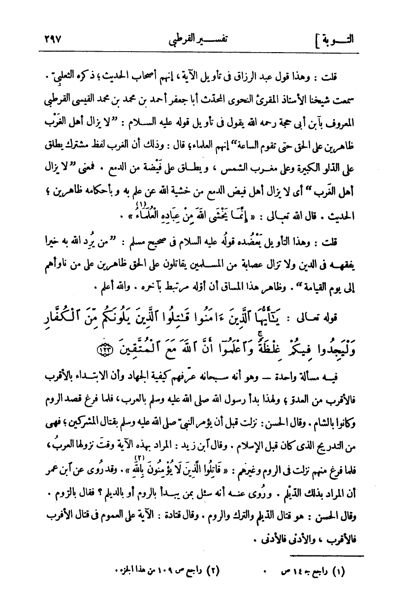 قُلْتُ: وَهَذَا قَوْلُ عَبْدِ الرَّزَّاقِ فِي تَأْوِيلِ الْآيَةِ، إِنَّهُمْ أَصْحَابُ الْحَدِيثِ، ذَكَرَهُ الثَّعْلَبِيُّ. سَمِعْتُ شَيْخَنَا الْأُسْتَاذَ الْمُقْرِئَ النَّحْوِيَّ الْمُحَدِّثَ أَبَا جَعْفَرٍ أَحْمَدُ بْنُ مُحَمَّدِ بْنِ مُحَمَّدِ الْقَيْسِيُّ الْقُرْطُبِيَّ الْمَعْرُوفَ بِابْنِ أَبِي حَجَّةَ رَحِمَهُ اللَّهُ يَقُولُ فِي تَأْوِيلِ قَوْلِهِ عَلَيْهِ السَّلَامُ: (لَا يَزَالُ أَهْلُ الْغَرْبِ ظَاهِرِينَ عَلَى الْحَقِّ حَتَّى تَقُومَ السَّاعَةُ) إِنَّهُمُ الْعُلَمَاءُ، قَالَ: وَذَلِكَ أَنَّ الْغَرْبَ لَفْظٌ مُشْتَرَكٌ يُطْلَقُ عَلَى الدَّلْوِ الْكَبِيرَةِ وَعَلَى مَغْرِبِ الشَّمْسِ، وَيُطْلَقُ عَلَى فَيْضَةٍ مِنَ الدَّمْعِ. فَمَعْنَى (لَا يَزَالُ أَهْلُ الْغَرْبِ) أَيْ لَا يَزَالُ أَهْلُ فَيْضِ الدَّمْعِ مِنْ خَشْيَةِ اللَّهِ عَنْ عِلْمٍ بِهِ وَبِأَحْكَامِهِ ظَاهِرِينَ، الْحَدِيثَ. قَالَ اللَّهُ تَعَالَى:" إِنَّما يَخْشَى اللَّهَ مِنْ عِبادِهِ الْعُلَماءُ" «١» [فاطر: ٢٨]. قُلْتُ: وَهَذَا التَّأْوِيلُ يَعْضُدُهُ قَوْلُهُ عَلَيْهِ السَّلَامُ فِي صَحِيحِ مُسْلِمٍ: (مَنْ يُرِدِ اللَّهُ بِهِ خَيْرًا يُفَقِّهْهُ فِي الدِّينِ وَلَا تَزَالُ عِصَابَةٌ مِنَ الْمُسْلِمِينَ يُقَاتِلُونَ عَلَى الْحَقِّ ظَاهِرِينَ عَلَى مَنْ نَاوَأَهُمْ إِلَى يَوْمِ الْقِيَامَةِ (. وَظَاهِرُ هَذَا الْمَسَاقِ أَنَّ أَوَّلَهُ مُرْتَبِطٌ بِآخِرِهِ. وَاللَّهُ أَعْلَمُ.