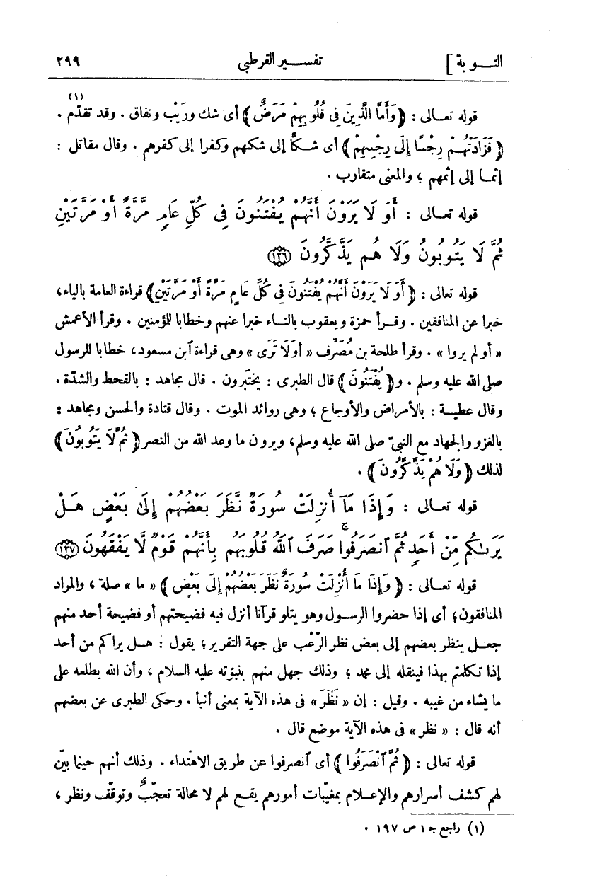 قَوْلُهُ تَعَالَى. (أَوَلا يَرَوْنَ أَنَّهُمْ يُفْتَنُونَ فِي كُلِّ عامٍ مَرَّةً أَوْ مَرَّتَيْنِ) قِرَاءَةُ الْعَامَّةِ بِالْيَاءِ، خَبَرًا عَنِ الْمُنَافِقِينَ. وَقَرَأَ حَمْزَةُ وَيَعْقُوبُ بِالتَّاءِ خَبَرًا عَنْهُمْ وَخِطَابًا لِلْمُؤْمِنِينَ. وقرا الأعمش" أو لم يَرَوْا". وَقَرَأَ طَلْحَةُ بْنُ مُصَرِّفٍ" أَوَلَا تَرَى" وَهِيَ قِرَاءَةُ ابْنِ مَسْعُودٍ، خِطَابًا لِلرَّسُولِ صَلَّى اللَّهُ عَلَيْهِ وَسَلَّمَ. وَ" يُفْتَنُونَ" قَالَ الطَّبَرِيُّ: يُخْتَبَرُونَ. قَالَ مُجَاهِدٌ: بِالْقَحْطِ وَالشِّدَّةِ. وَقَالَ عَطِيَّةُ: بِالْأَمْرَاضِ وَالْأَوْجَاعِ، وَهِيَ رَوَائِدُ الْمَوْتِ. وَقَالَ قَتَادَةُ وَالْحَسَنُ وَمُجَاهِدٌ: بِالْغَزْوِ وَالْجِهَادِ مَعَ النَّبِيِّ صَلَّى اللَّهُ عَلَيْهِ وَسَلَّمَ، وَيَرَوْنَ مَا وَعَدَ اللَّهُ مِنَ النَّصْرِ" ثُمَّ لَا يَتُوبُونَ" لِذَلِكَ" وَلا هُمْ يَذَّكَّرُونَ".