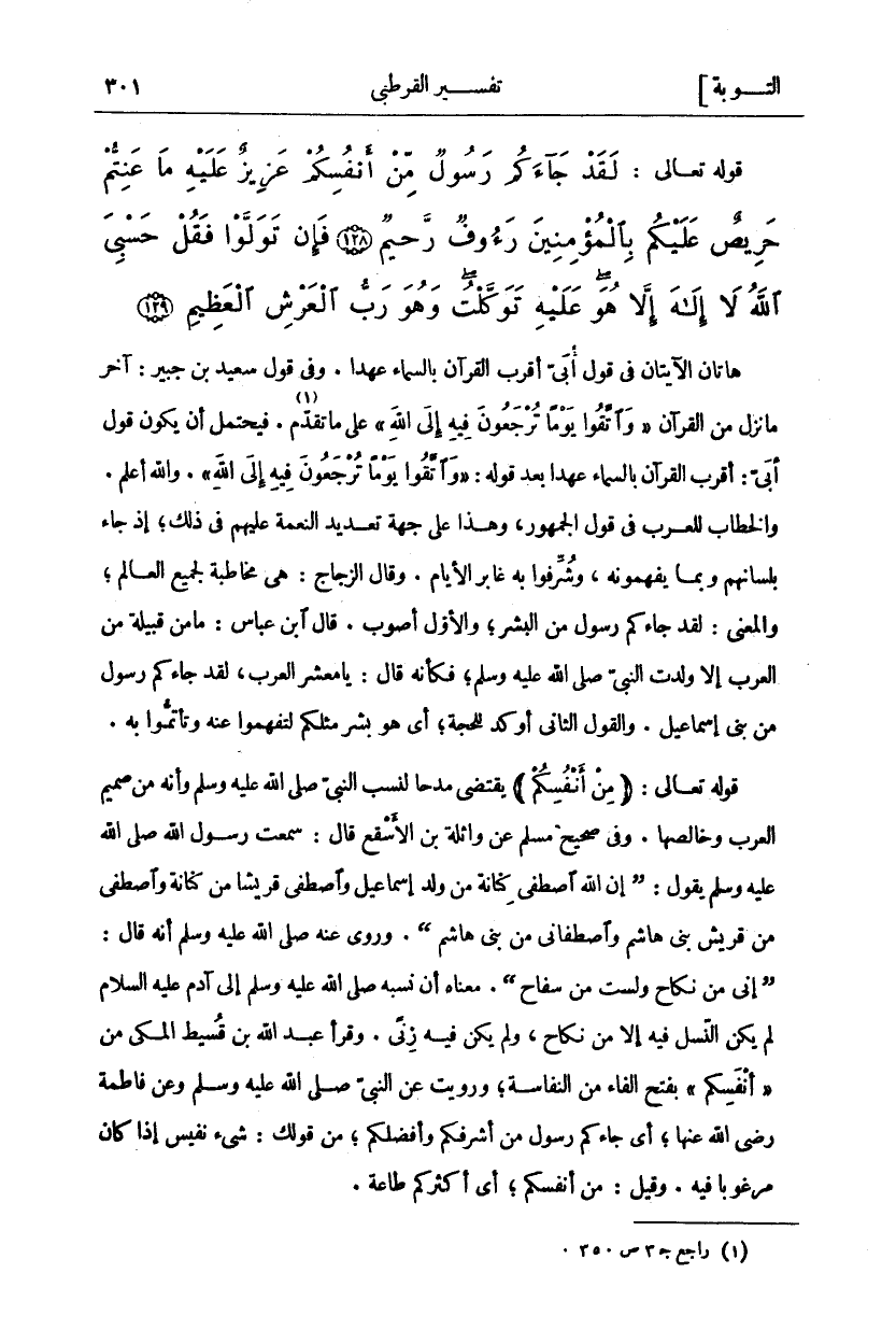 هَاتَانِ الْآيَتَانِ فِي قَوْلِ أُبَيٍّ أَقْرَبُ الْقُرْآنِ بِالسَّمَاءِ عَهْدًا. وَفِي قَوْلِ سَعِيدِ بْنِ جُبَيْرٍ: آخَرُ مَا نَزَلَ مِنَ الْقُرْآنِ" وَاتَّقُوا يَوْماً تُرْجَعُونَ فِيهِ إِلَى اللَّهِ" [البقرة: ٢٨١] عَلَى مَا تَقَدَّمَ «١». فَيَحْتَمِلُ أَنْ يَكُونَ قَوْلُ أُبَيٍّ: أَقْرَبُ الْقُرْآنِ بِالسَّمَاءِ عَهْدًا بَعْدَ قَوْلِهِ:" وَاتَّقُوا يَوْماً تُرْجَعُونَ فِيهِ إِلَى اللَّهِ". وَاللَّهُ أَعْلَمُ. وَالْخِطَابُ لِلْعَرَبِ فِي قَوْلِ الْجُمْهُورِ، وَهَذَا عَلَى جِهَةِ تَعْدِيدِ النِّعْمَةِ عَلَيْهِمْ فِي ذَلِكَ، إِذْ جَاءَ بِلِسَانِهِمْ وَبِمَا يَفْهَمُونَهُ، وَشَرُفُوا بِهِ غَابِرَ الْأَيَّامِ. وَقَالَ الزَّجَّاجُ: هِيَ مُخَاطَبَةٌ لِجَمِيعِ الْعَالَمِ وَالْمَعْنَى: لَقَدْ جَاءَكُمْ رَسُولٌ مِنَ الْبَشَرِ، وَالْأَوَّلُ أَصْوَبُ. قَالَ ابْنُ عَبَّاسٍ: مَا مِنْ قَبِيلَةٍ مِنَ الْعَرَبِ إِلَّا وَلَدَتِ النَّبِيَّ صَلَّى اللَّهُ عَلَيْهِ وَسَلَّمَ فَكَأَنَّهُ قَالَ: يَا مَعْشَرَ الْعَرَبِ لَقَدْ جَاءَكُمْ رَسُولٌ مِنْ بَنِي إِسْمَاعِيلَ. وَالْقَوْلُ الثَّانِي أَوْكَدُ لِلْحُجَّةِ أَيْ هُوَ بَشَرٌ مِثْلُكُمْ لِتَفْهَمُوا عَنْهُ وَتَأْتَمُّوا بِهِ. قَوْلُهُ تَعَالَى:" مِنْ أَنْفُسِكُمْ" يَقْتَضِي مَدْحًا لِنَسَبِ النَّبِيِّ صَلَّى اللَّهُ عَلَيْهِ وَسَلَّمَ وَأَنَّهُ مِنْ صَمِيمِ الْعَرَبِ وَخَالِصِهَا. وَفِي صَحِيحِ مُسْلِمٍ عَنْ وَاثِلَةَ بْنِ الْأَسْقَعِ قَالَ: سَمِعْتُ رَسُولَ اللَّهِ صَلَّى اللَّهُ عَلَيْهِ وَسَلَّمَ يَقُولُ: (إِنَّ اللَّهَ اصْطَفَى كِنَانَةَ مِنْ وَلَدِ إِسْمَاعِيلَ وَاصْطَفَى قُرَيْشًا مِنْ كِنَانَةَ وَاصْطَفَى مِنْ قُرَيْشٍ بَنِي هَاشِمٍ وَاصْطَفَانِي مِنْ بَنِي هَاشِمٍ). وَرُوِيَ عَنْهُ صَلَّى اللَّهُ عَلَيْهِ وَسَلَّمَ أَنَّهُ قَالَ: (إِنِّي مِنْ نِكَاحٍ وَلَسْتُ مِنْ سِفَاحٍ). مَعْنَاهُ أَنَّ نَسَبَهُ صَلَّى اللَّهُ عَلَيْهِ وَسَلَّمَ إِلَى آدَمَ عَلَيْهِ السَّلَامُ لَمْ يَكُنِ النَّسْلُ فِيهِ إِلَّا مِنْ نِكَاحٍ وَلَمْ يكن فيه زنى. وَقَرَأَ عَبْدُ اللَّهِ بْنُ قُسَيْطٍ الْمَكِّيُّ مِنْ" أَنْفُسِكُمْ" بِفَتْحِ الْفَاءِ مِنَ النِّفَاسَةِ، وَرُوِيَتْ عَنِ النَّبِيِّ صَلَّى اللَّهُ عَلَيْهِ وَسَلَّمَ وَعَنْ فَاطِمَةَ رَضِيَ اللَّهُ عَنْهَا أَيْ جَاءَكُمْ رَسُولٌ مِنْ أشرفكم وأفضلكم من قولك: شي نَفِيسٌ إِذَا كَانَ مَرْغُوبًا فِيهِ. وَقِيلَ: مِنْ أنفسكم أي أكثر كم طاعة.