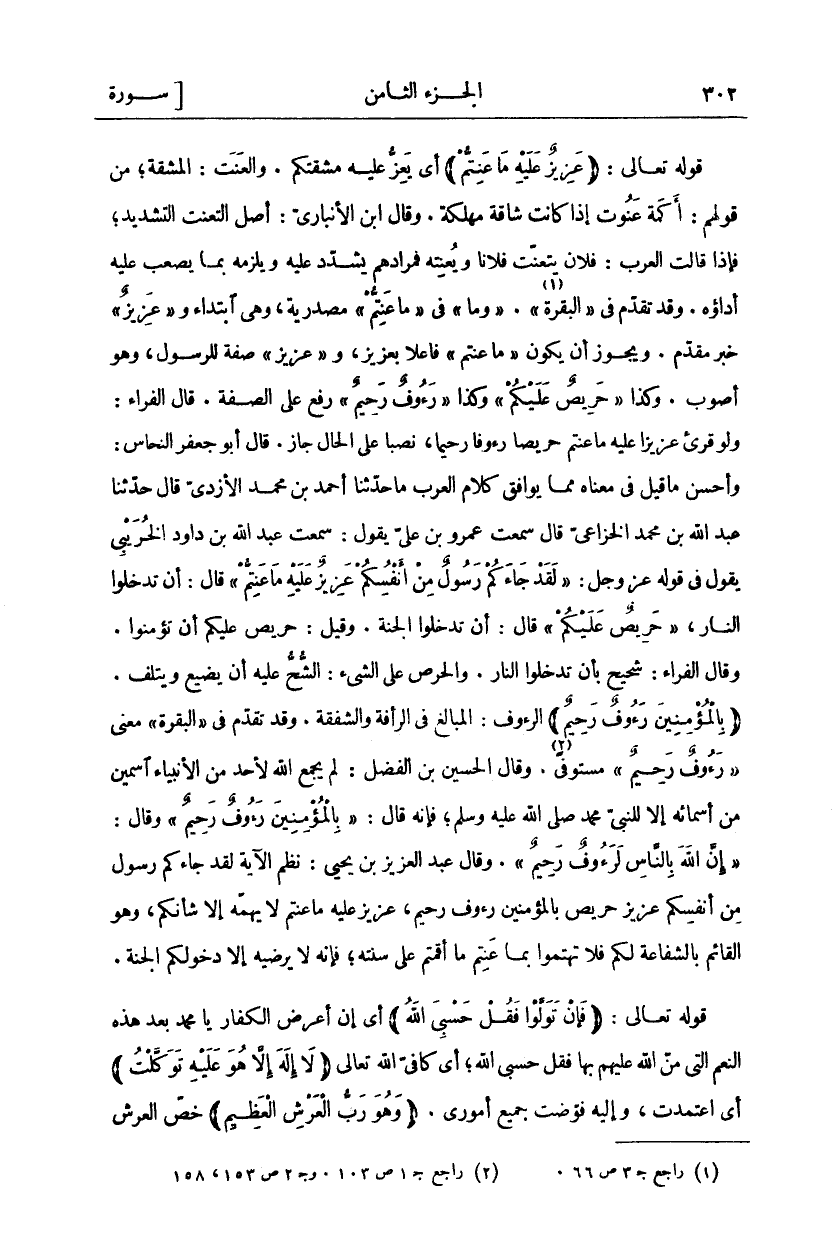 قَوْلُهُ تَعَالَى: (عَزِيزٌ عَلَيْهِ مَا عَنِتُّمْ) أَيْ يَعِزُّ عَلَيْهِ مَشَقَّتُكُمْ. وَالْعَنَتُ: الْمَشَقَّةُ، مِنْ قَوْلِهِمْ: أَكَمَةٌ عَنُوتٌ إِذَا كَانَتْ شَاقَّةً مُهْلِكَةً. وَقَالَ ابْنُ الْأَنْبَارِيِّ: أَصْلُ التَّعَنُّتِ التَّشْدِيدُ، فَإِذَا قَالَتِ الْعَرَبُ: فُلَانٌ يَتَعَنَّتُ فُلَانًا وَيُعْنِتُهُ فَمُرَادُهُمْ يُشَدِّدُ عَلَيْهِ وَيُلْزِمُهُ بِمَا يَصْعُبُ عَلَيْهِ أَدَاؤُهُ. وَقَدْ تَقَدَّمَ فِي [الْبَقَرَةِ «١»]. وَ" مَا" فِي" مَا عَنِتُّمْ" مَصْدَرِيَّةٌ، وَهِيَ ابْتِدَاءٌ وَ" عَزِيزٌ" خَبَرٌ مُقَدَّمٌ. وَيَجُوزُ أَنْ يَكُونَ" مَا عَنِتُّمْ" فَاعِلًا بِعَزِيزٍ، وَ" عَزِيزٌ" صِفَةٌ لِلرَّسُولِ، وَهُوَ أَصْوَبُ. وكذا" حَرِيصٌ عَلَيْكُمْ" وكذا" رَؤُفٌ رَحِيمٌ" رُفِعَ عَلَى الصِّفَةِ. قَالَ الْفَرَّاءُ: وَلَوْ قُرِئَ عَزِيزًا عَلَيْهِ مَا عَنِتُّمْ حَرِيصًا رَءُوفًا رَحِيمًا، نَصْبًا عَلَى الْحَالِ جَازَ. قَالَ أَبُو جَعْفَرٍ النَّحَّاسُ: وَأَحْسَنَ مَا قِيلَ فِي مَعْنَاهُ مِمَّا يُوَافِقُ كَلَامَ الْعَرَبِ مَا حَدَّثَنَا أَحْمَدُ بْنُ مُحَمَّدٍ الْأَزْدِيُّ قَالَ حَدَّثَنَا عَبْدُ اللَّهِ بْنُ مُحَمَّدٍ الْخُزَاعِيُّ قَالَ سَمِعْتُ عَمْرَو بْنَ عَلِيٍّ يَقُولُ: سَمِعْتُ عَبْدَ اللَّهِ بْنَ دَاوُدَ الْخُرَيْبِيَّ يَقُولُ فِي قَوْلِهِ عَزَّ وَجَلَّ:" لَقَدْ جاءَكُمْ رَسُولٌ مِنْ أَنْفُسِكُمْ عَزِيزٌ عَلَيْهِ مَا عَنِتُّمْ" قَالَ: أَنْ تَدْخُلُوا النَّارَ، (حَرِيصٌ عَلَيْكُمْ) قَالَ: أَنْ تَدْخُلُوا الْجَنَّةَ. وَقِيلَ: حَرِيصٌ عَلَيْكُمْ أَنْ تُؤْمِنُوا. وَقَالَ الْفَرَّاءُ: شَحِيحٌ بِأَنْ تَدْخُلُوا النَّارَ. وَالْحِرْصُ عَلَى الشَّيْءِ: الشُّحُّ عَلَيْهِ أَنْ يضيع ويتلف. (بِالْمُؤْمِنِينَ رَؤُفٌ رَحِيمٌ) الرَّءُوفُ: الْمُبَالِغُ فِي الرَّأْفَةِ وَالشَّفَقَةِ. وَقَدْ تقدم في [البقرة] معنى" رَؤُفٌ رَحِيمٌ" مُسْتَوْفًى «٢». وَقَالَ الْحُسَيْنُ بْنُ الْفَضْلِ: لَمْ يَجْمَعِ اللَّهُ لِأَحَدٍ مِنَ الْأَنْبِيَاءِ اسْمَيْنِ مِنْ أَسْمَائِهِ إِلَّا لِلنَّبِيِّ مُحَمَّدٍ صَلَّى اللَّهُ عَلَيْهِ وَسَلَّمَ، فَإِنَّهُ قَالَ:" بِالْمُؤْمِنِينَ رَؤُفٌ رَحِيمٌ" وقال:" إِنَّ اللَّهَ بِالنَّاسِ لَرَؤُفٌ رَحِيمٌ" [الحج: ٦٥]. وَقَالَ عَبْدُ الْعَزِيزِ بْنُ يَحْيَى: نَظْمُ الْآيَةِ لَقَدْ جَاءَكُمْ رَسُولٌ مِنْ أَنْفُسِكُمْ عَزِيزٌ حَرِيصٌ بِالْمُؤْمِنِينَ رَءُوفٌ رَحِيمٌ، عَزِيزٌ عَلَيْهِ مَا عَنِتُّمْ لَا يَهُمُّهُ إِلَّا شَأْنُكُمْ، وَهُوَ الْقَائِمُ بِالشَّفَاعَةِ لَكُمْ فَلَا تَهْتَمُّوا بِمَا عَنِتُّمْ مَا أَقَمْتُمْ عَلَى سُنَّتِهِ، فَإِنَّهُ لَا يُرْضِيهِ إِلَّا دُخُولُكُمُ الْجَنَّةَ. قَوْلُهُ تَعَالَى: (فَإِنْ تَوَلَّوْا فَقُلْ حَسْبِيَ اللَّهُ) أَيْ إِنْ أَعْرَضَ الْكُفَّارُ يَا مُحَمَّدُ بَعْدَ هَذِهِ النِّعَمِ الَّتِي مَنَّ اللَّهُ عَلَيْهِمْ بِهَا فَقُلْ حَسْبِيَ اللَّهُ أَيْ كَافِيَّ اللَّهُ تَعَالَى. (لَا إِلهَ إِلَّا هُوَ عَلَيْهِ تَوَكَّلْتُ) أَيِ اعْتَمَدْتُ وَإِلَيْهِ فَوَّضْتُ جَمِيعَ أُمُورِي. (وَهُوَ رب العرش العظيم) خص العرش