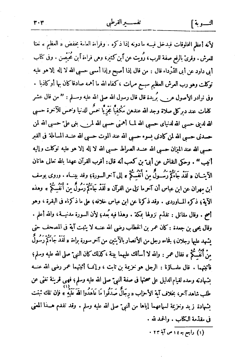 لِأَنَّهُ أَعْظَمُ الْمَخْلُوقَاتِ فَيَدْخُلُ فِيهِ مَا دُونَهُ إِذَا مَا ذَكَرَهُ. وَقِرَاءَةُ الْعَامَّةِ بِخَفْضِ" الْعَظِيمِ" نعتا للعرش. وقرى بِالرَّفْعِ صِفَةً لِلرَّبِّ، رُوِيَتْ عَنِ ابْنِ كَثِيرٍ، وَهِيَ قِرَاءَةُ ابْنِ مُحَيْصِنٍ وَفِي كِتَابِ أَبِي دَاوُدَ عَنْ أَبِي الدَّرْدَاءِ قَالَ: مَنْ قَالَ إِذَا أَصْبَحَ وَإِذَا أَمْسَى حَسْبِيَ اللَّهُ لَا إِلَهَ إِلَّا هُوَ عَلَيْهِ تَوَكَّلْتُ وَهُوَ رَبُّ الْعَرْشِ الْعَظِيمِ سَبْعَ مَرَّاتٍ كَفَاهُ اللَّهُ مَا أَهَمَّهُ صَادِقًا كَانَ بِهَا أَوْ كَاذِبًا. وَفِي نَوَادِرِ الْأُصُولِ عَنْ بُرَيْدَةَ قَالَ قَالَ رَسُولُ اللَّهِ صَلَّى اللَّهُ عَلَيْهِ وَسَلَّمَ: (مَنْ قَالَ عَشْرَ كَلِمَاتٍ عِنْدَ دُبُرِ كُلِّ صَلَاةٍ وَجَدَ اللَّهَ عِنْدَهُنَّ مَكْفِيًّا مَجْزِيًّا خَمْسٌ لِلدُّنْيَا وَخَمْسٌ لِلْآخِرَةِ حَسْبِيَ اللَّهُ لِدِينِي حَسْبِيَ اللَّهُ لِدُنْيَايَ حَسْبِيَ اللَّهُ لِمَا أَهَمَّنِي حَسْبِيَ اللَّهُ لِمَنْ بَغَى عَلَيَّ حَسْبِيَ اللَّهُ لِمَنْ حَسَدَنِي حَسْبِيَ اللَّهُ لِمَنْ كَادَنِي بِسُوءٍ حَسْبِيَ اللَّهُ عِنْدَ الْمَوْتِ حَسْبِيَ اللَّهُ عِنْدَ الْمَسْأَلَةِ فِي الْقَبْرِ حَسْبِيَ اللَّهُ عِنْدَ الْمِيزَانِ حَسْبِيَ اللَّهُ عِنْدَ الصِّرَاطِ حَسْبِيَ اللَّهُ لَا إِلَهَ إِلَّا هُوَ عَلَيْهِ تَوَكَّلْتُ وَإِلَيْهِ أُنِيبُ (. وَحَكَى النَّقَّاشُ عَنْ أُبَيِّ بْنِ كَعْبٍ أَنَّهُ قَالَ: أَقْرَبُ الْقُرْآنِ عَهْدًا بِاللَّهِ تَعَالَى هَاتَانِ الْآيَتَانِ" لَقَدْ جاءَكُمْ رَسُولٌ مِنْ أَنْفُسِكُمْ" إِلَى آخِرِ السُّورَةِ، وَقَدْ بَيَّنَّاهُ. وَرَوَى يُوسُفُ بْنُ مِهْرَانَ عَنِ ابْنِ عَبَّاسٍ أَنَّ آخِرَ مَا نَزَلَ مِنَ الْقُرْآنِ" لَقَدْ جاءَكُمْ رَسُولٌ مِنْ أَنْفُسِكُمْ" وَهَذِهِ الْآيَةُ، ذَكَرَهُ الْمَاوَرْدِيُّ. وَقَدْ ذَكَرْنَا عَنِ ابْنِ عَبَّاسٍ خِلَافَهُ، عَلَى مَا ذَكَرْنَاهُ فِي [الْبَقَرَةِ] وَهُوَ أَصَحُّ. وَقَالَ مُقَاتِلٌ: تَقَدَّمَ نُزُولُهَا بِمَكَّةَ. وَهَذَا فِيهِ بُعْدٌ لِأَنَّ السُّورَةَ مَدَنِيَّةُ وَاللَّهُ أَعْلَمُ. وَقَالَ يَحْيَى بْنُ جَعْدَةَ: كَانَ عُمَرُ بْنُ الْخَطَّابِ رَضِيَ اللَّهُ عَنْهُ لَا يُثْبِتُ آيَةً فِي الْمُصْحَفِ حَتَّى يَشْهَدَ عَلَيْهَا رَجُلَانِ فَجَاءَهُ رَجُلٌ مِنَ الْأَنْصَارِ بِالْآيَتَيْنِ مِنْ آخِرِ سُورَةِ بَرَاءَةٌ" لَقَدْ جاءَكُمْ رَسُولٌ مِنْ أَنْفُسِكُمْ" فَقَالَ عُمَرُ: وَاللَّهِ لَا أَسْأَلُكَ عَلَيْهِمَا بَيِّنَةً كَذَلِكَ كَانَ النَّبِيُّ صَلَّى اللَّهُ عَلَيْهِ وَسَلَّمَ فَأَثْبَتَهُمَا. قَالَ عُلَمَاؤُنَا: الرَّجُلُ هُوَ خُزَيْمَةُ بْنُ ثَابِتٍ وَإِنَّمَا أَثْبَتَهُمَا عُمَرُ رَضِيَ اللَّهُ عَنْهُ بِشَهَادَتِهِ وَحْدَهُ لِقِيَامِ الدَّلِيلِ عَلَى صِحَّتِهَا فِي صِفَةِ النَّبِيِّ صَلَّى اللَّهُ عَلَيْهِ وَسَلَّمَ فَهِيَ قَرِينَةٌ تُغْنِي عَنْ طَلَبِ شَاهِدٍ آخَرَ بِخِلَافِ آيَةِ الْأَحْزَابِ" رِجالٌ صَدَقُوا مَا عاهَدُوا اللَّهَ عَلَيْهِ" «١» [الْأَحْزَابِ: ٢٣] فَإِنَّ تِلْكَ ثَبَتَتْ بِشَهَادَةِ زَيْدٍ وَخُزَيْمَةَ لِسَمَاعِهِمَا إِيَّاهَا مِنَ النَّبِيِّ صَلَّى اللَّهُ عَلَيْهِ وَسَلَّمَ. وَقَدْ تَقَدَّمَ هَذَا الْمَعْنَى فِي مُقَدِّمَةِ الْكِتَابِ. والحمد لله.