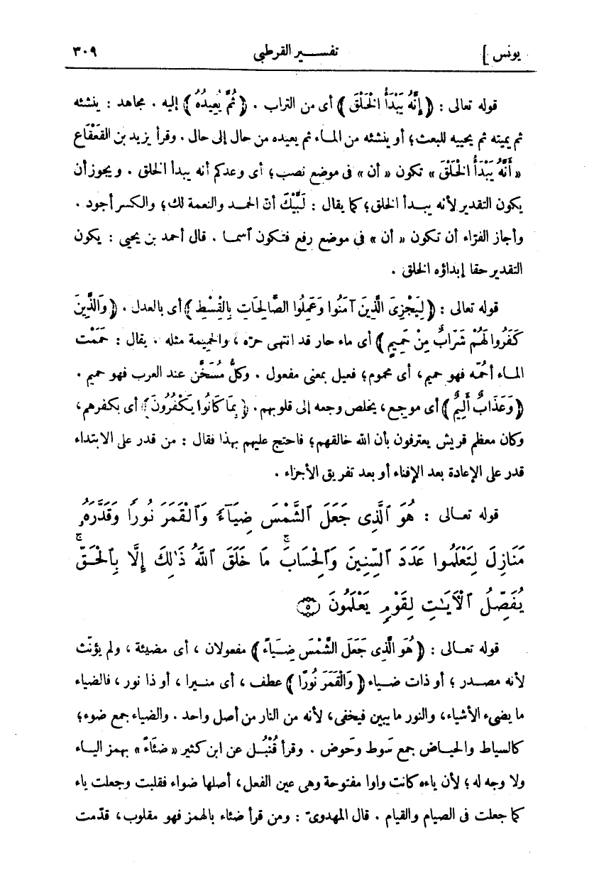 قوله تعالى:" إِنَّهُ يَبْدَؤُا الْخَلْقَ" أَيْ مِنَ التُّرَابِ." ثُمَّ يُعِيدُهُ" إِلَيْهِ. مُجَاهِدٌ: يُنْشِئُهُ ثُمَّ يُمِيتُهُ ثُمَّ يُحْيِيهِ لِلْبَعْثِ، أَوْ يُنْشِئُهُ مِنَ الْمَاءِ ثُمَّ يُعِيدُهُ مِنْ حَالٍ إِلَى حَالٍ. وَقَرَأَ يَزِيدُ بْنُ الْقَعْقَاعِ" إِنَّهُ يَبْدَؤُا الْخَلْقَ" تَكُونُ" أَنَّ" فِي مَوْضِعِ نَصْبٍ، أَيْ وَعَدَكُمْ أَنَّهُ يَبْدَأُ الْخَلْقَ. وَيَجُوزُ أَنْ يَكُونَ التَّقْدِيرُ لِأَنَّهُ يَبْدَأُ الْخَلْقَ، كَمَا يُقَالُ: لَبَّيْكَ أَنَّ الْحَمْدَ وَالنِّعْمَةَ لَكَ، وَالْكَسْرُ أَجْوَدُ. وَأَجَازَ الْفَرَّاءُ أَنْ تَكُونَ" أَنَّ" فِي مَوْضِعِ رَفْعٍ فَتَكُونُ اسْمًا. قَالَ أَحْمَدُ بْنُ يَحْيَى: يَكُونُ التَّقْدِيرُ حَقًّا إِبْدَاؤُهُ الْخَلْقَ. قَوْلُهُ تَعَالَى: (لِيَجْزِيَ الَّذِينَ آمَنُوا وَعَمِلُوا الصَّالِحاتِ بِالْقِسْطِ) أَيْ بِالْعَدْلِ. (وَالَّذِينَ كَفَرُوا لَهُمْ شَرابٌ مِنْ حَمِيمٍ) أَيْ مَاءٌ حَارٌّ قَدِ انْتَهَى حَرُّهُ، وَالْحَمِيمَةُ مِثْلُهُ. يُقَالُ: حَمَمْتُ الْمَاءَ أَحُمُّهُ فَهُوَ حَمِيمٌ، أَيْ مَحْمُومٌ، فَعِيلٌ بِمَعْنَى مَفْعُولٍ. وَكُلُّ مُسَخَّنٍ عِنْدَ الْعَرَبِ فَهُوَ حَمِيمٌ. (وَعَذابٌ أَلِيمٌ) أَيْ مُوجِعٌ، يَخْلُصُ وَجَعُهُ إِلَى قُلُوبِهِمْ. (بِما كانُوا يَكْفُرُونَ) أَيْ بِكُفْرِهِمْ، وَكَانَ مُعْظَمُ قُرَيْشٍ يَعْتَرِفُونَ بِأَنَّ اللَّهَ خَالِقُهُمْ، فَاحْتَجَّ عَلَيْهِمْ بِهَذَا فَقَالَ: مَنْ قَدَرَ عَلَى الِابْتِدَاءِ قَدَرَ عَلَى الْإِعَادَةِ بَعْدَ الإفناء أو بعد تفريق الاجزاء.