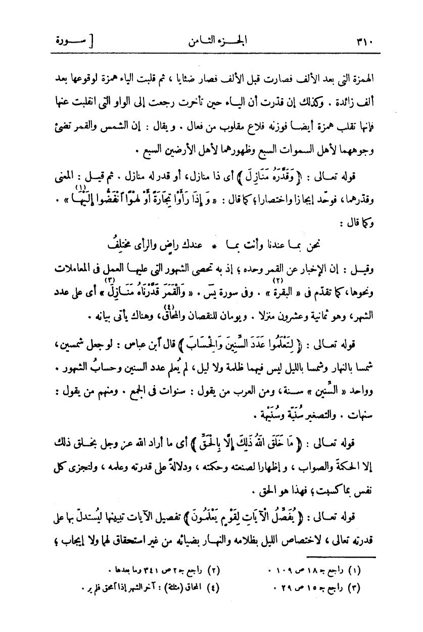 وَقِيلَ: إِنَّ الْإِخْبَارَ عَنِ الْقَمَرِ وَحْدَهُ، إِذْ بِهِ تُحْصَى الشُّهُورُ الَّتِي عَلَيْهَا الْعَمَلُ فِي الْمُعَامَلَاتِ وَنَحْوِهَا، كَمَا تَقَدَّمَ فِي" الْبَقَرَةِ" «٢». وفي سورة يس:" وَالْقَمَرَ قَدَّرْناهُ مَنازِلَ" «٣» [يس: ٣٩] أَيْ عَلَى عَدَدِ الشَّهْرِ، وَهُوَ ثَمَانِيَةٌ وَعِشْرُونَ مَنْزِلًا. وَيَوْمَانِ لِلنُّقْصَانِ وَالْمِحَاقِ «٤»، وَهُنَاكَ يَأْتِي بَيَانُهُ. قوله تعالى: (لِتَعْلَمُوا عَدَدَ السِّنِينَ وَالْحِسابَ) قَالَ ابْنُ عَبَّاسٍ: لَوْ جَعَلَ شَمْسَيْنِ، شَمْسًا بِالنَّهَارِ وَشَمْسًا بِاللَّيْلِ لَيْسَ فِيهِمَا ظُلْمَةٌ وَلَا لَيْلٌ، لَمْ يُعْلَمْ عَدَدُ السِّنِينَ وَحِسَابُ الشُّهُورِ. وَوَاحِدُ" السِّنِينَ" سَنَةٌ، وَمِنَ الْعَرَبِ مَنْ يَقُولُ: سَنَوَاتٌ فِي الْجَمْعِ وَمِنْهُمْ مَنْ يَقُولُ: سَنَهَاتٌ. وَالتَّصْغِيرُ سُنَيَّةٌ وَسُنَيْهَةٌ. قَوْلُهُ تَعَالَى: (مَا خَلَقَ اللَّهُ ذلِكَ إِلَّا بِالْحَقِّ) أَيْ مَا أَرَادَ اللَّهُ عَزَّ وَجَلَّ بِخَلْقِ ذَلِكَ إِلَّا الْحِكْمَةَ وَالصَّوَابَ، وَإِظْهَارًا لِصَنْعَتِهِ وَحِكْمَتِهِ، وَدَلَالَةً عَلَى قُدْرَتِهِ وَعِلْمِهِ، وَلِتُجْزَى كُلُّ نَفْسٍ بِمَا كَسَبَتْ، فَهَذَا هُوَ الْحَقُّ. قَوْلُهُ تَعَالَى: (يُفَصِّلُ الْآياتِ لِقَوْمٍ يَعْلَمُونَ) تَفْصِيلُ الْآيَاتِ تَبْيِينُهَا لِيُسْتَدَلَّ بِهَا عَلَى قُدْرَتِهِ تَعَالَى، لِاخْتِصَاصِ اللَّيْلِ بِظَلَامِهِ وَالنَّهَارِ بِضِيَائِهِ مِنْ غَيْرِ اسْتِحْقَاقٍ لهما ولا إيجاب،