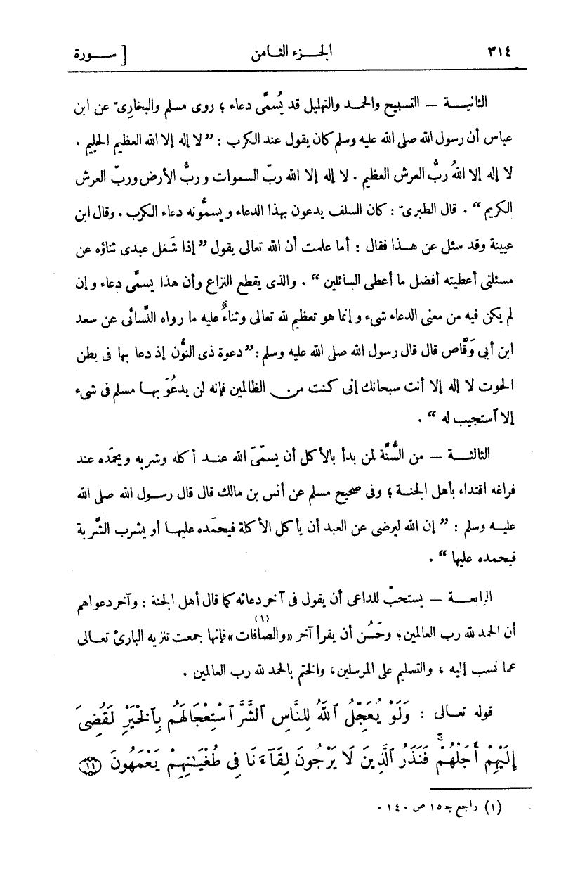 الثَّانِيَةُ- التَّسْبِيحُ وَالْحَمْدُ وَالتَّهْلِيلُ قَدْ يُسَمَّى دُعَاءً، رَوَى مُسْلِمٌ وَالْبُخَارِيُّ عَنِ ابْنِ عَبَّاسٍ أَنَّ رَسُولَ اللَّهِ صَلَّى اللَّهُ عَلَيْهِ وَسَلَّمَ كان يَقُولُ عِنْدَ الْكَرْبِ: (لَا إِلَهَ إِلَّا اللَّهُ الْعَظِيمُ الْحَلِيمُ. لَا إِلَهَ إِلَّا اللَّهُ رَبُّ الْعَرْشِ الْعَظِيمِ. لَا إِلَهَ إِلَّا اللَّهُ رَبُّ السموات وَرَبُّ الْأَرْضِ وَرَبُّ الْعَرْشِ الْكَرِيمِ). قَالَ الطَّبَرِيُّ: كَانَ السَّلَفُ يَدْعُونَ بِهَذَا الدُّعَاءِ وَيُسَمُّونَهُ دُعَاءَ الْكَرْبِ. وَقَالَ ابْنُ عُيَيْنَةَ وَقَدْ سُئِلَ عَنْ هَذَا فَقَالَ: أَمَا عَلِمْتَ أَنَّ اللَّهَ تَعَالَى يَقُولُ (إِذَا شَغَلَ عَبْدِي ثَنَاؤُهُ عَنْ مَسْأَلَتِي أَعْطَيْتُهُ أَفْضَلَ مَا أُعْطِيَ السَّائِلِينَ). وَالَّذِي يَقْطَعُ النِّزَاعَ وَأَنَّ هَذَا يُسَمَّى دُعَاءً وَإِنْ لَمْ يكن فيه من معنى الدعاء شي وَإِنَّمَا هُوَ تَعْظِيمٌ لِلَّهِ تَعَالَى وَثَنَاءٌ عَلَيْهِ ما رواه النسائي عن سعد ابن أَبِي وَقَّاصٍ قَالَ قَالَ رَسُولُ اللَّهِ صَلَّى اللَّهُ عَلَيْهِ وَسَلَّمَ: (دعوة ذي النون إذا دَعَا بِهَا فِي بَطْنِ الْحُوتِ لَا إِلَهَ إِلَّا أَنْتَ سُبْحَانَكَ إِنِّي كُنْتُ مِنَ الظَّالِمِينَ فإنه لن يدعو بها مسلم في شي إِلَّا اسْتُجِيبَ لَهُ (. الثَّالِثَةُ- مِنَ السُّنَّةِ لِمَنْ بَدَأَ بِالْأَكْلِ أَنْ يُسَمِّيَ اللَّهَ عِنْدَ أَكْلِهِ وَشُرْبِهِ وَيَحْمَدَهُ عِنْدَ فَرَاغِهِ اقْتِدَاءً بِأَهْلِ الْجَنَّةِ، وَفِي صَحِيحِ مُسْلِمٍ عَنْ أَنَسِ بْنِ مَالِكٍ قَالَ: قَالَ رَسُولُ اللَّهِ صَلَّى اللَّهُ عَلَيْهِ وَسَلَّمَ: (إِنَّ اللَّهَ لَيَرْضَى عَنِ الْعَبْدِ أَنْ يَأْكُلَ الْأَكْلَةَ فَيَحْمَدَهُ عَلَيْهَا أَوْ يَشْرَبَ الشَّرْبَةَ فَيَحْمَدَهُ عَلَيْهَا). الرَّابِعَةُ- يُسْتَحَبُّ لِلدَّاعِي أَنْ يَقُولَ فِي آخِرِ دُعَائِهِ كَمَا قَالَ أَهْلُ الْجَنَّةِ: وَآخِرُ دَعْوَاهُمْ أَنِ الْحَمْدُ لِلَّهِ رَبِّ الْعَالَمِينَ، وَحَسُنَ أَنْ يَقْرَأَ آخِرَ" وَالصَّافَّاتِ" «١» فَإِنَّهَا جَمَعَتْ تَنْزِيهَ الْبَارِئِ تَعَالَى عَمَّا نُسِبَ إِلَيْهِ، وَالتَّسْلِيمَ عَلَى الْمُرْسَلِينَ، وَالْخَتْمَ بِالْحَمْدِ لِلَّهِ رَبِّ الْعَالَمِينَ.