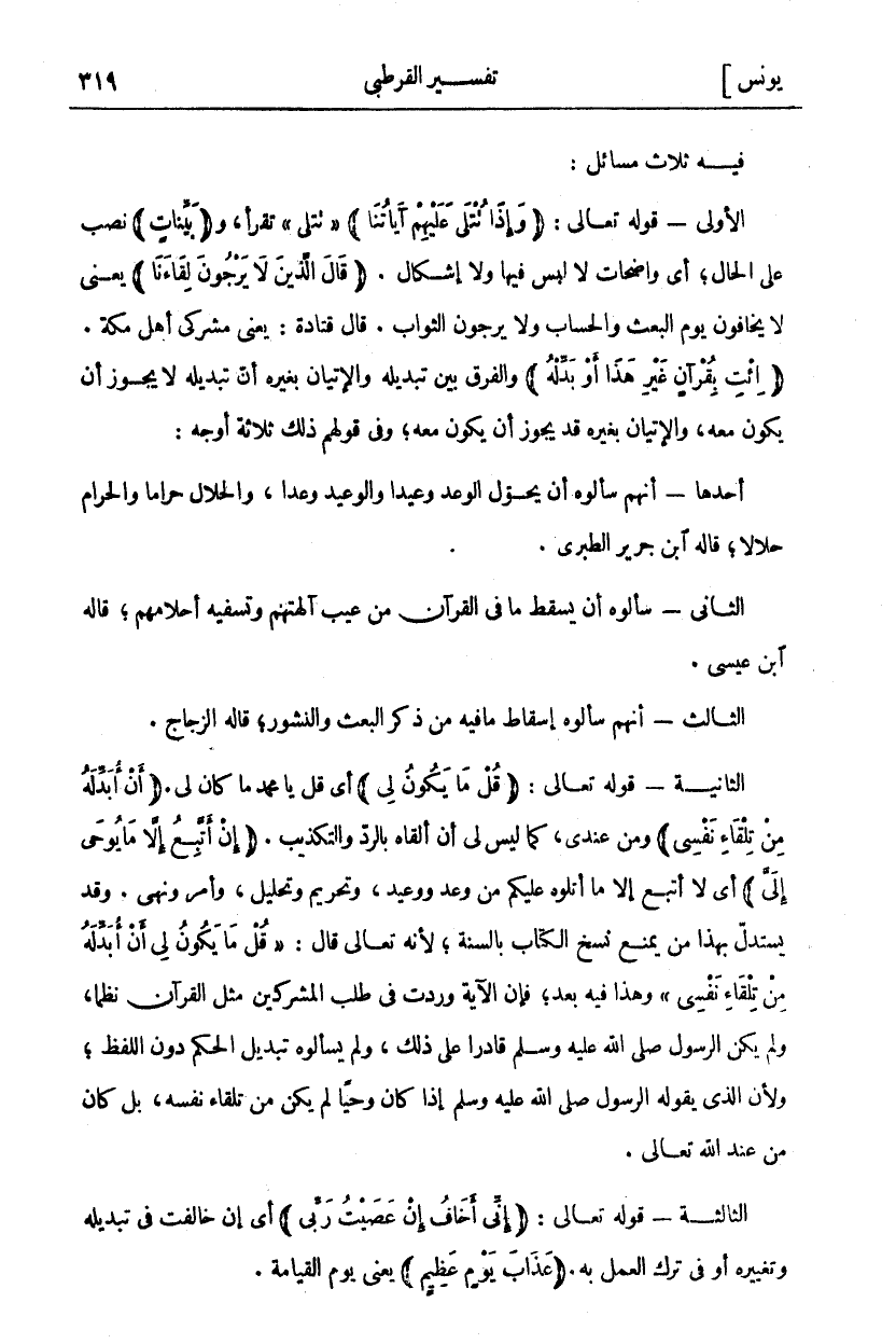 فيه ثلاث مسائل: الاولى- قَوْلُهُ تَعَالَى: (وَإِذا تُتْلى عَلَيْهِمْ آياتُنا) " تُتْلى " تقرأ، و" بَيِّناتٍ" نُصِبَ عَلَى الْحَالِ، أَيْ وَاضِحَاتٍ لَا لَبْسَ فِيهَا وَلَا إِشْكَالَ. (قَالَ الَّذِينَ لَا يَرْجُونَ لقائنا) يَعْنِي لَا يَخَافُونَ يَوْمَ الْبَعْثِ وَالْحِسَابِ وَلَا يَرْجُونَ الثَّوَابَ. قَالَ قَتَادَةُ: يَعْنِي مُشْرِكِي أَهْلِ مَكَّةَ. (ائْتِ بِقُرْآنٍ غَيْرِ هَذَا أَوْ بَدِّلْهُ) وَالْفَرْقُ بَيْنَ تَبْدِيلِهِ وَالْإِتْيَانِ بِغَيْرِهِ أَنَّ تَبْدِيلَهُ لَا يَجُوزُ أَنْ يَكُونَ مَعَهُ، وَالْإِتْيَانَ بِغَيْرِهِ قد يجوز أن يكون معه، وفي قو لهم ذلك ثلاثة أوجه: أحد ها- أَنَّهُمْ سَأَلُوهُ أَنْ يُحَوِّلَ الْوَعْدَ وَعِيدًا وَالْوَعِيدَ وَعْدًا، وَالْحَلَالَ حَرَامًا وَالْحَرَامَ حَلَالًا، قَالَهُ ابْنُ جَرِيرٍ الطَّبَرِيُّ. الثَّانِي- سَأَلُوهُ أَنْ يُسْقِطَ مَا فِي الْقُرْآنِ مِنْ عَيْبِ آلِهَتِهِمْ وَتَسْفِيهِ أَحْلَامِهِمْ، قَالَهُ ابْنُ عِيسَى. الثَّالِثُ- أَنَّهُمْ سَأَلُوهُ إِسْقَاطَ مَا فِيهِ مِنْ ذِكْرِ الْبَعْثِ وَالنُّشُورِ، قَالَهُ الزَّجَّاجُ. الثَّانِيَةُ- قَوْلُهُ تَعَالَى:" (قُلْ مَا يَكُونُ لِي) " أَيْ قُلْ يَا مُحَمَّدُ مَا كَانَ لِي." أَنْ أُبَدِّلَهُ مِنْ تِلْقاءِ نَفْسِي" وَمِنْ عِنْدِي، كَمَا لَيْسَ لِي أَنْ أَلْقَاهُ بِالرَّدِّ وَالتَّكْذِيبِ. (إِنْ أَتَّبِعُ إِلَّا مَا يُوحَى إِلَيَّ) أَيْ لَا أَتَّبِعُ إِلَّا مَا أَتْلُوهُ عَلَيْكُمْ مِنْ وَعْدٍ وَوَعِيدٍ، وَتَحْرِيمٍ وَتَحْلِيلٍ، وَأَمْرٍ وَنَهْيٍ. وَقَدْ يَسْتَدِلُّ بِهَذَا مَنْ يَمْنَعُ نَسْخَ الْكِتَابِ بِالسُّنَّةِ، لِأَنَّهُ تَعَالَى قَالَ:" قُلْ مَا يَكُونُ لِي أَنْ أُبَدِّلَهُ مِنْ تِلْقاءِ نَفْسِي" وَهَذَا فِيهِ بُعْدٌ، فَإِنَّ الْآيَةَ وَرَدَتْ فِي طَلَبِ الْمُشْرِكِينَ مِثْلَ الْقُرْآنِ نَظْمًا، وَلَمْ يَكُنِ الرَّسُولُ صَلَّى اللَّهُ عَلَيْهِ وَسَلَّمَ قَادِرًا عَلَى ذَلِكَ، وَلَمْ يَسْأَلُوهُ تَبْدِيلَ الْحُكْمِ دُونَ اللَّفْظِ، وَلِأَنَّ الَّذِي يَقُولُهُ الرَّسُولُ صَلَّى اللَّهُ عَلَيْهِ وَسَلَّمَ إِذَا كَانَ وَحْيًا لَمْ يَكُنْ مِنْ تِلْقَاءِ نَفْسِهِ، بَلْ كَانَ مِنْ عِنْدِ اللَّهِ تَعَالَى. الثَّالِثَةُ- قَوْلُهُ تَعَالَى: (إِنِّي أَخافُ إِنْ عَصَيْتُ رَبِّي) أَيْ إِنْ خَالَفْتُ فِي تَبْدِيلِهِ وَتَغْيِيرِهِ أَوْ فِي تَرْكِ الْعَمَلِ بِهِ. (عَذابَ يَوْمٍ عَظِيمٍ) يعني يوم القيامة.