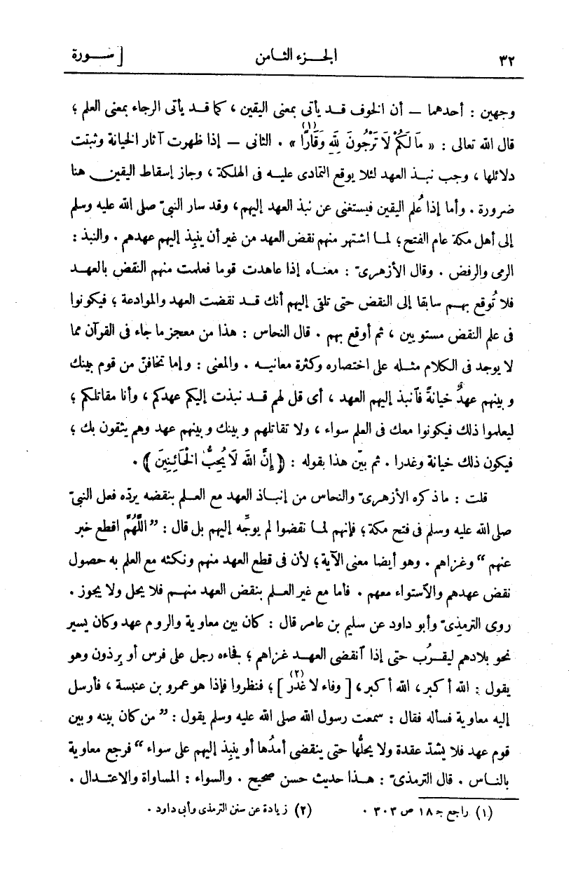 وَجْهَيْنِ: أَحَدُهُمَا- أَنَّ الْخَوْفَ قَدْ يَأْتِي بِمَعْنَى الْيَقِينِ، كَمَا قَدْ يَأْتِي الرَّجَاءُ بِمَعْنَى الْعِلْمِ، قَالَ اللَّهُ تَعَالَى:" مَا لَكُمْ لَا تَرْجُونَ لِلَّهِ وَقاراً" «١» [نوح: ١٣]. الثَّانِي- إِذَا ظَهَرَتْ آثَارُ الْخِيَانَةِ وَثَبَتَتْ دَلَائِلُهَا، وَجَبَ نَبْذُ الْعَهْدِ لِئَلَّا يُوقِعَ التَّمَادِي عَلَيْهِ فِي الْهَلَكَةِ، وَجَازَ إِسْقَاطُ الْيَقِينِ هُنَا ضَرُورَةً. وَأَمَّا إِذَا عُلِمَ الْيَقِينُ فَيُسْتَغْنَى عَنْ نَبْذِ الْعَهْدِ إِلَيْهِمْ، وَقَدْ سَارَ النَّبِيُّ صَلَّى اللَّهُ عَلَيْهِ وَسَلَّمَ إِلَى أَهْلِ مَكَّةَ عَامَ الْفَتْحِ، لَمَّا اشْتُهِرَ مِنْهُمْ نَقْضُ الْعَهْدِ مِنْ غَيْرِ أَنْ يَنْبِذَ إِلَيْهِمْ عَهْدَهُمْ. وَالنَّبْذُ: الرَّمْيُ وَالرَّفْضُ. وَقَالَ الْأَزْهَرِيُّ: مَعْنَاهُ إِذَا عَاهَدْتَ قَوْمًا فَعَلِمْتَ مِنْهُمُ النَّقْضَ بِالْعَهْدِ فَلَا تُوقِعْ بِهِمْ سَابِقًا إِلَى النَّقْضِ حَتَّى تُلْقِيَ إِلَيْهِمْ أَنَّكَ قَدْ نقضت العهد والموادعة، فَيَكُونُوا فِي عِلْمِ النَّقْضِ مُسْتَوِيِينَ، ثُمَّ أَوْقِعْ بِهِمْ. قَالَ النَّحَّاسُ: هَذَا مِنْ مُعْجِزِ مَا جَاءَ فِي الْقُرْآنِ مِمَّا لَا يُوجَدُ فِي الْكَلَامِ مِثْلُهُ عَلَى اخْتِصَارِهِ وَكَثْرَةِ مَعَانِيهِ. وَالْمَعْنَى: وَإِمَّا تَخَافَنَّ مِنْ قَوْمٍ بَيْنَكَ وَبَيْنَهُمْ عَهْدٌ خِيَانَةً فَانْبِذْ إِلَيْهِمُ الْعَهْدَ، أَيْ قُلْ لَهُمْ قَدْ نَبَذْتُ إِلَيْكُمْ عَهْدَكُمْ، وَأَنَا مُقَاتِلُكُمْ، لِيَعْلَمُوا ذَلِكَ فَيَكُونُوا مَعَكَ فِي الْعِلْمِ سَوَاءً، وَلَا تُقَاتِلْهُمْ وَبَيْنَكَ وَبَيْنَهُمْ عَهْدٌ وَهُمْ يَثِقُونَ بِكَ، فَيَكُونُ ذَلِكَ خِيَانَةً وَغَدْرًا. ثُمَّ بَيَّنَ هَذَا بِقَوْلِهِ:" إِنَّ اللَّهَ لَا يُحِبُّ الْخائِنِينَ". قُلْتُ: مَا ذَكَرَهُ الْأَزْهَرِيُّ وَالنَّحَّاسُ مِنْ إِنْبَاذِ الْعَهْدِ مَعَ الْعِلْمِ بِنَقْضِهِ يَرُدُّهُ فَعَلَ النَّبِيُّ صَلَّى اللَّهُ عَلَيْهِ وَسَلَّمَ فِي فَتْحِ مَكَّةَ، فَإِنَّهُمْ لَمَّا نَقَضُوا لَمْ يُوَجِّهْ إِلَيْهِمْ بَلْ قَالَ: (اللهم اقطع خبر عَنْهُمْ) وَغَزَاهُمْ. وَهُوَ أَيْضًا مَعْنَى الْآيَةِ، لِأَنَّ فِي قَطْعِ الْعَهْدِ مِنْهُمْ وَنَكْثِهِ مَعَ الْعِلْمِ بِهِ حُصُولُ نَقْضِ عَهْدِهِمْ وَالِاسْتِوَاءِ مَعَهُمْ. فَأَمَّا مَعَ غَيْرِ الْعِلْمِ بِنَقْضِ الْعَهْدِ مِنْهُمْ فَلَا يَحِلُّ وَلَا يَجُوزُ. رَوَى التِّرْمِذِيُّ وَأَبُو دَاوُدَ عَنْ سُلَيْمِ بْنِ عَامِرٍ قَالَ: كَانَ بَيْنَ مُعَاوِيَةَ وَالرُّومِ عَهْدٌ وَكَانَ يَسِيرُ نَحْوَ بِلَادِهِمْ لِيَقْرُبَ حَتَّى إِذَا انْقَضَى الْعَهْدُ غَزَاهُمْ، فَجَاءَهُ رَجُلٌ عَلَى فَرَسٍ أَوْ بِرْذَوْنٍ وَهُوَ يَقُولُ: اللَّهُ أَكْبَرُ، اللَّهُ أَكْبَرُ، [وَفَاءٌ لَا غَدْرُ [«٢»، فَنَظَرُوا فَإِذَا هُوَ عَمْرُو بْنُ عَنْبَسَةَ، فَأَرْسَلَ إليه معاومة فسأله فَقَالَ: سَمِعْتُ رَسُولَ اللَّهِ صَلَّى اللَّهُ عَلَيْهِ وَسَلَّمَ يَقُولُ: (مَنْ كَانَ بَيْنَهُ وَبَيْنَ قَوْمٍ عَهْدٌ فَلَا يَشُدَّ عُقْدَةً وَلَا يَحُلَّهَا حَتَّى يَنْقَضِيَ أَمَدُهَا أَوْ يَنْبِذَ إِلَيْهِمْ عَلَى سَوَاءٍ) فَرَجَعَ مُعَاوِيَةُ بِالنَّاسِ. قَالَ التِّرْمِذِيُّ: هَذَا حَدِيثٌ حسن صحيح. والسواء: المساواة والاعتدال.