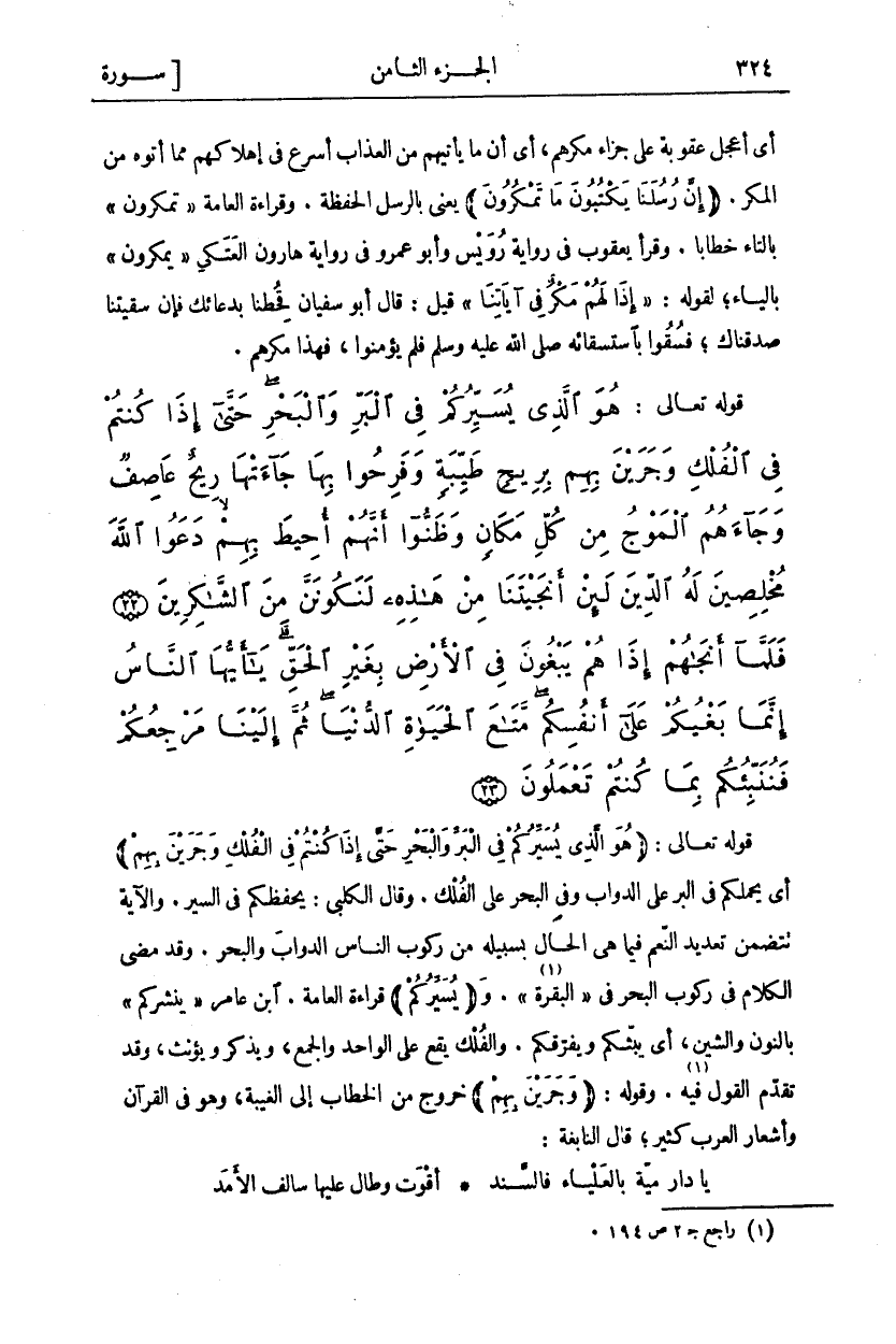قَوْلُهُ تَعَالَى: (هُوَ الَّذِي يُسَيِّرُكُمْ فِي الْبَرِّ وَالْبَحْرِ حَتَّى إِذا كُنْتُمْ فِي الْفُلْكِ وَجَرَيْنَ بِهِمْ) أَيْ يَحْمِلُكُمْ فِي الْبَرِّ عَلَى الدَّوَابِّ وَفِي الْبَحْرِ عَلَى الْفُلْكِ. وَقَالَ الْكَلْبِيُّ: يَحْفَظُكُمْ فِي السَّيْرِ. وَالْآيَةُ تَتَضَمَّنُ تَعْدِيدَ النِّعَمِ فِيمَا هِيَ الْحَالُ بِسَبِيلِهِ مِنْ رُكُوبِ النَّاسِ الدَّوَابَّ وَالْبَحْرَ. وَقَدْ مَضَى الْكَلَامُ فِي رُكُوبِ الْبَحْرِ فِي" الْبَقَرَةِ" «١»." يُسَيِّرُكُمْ" قِرَاءَةُ الْعَامَّةِ. ابْنُ عَامِرٍ" يَنْشُرُكُمْ" بِالنُّونِ وَالشِّينِ، أَيْ يَبُثُّكُمْ وَيُفَرِّقُكُمْ. وَالْفُلْكُ يَقَعُ عَلَى الْوَاحِدِ وَالْجَمْعِ، وَيُذَكَّرُ وَيُؤَنَّثُ، وَقَدْ تَقَدَّمَ الْقَوْلُ فِيهِ «٢». وَقَوْلُهُ:" وَجَرَيْنَ بِهِمْ" خُرُوجٌ مِنَ الْخِطَابِ إِلَى الْغَيْبَةِ، وَهُوَ فِي الْقُرْآنِ وَأَشْعَارِ الْعَرَبِ كَثِيرٌ، قَالَ النَّابِغَةُ: