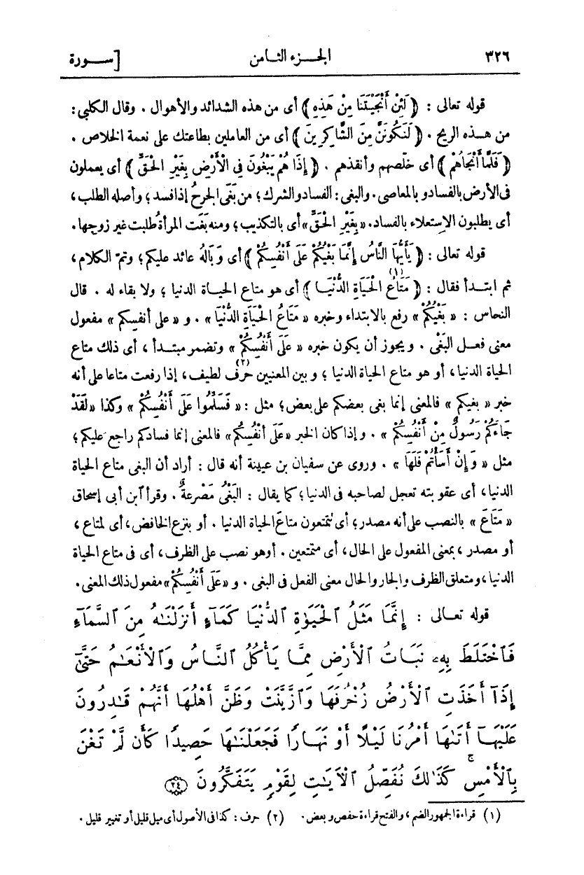 قَوْلُهُ تَعَالَى: (لَئِنْ أَنْجَيْتَنا مِنْ هذِهِ) أَيْ من هَذِهِ الشَّدَائِدِ وَالْأَهْوَالِ. وَقَالَ الْكَلْبِيُّ: مِنْ هَذِهِ الرِّيحِ. (لَنَكُونَنَّ مِنَ الشَّاكِرِينَ) أَيْ مِنَ الْعَامِلِينَ بِطَاعَتِكَ عَلَى نِعْمَةِ الْخَلَاصِ. (فَلَمَّا أَنْجاهُمْ) أَيْ خلصهم وأنقذ هم. (إِذا هُمْ يَبْغُونَ فِي الْأَرْضِ بِغَيْرِ الْحَقِّ) أَيْ يَعْمَلُونَ فِي الْأَرْضِ بِالْفَسَادِ وَبِالْمَعَاصِي. وَالْبَغْيُ: الْفَسَادُ وَالشِّرْكُ، مِنْ بَغَى الْجُرْحُ إِذَا فَسَدَ، وَأَصْلُهُ الطَّلَبُ، أَيْ يَطْلُبُونَ الِاسْتِعْلَاءَ بِالْفَسَادِ. (بِغَيْرِ الْحَقِّ) أَيْ بِالتَّكْذِيبِ، وَمِنْهُ بَغَتِ الْمَرْأَةُ طَلَبَتْ غَيْرَ زَوْجِهَا. قَوْلُهُ تَعَالَى: (يَا أَيُّهَا النَّاسُ إِنَّما بَغْيُكُمْ عَلى أَنْفُسِكُمْ) أَيْ وَبَالُهُ عَائِدٌ عَلَيْكُمْ، وَتَمَّ الْكَلَامُ، ثُمَّ ابْتَدَأَ فَقَالَ:" مَتاعَ «١» الْحَياةِ الدُّنْيا" أَيْ هُوَ مَتَاعُ الْحَيَاةِ الدُّنْيَا، وَلَا بَقَاءَ لَهُ. قَالَ النَّحَّاسُ: بَغْيُكُمْ" رُفِعَ بِالِابْتِدَاءِ وَخَبَرُهُ" مَتاعَ الْحَياةِ الدُّنْيا". وَ" عَلى أَنْفُسِكُمْ" مَفْعُولُ مَعْنَى فِعْلِ الْبَغْيِ. وَيَجُوزُ أَنْ يَكُونَ خَبَرُهُ" عَلى أَنْفُسِكُمْ" وَتُضْمِرُ مُبْتَدَأً، أَيْ ذَلِكَ مَتَاعُ الْحَيَاةِ الدُّنْيَا، أَوْ هُوَ مَتَاعُ الْحَيَاةِ الدُّنْيَا، وَبَيْنَ الْمَعْنَيَيْنِ حَرْفٌ «٢» لَطِيفٌ، إِذَا رَفَعْتَ مَتَاعًا عَلَى أَنَّهُ خَبَرُ" بَغْيُكُمْ" فَالْمَعْنَى إِنَّمَا بَغْيُ بَعْضِكُمْ عَلَى بَعْضٍ، مِثْلُ:" فَسَلِّمُوا عَلى أَنْفُسِكُمْ" [النور: ٦١] وكذا" لَقَدْ جاءَكُمْ رَسُولٌ مِنْ أَنْفُسِكُمْ" [التوبة: ١٢٨]. وَإِذَا كَانَ الْخَبَرُ" عَلى أَنْفُسِكُمْ" فَالْمَعْنَى إِنَّمَا فَسَادُكُمْ رَاجِعٌ عَلَيْكُمْ، مِثْلُ" وَإِنْ أَسَأْتُمْ فَلَها". وَرُوِيَ عَنْ سُفْيَانَ بْنِ عُيَيْنَةَ أَنَّهُ قَالَ: أَرَادَ أَنَّ الْبَغْيَ مَتَاعُ الْحَيَاةِ الدُّنْيَا، أَيْ عُقُوبَتُهُ تُعَجَّلُ لِصَاحِبِهِ فِي الدُّنْيَا، كَمَا يُقَالُ: الْبَغْيُ مَصْرَعَةٌ. وَقَرَأَ ابْنُ أَبِي إِسْحَاقَ" مَتَاعَ" بِالنَّصْبِ عَلَى أَنَّهُ مَصْدَرٌ، أَيْ تَتَمَتَّعُونَ مَتَاعَ الحياة الدنيا. أو ينزع الْخَافِضِ، أَيْ لِمَتَاعِ، أَوْ مَصْدَرٌ، بِمَعْنَى الْمَفْعُولِ عَلَى الْحَالِ، أَيْ مُتَمَتِّعِينَ. أَوْ هُوَ نُصِبَ عَلَى الظَّرْفِ، أَيْ فِي مَتَاعِ الْحَيَاةِ الدُّنْيَا، وَمُتَعَلِّقُ الظَّرْفِ وَالْجَارِّ وَالْحَالِ مَعْنَى الْفِعْلِ فِي الْبَغْيِ. وَ" عَلى أَنْفُسِكُمْ" مَفْعُولُ ذَلِكَ الْمَعْنَى.