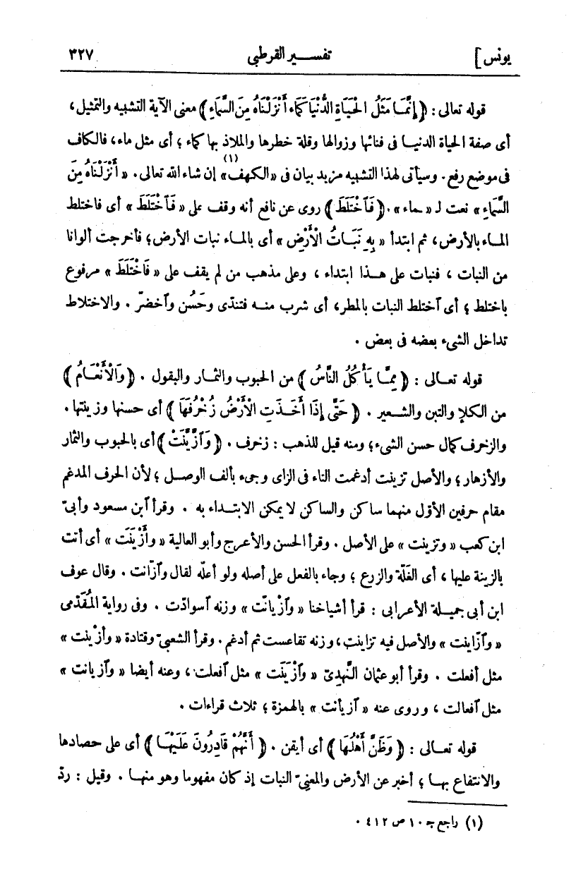 قَوْلُهُ تَعَالَى: (إِنَّما مَثَلُ الْحَياةِ الدُّنْيا كَماءٍ أَنْزَلْناهُ مِنَ السَّماءِ) مَعْنَى الْآيَةِ التَّشْبِيهُ وَالتَّمْثِيلُ، أَيْ صِفَةُ الْحَيَاةِ الدُّنْيَا فِي فَنَائِهَا وَزَوَالِهَا وقلة خطر ها وَالْمَلَاذِّ بِهَا كَمَاءٍ، أَيْ مِثْلُ مَاءٍ، فَالْكَافُ فِي مَوْضِعِ رَفْعٍ. وَسَيَأْتِي لِهَذَا التَّشْبِيهِ مَزِيدُ بَيَانٍ فِي" الْكَهْفِ" «١» إِنْ شَاءَ اللَّهُ تَعَالَى." أَنْزَلْناهُ مِنَ السَّماءِ" نَعْتٌ لِ"- مَاءٍ". (فَاخْتَلَطَ) رُوِيَ عَنْ نَافِعٍ أَنَّهُ وَقَفَ عَلَى" فَاخْتَلَطَ" أَيْ فَاخْتَلَطَ الْمَاءُ بِالْأَرْضِ، ثُمَّ ابْتَدَأَ (بِهِ نَباتُ الْأَرْضِ) أَيْ بِالْمَاءِ نَبَاتُ الْأَرْضِ، فَأَخْرَجَتْ أَلْوَانًا مِنَ النَّبَاتِ، فَنَبَاتٌ عَلَى هَذَا ابْتِدَاءٌ، وَعَلَى مَذْهَبِ مَنْ لَمْ يَقِفْ عَلَى" فَاخْتَلَطَ" مَرْفُوعٌ بِاخْتَلَطَ، أَيِ اخْتَلَطَ النَّبَاتُ بِالْمَطَرِ، أَيْ شَرِبَ مِنْهُ فَتَنَدَّى وَحَسُنَ وَاخْضَرَّ. وَالِاخْتِلَاطُ تَدَاخُلُ الشَّيْءِ بَعْضُهُ فِي بَعْضٍ. قَوْلُهُ تَعَالَى: (مِمَّا يَأْكُلُ النَّاسُ) مِنَ الْحُبُوبِ وَالثِّمَارِ وَالْبُقُولِ. (وَالْأَنْعامُ) مِنَ الْكَلَإِ وَالتِّبْنِ وَالشَّعِيرِ. (حَتَّى إِذا أَخَذَتِ الْأَرْضُ زُخْرُفَها) أَيْ حُسْنَهَا وَزِينَتَهَا. وَالزُّخْرُفُ كَمَالُ حُسْنِ الشَّيْءِ، وَمِنْهُ قِيلَ لِلذَّهَبِ: زُخْرُفٌ. (وَازَّيَّنَتْ) أَيْ بِالْحُبُوبِ وَالثِّمَارِ وَالْأَزْهَارِ، وَالْأَصْلُ تَزَيَّنَتْ أُدْغِمَتِ التاء في الزاي وجئ بِأَلِفِ الْوَصْلِ، لِأَنَّ الْحَرْفَ الْمُدْغَمَ مَقَامُ حَرْفَيْنِ الْأَوَّلُ مِنْهُمَا سَاكِنٌ وَالسَّاكِنُ لَا يُمْكِنُ الِابْتِدَاءُ بِهِ. وَقَرَأَ ابْنُ مَسْعُودٍ وَأُبَيُّ بْنُ كَعْبٍ" وَتَزَيَّنَتْ" عَلَى الْأَصْلِ. وَقَرَأَ الْحَسَنُ وَالْأَعْرَجُ وَأَبُو الْعَالِيَةِ" وَأَزْيَنَتْ" أَيْ أَتَتْ بِالزِّينَةِ عَلَيْهَا، أَيِ الْغَلَّةِ وَالزَّرْعِ، وَجَاءَ بِالْفِعْلِ عَلَى أَصْلِهِ وَلَوْ أعله لقال وازانت. وقال عوف ابن أَبِي جَمِيلَةَ الْأَعْرَابِيُّ: قَرَأَ أَشْيَاخُنَا" وَازْيَانَّتْ" وَزْنُهُ اسْوَادَّتْ. وَفِي رِوَايَةِ الْمُقَدِّمِيِّ" وَازَّايَنَتْ" وَالْأَصْلُ فِيهِ تَزَايَنَتْ، وَزْنُهُ تَقَاعَسَتْ ثُمَّ أُدْغِمَ. وَقَرَأَ الشَّعْبِيُّ وَقَتَادَةُ" وَأَزْيَنَتْ" مِثْلُ أفْعَلَتْ. وَقَرَأَ أَبُو عُثْمَانَ النَّهْدِيُّ" وَازْيَنَتْ" مِثْلُ افْعَلَتْ، وَعَنْهُ أَيْضًا" وَازْيَانَتْ مِثْلُ افْعَالَتْ، وَرُوِيَ عَنْهُ" ازْيَأَنَتْ" بِالْهَمْزَةِ، ثَلَاثُ قِرَاءَاتٍ. قَوْلُهُ تَعَالَى: (وَظَنَّ أَهْلُها) أَيْ أَيْقَنَ. (أَنَّهُمْ قادِرُونَ عَلَيْها) أَيْ عَلَى حَصَادِهَا وَالِانْتِفَاعِ بِهَا، أَخْبَرَ عَنِ الْأَرْضِ وَالْمَعْنِيُّ النَّبَاتُ إِذْ كان مفهوما وهو منها. وقيل: رد