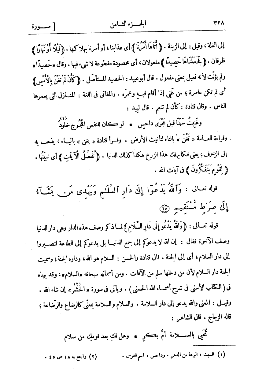 إِلَى الْغَلَّةِ، وَقِيلَ: إِلَى الزِّينَةِ. (أَتاها أَمْرُنا) أَيْ عَذَابُنَا، أَوْ أَمَرْنَا بِهَلَاكِهَا. (لَيْلًا أَوْ نَهاراً) ظَرْفَانِ. (فَجَعَلْناها حَصِيداً) مَفْعُولَانِ، أَيْ مَحْصُودَةً مقطوعة لا شي فِيهَا. وَقَالَ" حَصِيدًا" وَلَمْ يُؤَنِّثْ لِأَنَّهُ فَعِيلٌ بِمَعْنَى مَفْعُولٍ. قَالَ أَبُو عُبَيْدٍ: الْحَصِيدُ الْمُسْتَأْصَلُ. (كَأَنْ لَمْ تَغْنَ بِالْأَمْسِ) أَيْ لَمْ تَكُنْ عَامِرَةً، مِنْ غَنِيَ إِذَا أَقَامَ فِيهِ وَعَمَّرَهُ. وَالْمَغَانِي فِي اللُّغَةِ: الْمَنَازِلُ الَّتِي يَعْمُرُهَا النَّاسُ. وَقَالَ قَتَادَةُ: كَأَنْ لَمْ تَنْعَمْ. قَالَ لَبِيَدٌ: