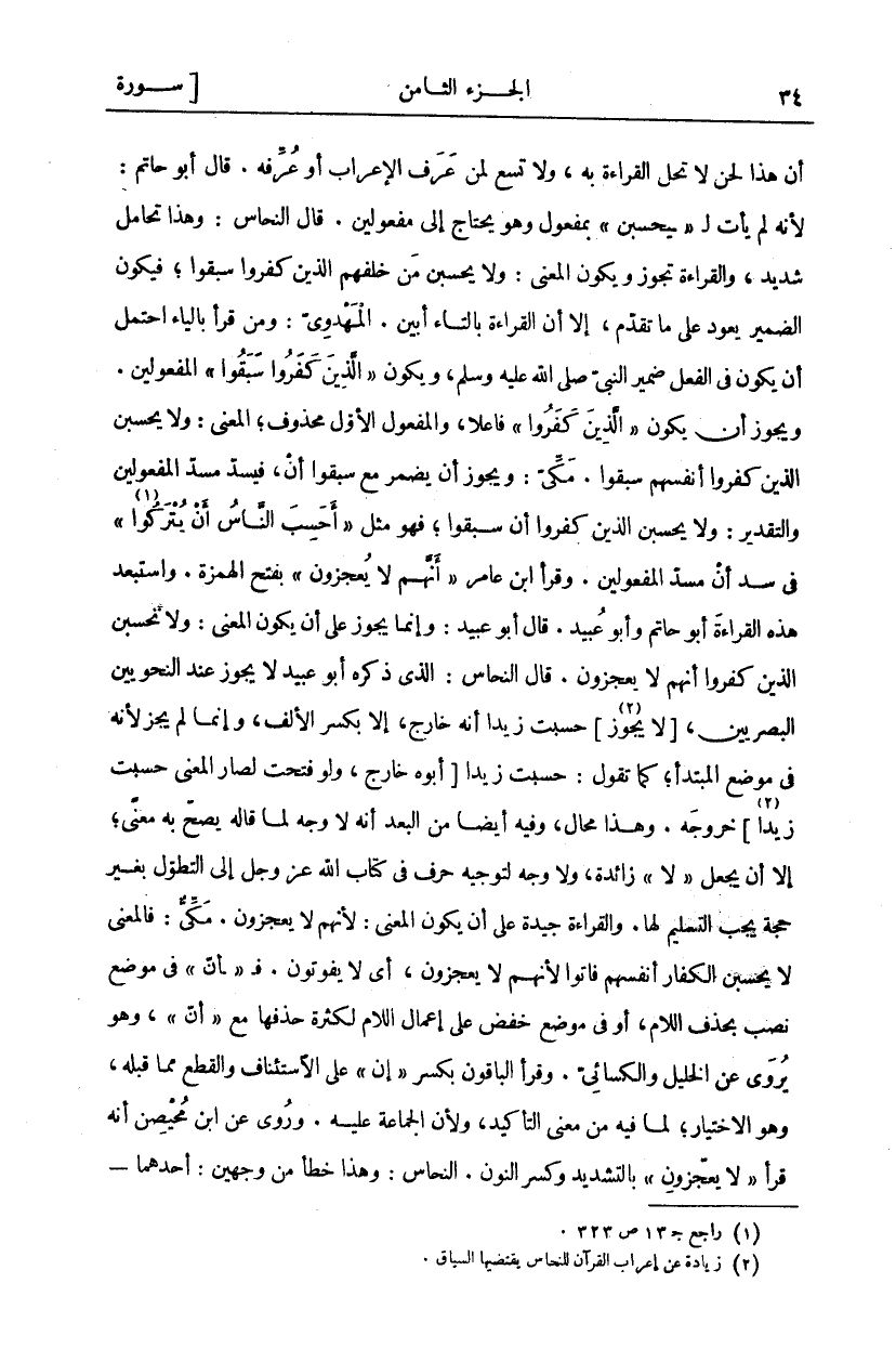 أَنَّ هَذَا لَحْنٌ لَا تَحِلُّ الْقِرَاءَةُ بِهِ، ولا تسع لِمَنْ عَرَفَ الْإِعْرَابَ أَوْ عُرِّفَهُ. قَالَ أَبُو حَاتِمٍ: لِأَنَّهُ لَمْ يَأْتِ لِ"- يَحْسَبَنَّ" بِمَفْعُولٍ وَهُوَ يَحْتَاجُ إِلَى مَفْعُولَيْنِ. قَالَ النَّحَّاسُ: وَهَذَا تَحَامُلٌ شَدِيدٌ، وَالْقِرَاءَةُ تَجُوزُ وَيَكُونُ الْمَعْنَى: وَلَا يَحْسَبَنَّ مَنْ خَلْفَهُمُ الَّذِينَ كَفَرُوا سَبَقُوا، فَيَكُونُ الضَّمِيرُ يَعُودُ عَلَى مَا تَقَدَّمَ، إِلَّا أَنَّ الْقِرَاءَةَ بِالتَّاءِ أَبْيَنُ. الْمَهْدَوِيُّ: وَمَنْ قَرَأَ بِالْيَاءِ احْتَمَلَ أَنْ يَكُونَ فِي الْفِعْلِ ضَمِيرُ النَّبِيِّ صَلَّى اللَّهُ عَلَيْهِ وَسَلَّمَ، وَيَكُونَ" الَّذِينَ كَفَرُوا سَبَقُوا" الْمَفْعُولَيْنِ. وَيَجُوزُ أَنْ يَكُونَ" الَّذِينَ كَفَرُوا" فَاعِلًا، وَالْمَفْعُولُ الْأَوَّلُ مَحْذُوفٌ، الْمَعْنَى: وَلَا يَحْسَبَنَّ الَّذِينَ كَفَرُوا أَنْفُسَهُمْ سَبَقُوا. مَكِّيٌّ: وَيَجُوزُ أَنْ يُضْمَرَ مَعَ سَبَقُوا أَنْ، فَيَسُدَّ مَسَدَّ الْمَفْعُولَيْنِ وَالتَّقْدِيرُ: وَلَا يَحْسَبَنَّ الَّذِينَ كَفَرُوا أَنْ سَبَقُوا، فهو مثل" أَحَسِبَ النَّاسُ أَنْ يُتْرَكُوا" «١» [العنكبوت: ٢] فِي سَدِّ أَنْ مَسَدَّ الْمَفْعُولَيْنِ. وَقَرَأَ ابْنُ عَامِرٍ" إِنَّهُمْ لَا يُعْجِزُونَ" بِفَتْحِ الْهَمْزَةِ. وَاسْتَبْعَدَ هَذِهِ الْقِرَاءَةَ أَبُو حَاتِمٍ وَأَبُو عُبَيْدٍ. قَالَ أَبُو عُبَيْدٍ: وَإِنَّمَا يَجُوزُ عَلَى أَنْ يَكُونَ الْمَعْنَى: وَلَا تَحْسَبَنَّ الَّذِينَ كَفَرُوا أَنَّهُمْ لَا يُعْجِزُونِ. قَالَ النَّحَّاسُ: الَّذِي ذَكَرَهُ أَبُو عُبَيْدٍ لَا يَجُوزُ عِنْدَ النَّحْوِيِّينَ الْبَصْرِيِّينَ، [لَا يَجُوزُ] «٢» حَسِبْتُ زَيْدًا أَنَّهُ خَارِجٌ، إِلَّا بِكَسْرِ الْأَلِفِ، وَإِنَّمَا لَمْ يَجُزْ لِأَنَّهُ فِي مَوْضِعِ الْمُبْتَدَأِ، كَمَا تَقُولُ: حَسِبْتُ زَيْدًا [أَبُوهُ خَارِجٌ، وَلَوْ فَتَحْتَ لَصَارَ الْمَعْنَى حَسِبْتُ زَيْدًا] «٣» خُرُوجَهُ. وَهَذَا مُحَالٌ، وَفِيهِ أَيْضًا مِنَ الْبُعْدِ أَنَّهُ لَا وَجْهَ لِمَا قَالَهُ يَصِحُّ بِهِ مَعْنًى، إِلَّا أَنْ يَجْعَلَ" لَا" زَائِدَةً، وَلَا وَجْهَ لِتَوْجِيهِ حَرْفٍ فِي كِتَابِ اللَّهِ عَزَّ وَجَلَّ إِلَى التَّطَوُّلِ بِغَيْرِ حُجَّةٍ يَجِبُ التَّسْلِيمُ لَهَا. وَالْقِرَاءَةُ جَيِّدَةٌ عَلَى أَنْ يَكُونَ الْمَعْنَى: لِأَنَّهُمْ لَا يُعْجِزُونِ. مَكِّيٌّ: فَالْمَعْنَى لَا يَحْسَبَنَّ الْكُفَّارُ أَنْفُسَهُمْ فَاتُوا لِأَنَّهُمْ لَا يُعْجِزُونِ، أَيْ لَا يَفُوتُونَ. فَ"- أَنَّ" فِي مَوْضِعِ نَصْبٍ بِحَذْفِ اللَّامِ، أَوْ فِي مَوْضِعِ خَفْضٍ عَلَى إِعْمَالِ اللَّامِ لِكَثْرَةِ حَذْفِهَا مَعَ" أَنَّ"، وَهُوَ يُرْوَى عَنِ الْخَلِيلِ وَالْكِسَائِيِّ. وَقَرَأَ الْبَاقُونَ بِكَسْرِ" إِنَّ" عَلَى الِاسْتِئْنَافِ وَالْقَطْعِ مِمَّا قَبْلَهُ، وَهُوَ الِاخْتِيَارُ، لِمَا فِيهِ مِنْ مَعْنَى التَّأْكِيدِ، وَلِأَنَّ الْجَمَاعَةَ عَلَيْهِ. وَرُوِيَ عَنِ ابْنِ مُحَيْصِنٍ أَنَّهُ قَرَأَ" لَا يُعَجِّزُونِ" بِالتَّشْدِيدِ وَكَسْرِ النُّونِ. النَّحَّاسُ: وَهَذَا خَطَأٌ من وجهين: أحدهما-