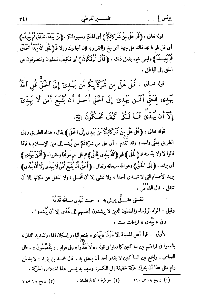 قُلْ هَلْ مِنْ شُرَكائِكُمْ مَنْ يَهْدِي إِلَى الْحَقِّ قُلِ اللَّهُ يَهْدِي لِلْحَقِّ أَفَمَنْ يَهْدِي إِلَى الْحَقِّ أَحَقُّ أَنْ يُتَّبَعَ أَمَّنْ لَا يَهِدِّي إِلاَّ أَنْ يُهْدى فَما لَكُمْ كَيْفَ تَحْكُمُونَ (٣٥)