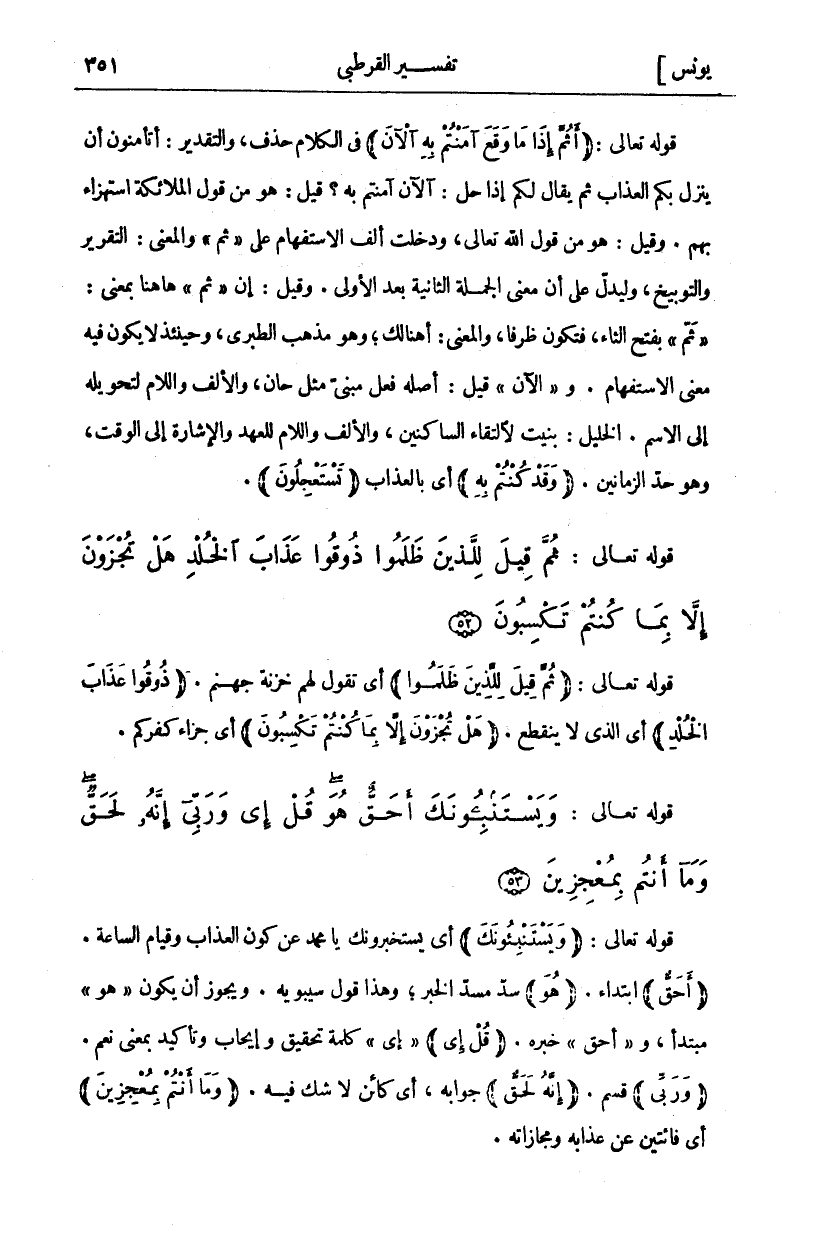 قَوْلُهُ تَعَالَى: (أَثُمَّ إِذا مَا وَقَعَ آمَنْتُمْ بِهِ آلْآنَ) فِي الْكَلَامِ حَذْفٌ، وَالتَّقْدِيرُ: أَتَأْمَنُونَ أَنْ يَنْزِلَ بِكُمُ الْعَذَابُ ثُمَّ يُقَالُ لَكُمْ إِذَا حَلَّ: الْآنَ آمَنْتُمْ بِهِ؟ قِيلَ: هُوَ مِنْ قَوْلِ الْمَلَائِكَةِ اسْتِهْزَاءً بِهِمْ. وَقِيلَ: هُوَ مِنْ قَوْلِ اللَّهِ تَعَالَى، وَدَخَلَتْ أَلِفُ الِاسْتِفْهَامِ عَلَى" ثُمَّ" وَالْمَعْنَى: التَّقْرِيرُ وَالتَّوْبِيخُ، وَلِيَدُلَّ عَلَى أَنَّ مَعْنَى الْجُمْلَةِ الثَّانِيَةِ بَعْدَ الْأُولَى. وَقِيلَ: إِنَّ" ثُمَّ" ها هنا بِمَعْنَى:" ثُمَّ" بِفَتْحِ الثَّاءِ، فَتَكُونُ ظَرْفًا، وَالْمَعْنَى: أَهُنَالِكَ، وَهُوَ مَذْهَبُ الطَّبَرِيِّ، وَحِينَئِذٍ لَا يَكُونُ فِيهِ مَعْنَى الِاسْتِفْهَامِ. وَ" آلْآنَ" قِيلَ: أَصْلُهُ فِعْلٌ مَبْنِيٌّ مِثْلُ حَانَ، وَالْأَلِفُ وَاللَّامُ لِتَحْوِيلِهِ إِلَى الِاسْمِ. الْخَلِيلُ: بُنِيَتْ لِالْتِقَاءِ السَّاكِنَيْنِ، وَالْأَلِفُ وَاللَّامُ لِلْعَهْدِ وَالْإِشَارَةِ إِلَى الْوَقْتِ، وَهُوَ حَدُّ الزَّمَانَيْنِ. (وَقَدْ كُنْتُمْ بِهِ) أَيْ بِالْعَذَابِ (تَسْتَعْجِلُونَ).
