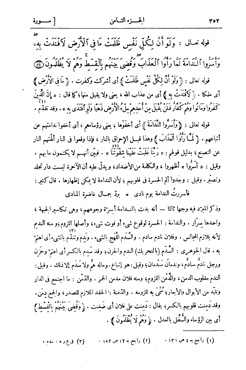 وَذَكَرَ الْمُبَرِّدُ فِيهِ وَجْهًا ثَالِثًا: أَنَّهُ بَدَتِ بِالنَّدَامَةِ أَسِرَّةُ وُجُوهِهِمْ، وَهِيَ تَكَاسِيرُ الْجَبْهَةِ، وَاحِدُهَا سِرَارٌ. وَالنَّدَامَةُ: الْحَسْرَةُ لِوُقُوعِ شي أو فوت شي، وَأَصْلُهَا اللُّزُومُ، وَمِنْهُ النَّدِيمُ لِأَنَّهُ يُلَازِمُ الْمَجَالِسَ. وَفُلَانٌ نَادِمٌ سَادِمٌ. وَالسَّدْمُ اللَّهَجُ بِالشَّيْءِ. وَنَدِمَ وَتَنَدَّمَ «٣» بِالشَّيْءِ أَيِ اهْتَمَّ بِهِ. قَالَ الْجَوْهَرِيُّ: السَّدَمُ (بِالتَّحْرِيكِ) النَّدَمُ وَالْحُزْنُ، وَقَدْ سَدِمَ بِالْكَسْرِ أَيِ اهْتَمَّ وَحَزِنَ وَرَجُلٌ نَادِمٌ سَادِمٌ، وَنَدْمَانُ سَدْمَانُ، وَقِيلَ: هُوَ إِتْبَاعٌ. وَمَا لَهُ هَمٌّ وَلَا سَدْمٌ إِلَّا ذَلِكَ. وَقِيلَ: النَّدَمُ مَقْلُوبُ الدَّمَنُ، وَالدَّمَنُ اللُّزُومُ، وَمِنْهُ فُلَانٌ مُدْمِنُ الْخَمْرِ. وَالدِّمْنُ: مَا اجْتَمَعَ فِي الدَّارِ وَتَلَبَّدَ مِنَ الْأَبْوَالِ وَالْأَبْعَارِ، سُمِّيَ بِهِ لِلُزُومِهِ. وَالدِّمْنَةُ: الْحِقْدُ الْمُلَازِمُ لِلصَّدْرِ، وَالْجَمْعُ دِمَنٌ. وَقَدْ دَمِنَتْ قُلُوبُهُمْ بِالْكَسْرِ، يُقَالُ: دَمِنْتُ عَلَى فُلَانٍ أَيْ ضَغِنْتُ. (وَقُضِيَ بَيْنَهُمْ بِالْقِسْطِ) أَيْ بَيْنَ الرُّؤَسَاءِ وَالسُّفْلِ بالعدل. (وَهُمْ لا يُظْلَمُونَ).