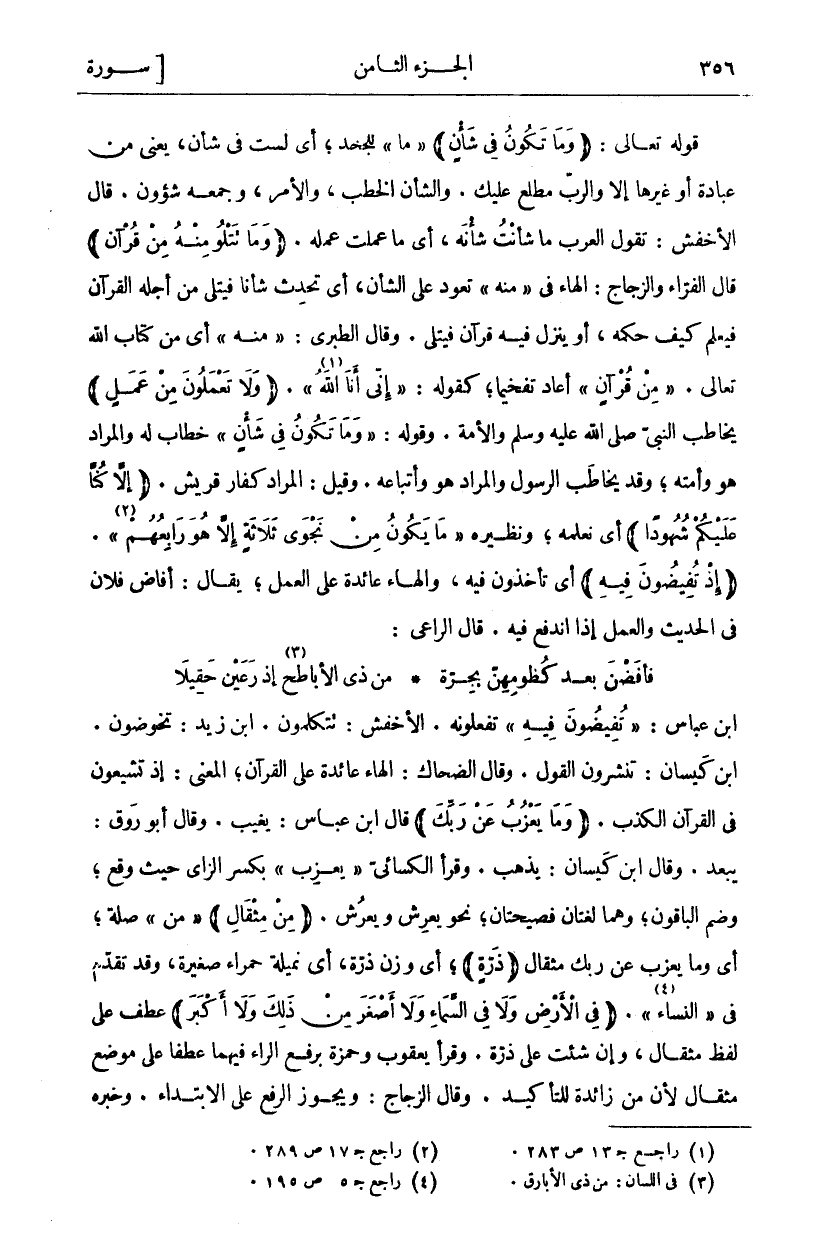ابْنُ عَبَّاسٍ:" تُفِيضُونَ فِيهِ" تَفْعَلُونَهُ. الْأَخْفَشُ: تَتَكَلَّمُونَ. ابْنُ زَيْدٍ: تَخُوضُونَ. ابْنُ كَيْسَانَ: تَنْشُرُونَ الْقَوْلَ. وَقَالَ الضَّحَّاكُ: الْهَاءُ عَائِدَةٌ عَلَى الْقُرْآنِ، الْمَعْنَى: إِذْ تُشِيعُونَ فِي الْقُرْآنِ الْكَذِبَ. (وَمَا يَعْزُبُ عَنْ رَبِّكَ) قَالَ ابْنُ عَبَّاسٍ: يَغِيبُ. وَقَالَ أَبُو رَوْقٍ: يَبْعُدُ. وَقَالَ ابْنُ كَيْسَانَ: يَذْهَبُ. وَقَرَأَ الْكِسَائِيُّ" يَعْزِبُ" بِكَسْرِ الزَّايِ حَيْثُ وَقَعَ، وَضَمَّ الْبَاقُونَ، وَهُمَا لُغَتَانِ فَصِيحَتَانِ، نَحْوَ يَعْرِشُ وَيَعْرُشُ. (مِنْ مِثْقَالِ) " مِنْ" صِلَةٌ، أَيْ وَمَا يَعْزُبُ عَنْ رَبِّكَ مِثْقَالُ (ذَرَّةٍ) أَيْ وَزْنُ ذَرَّةٍ، أَيْ نُمَيْلَةٌ حَمْرَاءُ صَغِيرَةٌ، وَقَدْ تَقَدَّمَ فِي (النِّسَاءِ) «٤». (فِي الْأَرْضِ وَلَا فِي السَّمَاءِ وَلَا أَصْغَرَ مِنْ ذَلِكَ وَلَا أَكْبَرَ) عَطْفٌ عَلَى لَفْظِ مِثْقَالِ، وَإِنْ شِئْتَ عَلَى ذَرَّةٍ. وَقَرَأَ يَعْقُوبُ وَحَمْزَةُ بِرَفْعِ الرَّاءِ فِيهِمَا عَطْفًا عَلَى مَوْضِعِ مِثْقَالِ لِأَنَّ مِنْ زَائِدَةٌ لِلتَّأْكِيدِ. وَقَالَ الزَّجَّاجُ: وَيَجُوزُ الرَّفْعُ على الابتداء. وخبره