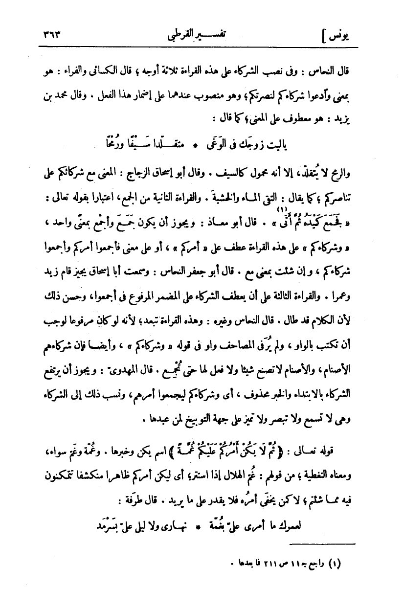 وَالرُّمْحُ لَا يُتَقَلَّدُ، إِلَّا أَنَّهُ مَحْمُولٌ كَالسَّيْفِ. وَقَالَ أَبُو إِسْحَاقَ الزَّجَّاجُ: الْمَعْنَى مَعَ شُرَكَائِكُمْ عَلَى تناصر كم، كَمَا يُقَالُ: الْتَقَى الْمَاءُ وَالْخَشَبَةُ. وَالْقِرَاءَةُ الثَّانِيَةُ مِنَ الْجَمْعِ، اعْتِبَارًا بِقَوْلِهِ تَعَالَى:" فَجَمَعَ كَيْدَهُ ثُمَّ أَتى " «١» [طه: ٦٠]. قَالَ أَبُو مُعَاذٍ: وَيَجُوزُ أَنْ يَكُونَ جَمَعَ وَأَجْمَعَ بِمَعْنًى وَاحِدٍ،" وَشُرَكاءَكُمْ" عَلَى هَذِهِ الْقِرَاءَةِ عَطْفٌ عَلَى" أَمْرَكُمْ"، أَوْ عَلَى مَعْنَى فَأَجْمِعُوا أَمْرَكُمْ وَأَجْمِعُوا شُرَكَاءَكُمْ، وَإِنْ شِئْتَ بِمَعْنَى مَعَ. قَالَ أَبُو جَعْفَرٍ النَّحَّاسُ: وَسَمِعْتُ أَبَا إِسْحَاقَ يُجِيزُ قَامَ زَيْدٌ وَعَمْرًا. وَالْقِرَاءَةُ الثَّالِثَةُ عَلَى أَنْ يَعْطِفَ الشُّرَكَاءَ عَلَى الْمُضْمَرِ الْمَرْفُوعِ فِي أَجْمِعُوا، وَحَسُنَ ذَلِكَ لِأَنَّ الْكَلَامَ قَدْ طَالَ. قَالَ النَّحَّاسُ وَغَيْرُهُ: وَهَذِهِ الْقِرَاءَةُ تُبْعَدُ، لِأَنَّهُ لَوْ كَانَ مَرْفُوعًا لَوَجَبَ أَنْ تُكْتَبَ بِالْوَاوِ، وَلَمْ يُرَ فِي الْمَصَاحِفِ وَاوٌ فِي قَوْلِهِ" وَشُرَكاءَكُمْ"، وأيضا فإن شركاء هم الْأَصْنَامُ، وَالْأَصْنَامُ لَا تَصْنَعُ شَيْئًا وَلَا فِعْلَ لَهَا حَتَّى تُجْمَعَ. قَالَ الْمَهْدَوِيُّ: وَيَجُوزُ أَنْ يَرْتَفِعَ الشُّرَكَاءُ بِالِابْتِدَاءِ وَالْخَبَرُ مَحْذُوفٌ، أَيْ وَشُرَكَاءَكُمْ لِيُجْمِعُوا أَمْرَهُمْ، وَنُسِبَ ذَلِكَ إِلَى الشُّرَكَاءِ وَهِيَ لَا تَسْمَعُ وَلَا تُبْصِرُ وَلَا تُمَيِّزُ عَلَى جهة التوبيخ لمن عبد ها. قَوْلُهُ تَعَالَى: (ثُمَّ لَا يَكُنْ أَمْرُكُمْ عَلَيْكُمْ غُمَّةً) اسم يكن وخبرها. وغمة وَغَمٌّ سَوَاءٌ، وَمَعْنَاهُ التَّغْطِيَةُ، مِنْ قَوْلِهِمْ: غُمَّ الْهِلَالُ إِذَا اسْتَتَرَ، أَيْ لِيَكُنْ أَمْرُكُمْ ظَاهِرًا مُنْكَشِفًا تَتَمَكَّنُونَ فِيهِ مِمَّا شِئْتُمْ، لَا كَمَنْ يَخْفَى أَمْرُهُ فَلَا يَقْدِرُ عَلَى مَا يُرِيدُ. قَالَ طَرَفَةُ: