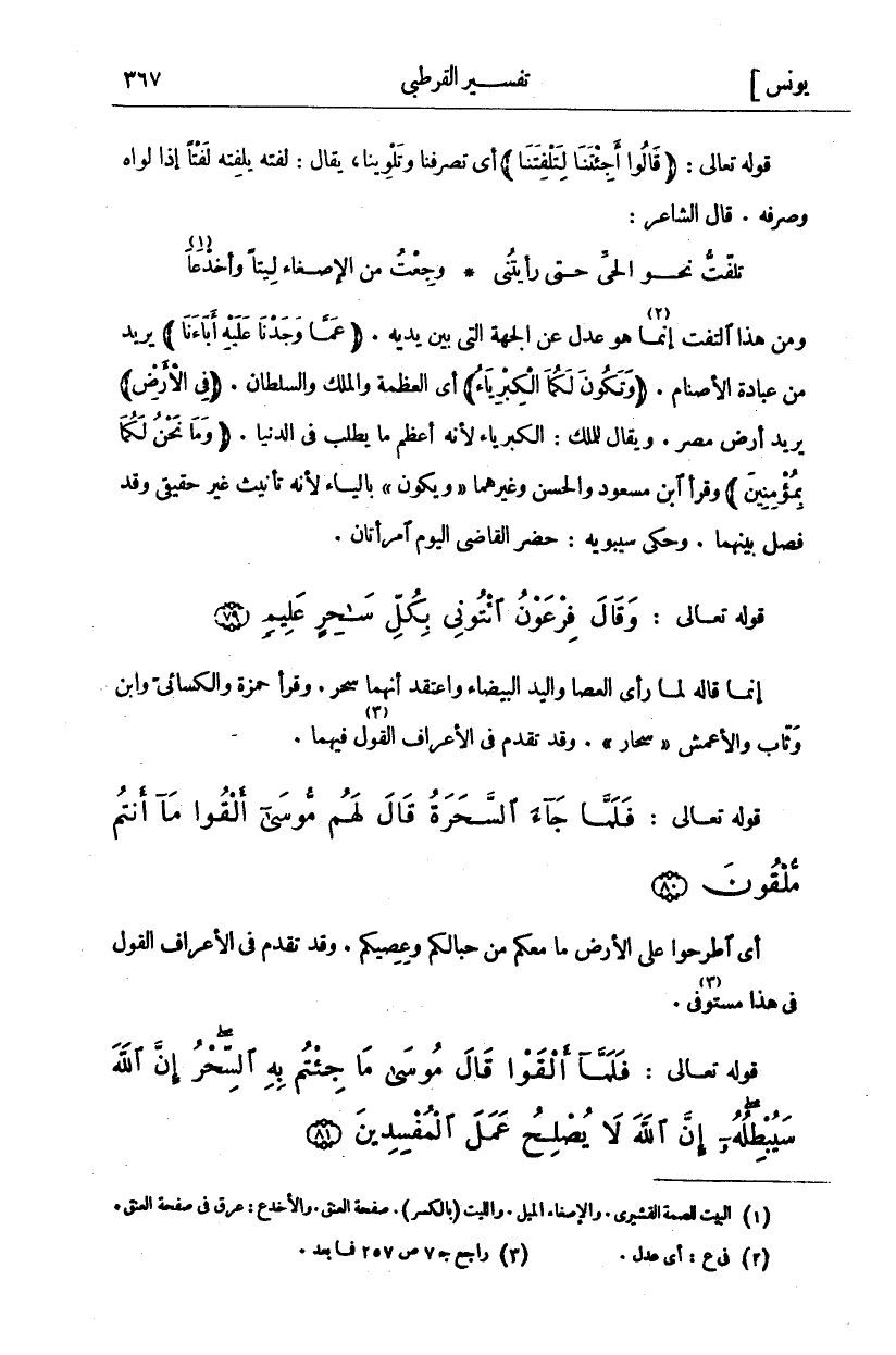 وَمِنْ هَذَا الْتَفَتَ «٢» إِنَّمَا هُوَ عَدَلَ عَنِ الْجِهَةِ الَّتِي بَيْنَ يَدَيْهِ. (عَمَّا وَجَدْنا عَلَيْهِ آباءَنا) يُرِيدُ مِنْ عِبَادَةِ الْأَصْنَامِ. (وَتَكُونَ لَكُمَا الْكِبْرِياءُ) أَيِ الْعَظَمَةُ وَالْمُلْكُ وَالسُّلْطَانُ. (فِي الْأَرْضِ) يُرِيدُ أَرْضَ مِصْرَ. وَيُقَالُ لِلْمُلْكِ: الْكِبْرِيَاءُ لِأَنَّهُ أَعْظَمُ مَا يُطْلَبُ فِي الدُّنْيَا." وَما نَحْنُ لَكُما بِمُؤْمِنِينَ" وَقَرَأَ ابْنُ مَسْعُودٍ وَالْحَسَنُ وَغَيْرُهُمَا" وَيَكُونُ" بِالْيَاءِ لِأَنَّهُ تَأْنِيثٌ غَيْرُ حَقِيقِيٍّ وَقَدْ فُصِلَ بَيْنَهُمَا. وَحَكَى سِيبَوَيْهِ: حَضَرَ الْقَاضِي الْيَوْمَ امْرَأَتَانِ.