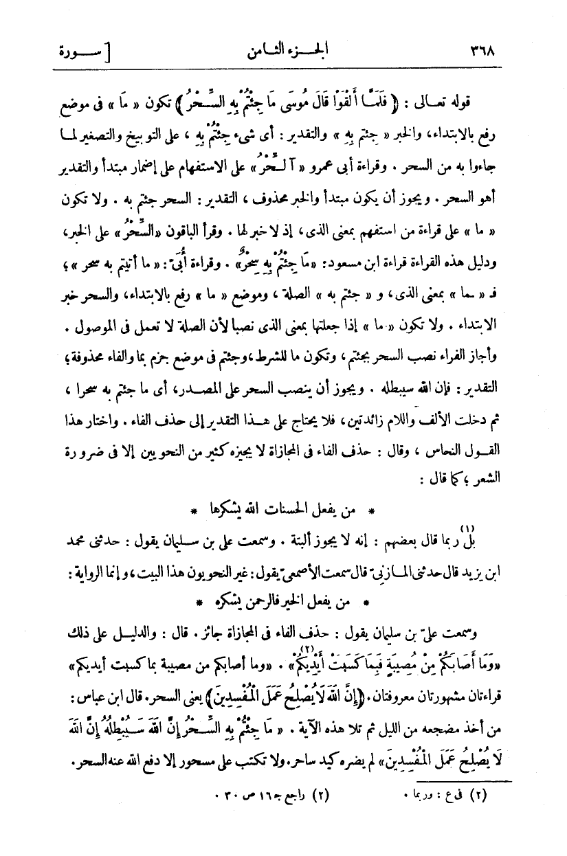 وَسَمِعْتُ عَلِيَّ بْنَ سُلَيْمَانَ يَقُولُ: حَذْفُ الْفَاءِ فِي الْمُجَازَاةِ جَائِزٌ. قَالَ: وَالدَّلِيلُ عَلَى ذَلِكَ" وَما أَصابَكُمْ مِنْ مُصِيبَةٍ فَبِما كَسَبَتْ أَيْدِيكُمْ" «٢»." وَما أَصابَكُمْ مِنْ مُصِيبَةٍ فَبِما كَسَبَتْ أَيْدِيكُمْ" قِرَاءَتَانِ مَشْهُورَتَانِ مَعْرُوفَتَانِ. (إِنَّ اللَّهَ لَا يُصْلِحُ عَمَلَ الْمُفْسِدِينَ) يَعْنِي السِّحْرَ. قَالَ ابْنُ عَبَّاسٍ: مَنْ أَخَذَ مَضْجَعَهُ مِنَ اللَّيْلِ ثُمَّ تَلَا هَذِهِ الْآيَةَ. (مَا جِئْتُمْ بِهِ السِّحْرُ إِنَّ اللَّهَ سَيُبْطِلُهُ إِنَّ اللَّهَ لَا يُصْلِحُ عَمَلَ الْمُفْسِدِينَ) لَمْ يَضُرَّهُ كَيْدُ سَاحِرٍ. وَلَا تُكْتَبُ عَلَى مَسْحُورٍ إِلَّا دَفَعَ اللَّهُ عنه السحر.