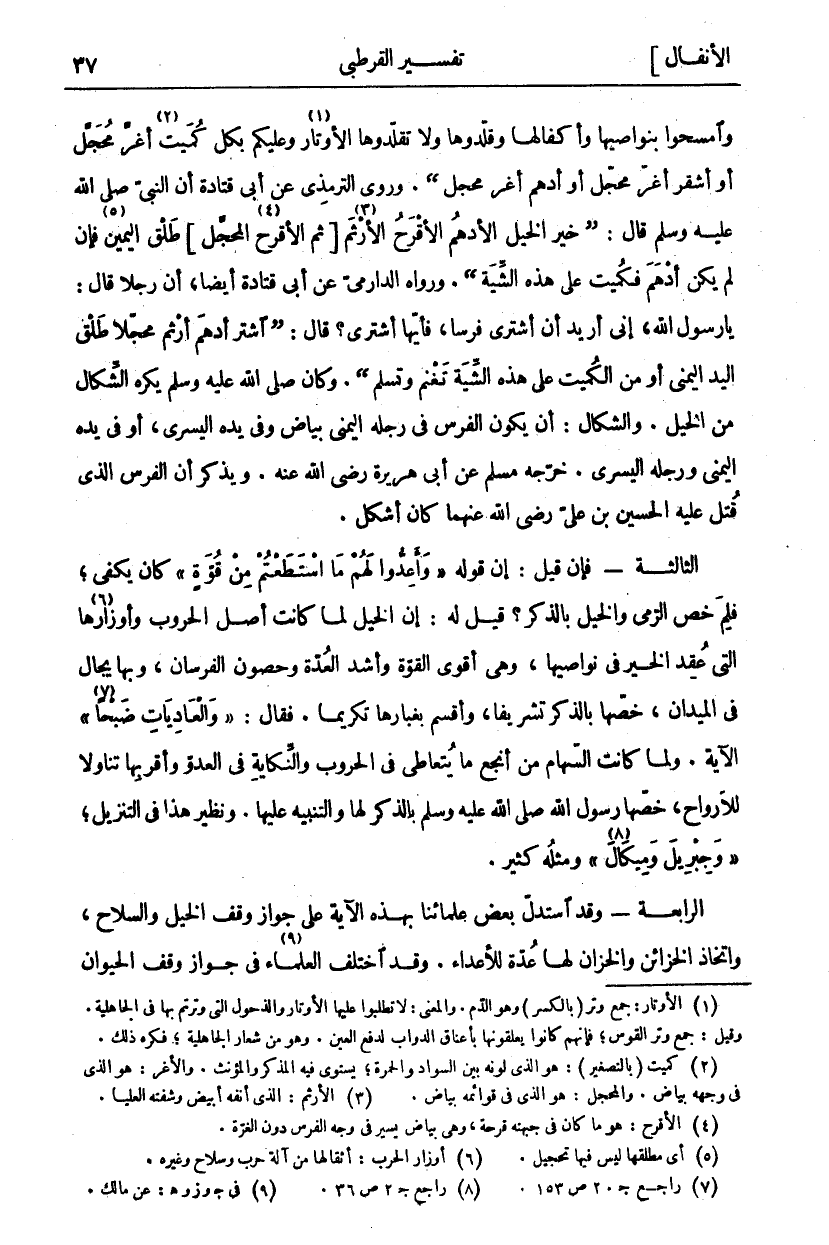 وَامْسَحُوا بِنَوَاصِيهَا وَأَكْفَالِهَا وَقَلِّدُوهَا وَلَا تُقَلِّدُوهَا الْأَوْتَارَ «١» وَعَلَيْكُمْ بِكُلِّ كُمَيْتٍ «٢» أَغَرَّ مُحَجَّلٍ أَوْ أَشْقَرَ أَغَرَّ مُحَجَّلٍ أَوْ أَدْهَمَ أَغَرَّ مُحَجَّلٍ (. وَرَوَى التِّرْمِذِيُّ عَنْ أَبِي قَتَادَةَ أَنَّ النَّبِيَّ صَلَّى اللَّهُ عَلَيْهِ وَسَلَّمَ قَالَ:) خَيْرُ الْخَيْلِ الْأَدْهَمُ الْأَقْرَحُ الْأَرْثَمُ «٣» [ثُمَّ الْأَقْرَحُ الْمُحَجَّلُ] «٤» طَلْقُ الْيَمِينِ «٥» فَإِنْ لَمْ يَكُنْ أَدْهَمَ فَكُمَيْتٌ عَلَى هَذِهِ الشِّيَةِ (. وَرَوَاهُ الدَّارِمِيُّ عَنْ أَبِي قَتَادَةَ أَيْضًا، أَنَّ رَجُلًا قَالَ: يَا رَسُولَ اللَّهِ، إِنِّي أُرِيدُ أَنْ أَشْتَرِيَ فَرَسًا، فَأَيُّهَا أَشْتَرِي؟ قَالَ: (اشْتَرِ أَدْهَمَ أَرْثَمَ مُحَجَّلًا طَلْقَ الْيَدِ الْيُمْنَى أَوْ مِنَ الْكُمَيْتِ عَلَى هَذِهِ الشِّيَةِ تَغْنَمُ وَتَسْلَمْ). وَكَانَ صَلَّى اللَّهُ عَلَيْهِ وَسَلَّمَ يَكْرَهُ الشِّكَالَ مِنَ الْخَيْلِ. وَالشِّكَالُ: أَنْ يَكُونَ الْفَرَسُ فِي رِجْلِهِ الْيُمْنَى بَيَاضٌ وَفِي يَدِهِ الْيُسْرَى، أَوْ فِي يَدِهِ الْيُمْنَى وَرِجْلِهِ الْيُسْرَى. خَرَّجَهُ مُسْلِمٌ عَنْ أَبِي هُرَيْرَةَ رَضِيَ اللَّهُ عَنْهُ. وَيُذْكَرُ أَنَّ الْفَرَسَ الَّذِي قُتِلَ عَلَيْهِ الْحُسَيْنُ بْنُ عَلِيٍّ رَضِيَ اللَّهُ عَنْهُمَا كَانَ أَشْكَلَ. الثَّالِثَةُ- فَإِنْ قِيلَ: إِنَّ قَوْلَهُ" وَأَعِدُّوا لَهُمْ مَا اسْتَطَعْتُمْ مِنْ قُوَّةٍ" كَانَ يَكْفِي، فَلِمَ خَصَّ الرَّمْيَ وَالْخَيْلَ بِالذِّكْرِ؟ قِيلَ لَهُ: إِنَّ الْخَيْلَ لَمَّا كَانَتْ أَصْلَ الْحُرُوبِ وَأَوْزَارَهَا «٦» الَّتِي عُقِدَ الْخَيْرُ فِي نَوَاصِيهَا، وَهِيَ أَقْوَى الْقُوَّةِ وَأَشَدُّ الْعُدَّةِ وَحُصُونُ الْفُرْسَانِ، وَبِهَا يُجَالُ فِي الْمَيْدَانِ، خَصَّهَا بِالذِّكْرِ تَشْرِيفًا، وَأَقْسَمَ بِغُبَارِهَا تَكْرِيمًا. فقال:" وَالْعادِياتِ ضَبْحاً" «٧» [العاديات: ١] الْآيَةَ. وَلَمَّا كَانَتِ السِّهَامُ مِنْ أَنْجَعِ مَا يُتَعَاطَى فِي الْحُرُوبِ وَالنِّكَايَةِ فِي الْعَدُوِّ وَأَقْرَبِهَا تَنَاوُلًا لِلْأَرْوَاحِ، خَصَّهَا رَسُولُ اللَّهِ صَلَّى اللَّهُ عَلَيْهِ وَسَلَّمَ بِالذِّكْرِ لَهَا وَالتَّنْبِيهِ عَلَيْهَا. وَنَظِيرُ هذا في التنزيل،" وَجِبْرِيلَ وَمِيكالَ" «٨» [البقرة: ٩٨] وَمِثْلُهُ كَثِيرٌ. الرَّابِعَةُ- وَقَدِ اسْتَدَلَّ بَعْضُ عُلَمَائِنَا بِهَذِهِ الْآيَةِ عَلَى جَوَازِ وَقْفِ الْخَيْلِ وَالسِّلَاحِ، وَاتِّخَاذِ الْخَزَائِنِ وَالْخُزَّانِ لَهَا عُدَّةً لِلْأَعْدَاءِ. وَقَدِ اختلف العلماء «٩» في جواز وقف الحيوان