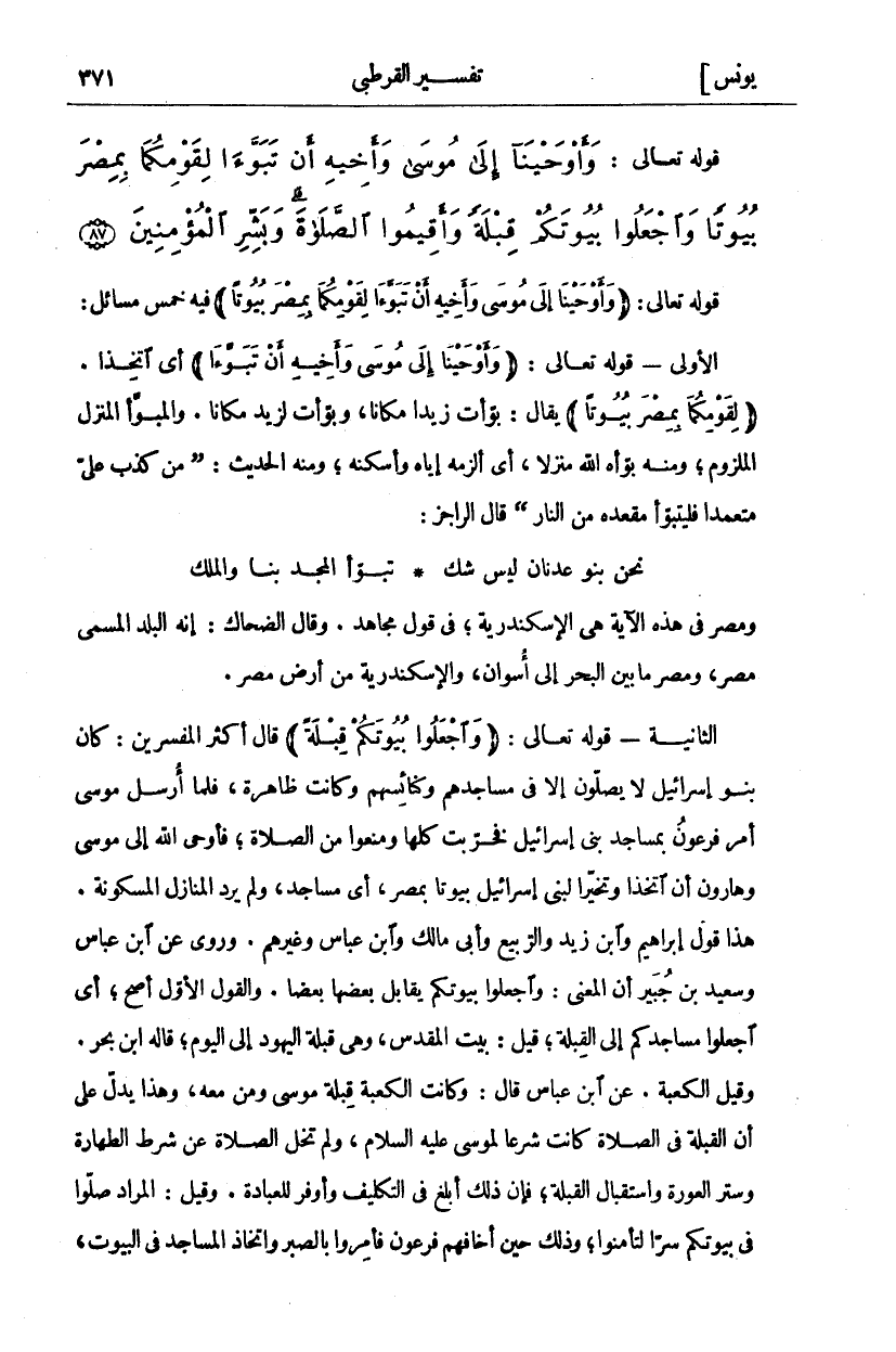 وَمِصْرُ فِي هَذِهِ الْآيَةِ هِيَ الْإِسْكَنْدَرِيَّةُ، فِي قَوْلِ مُجَاهِدٍ. وَقَالَ الضَّحَّاكُ: إِنَّهُ الْبَلَدُ الْمُسَمَّى مِصْرُ، وَمِصْرُ مَا بَيْنَ الْبَحْرِ إِلَى أُسْوَانَ، وَالْإِسْكَنْدَرِيَّةُ مِنْ أَرْضِ مِصْرَ. الثَّانِيَةُ- قَوْلُهُ تَعَالَى: (وَاجْعَلُوا بُيُوتَكُمْ قِبْلَةً) قَالَ أَكْثَرُ الْمُفَسِّرِينَ: كَانَ بَنُو إِسْرَائِيلَ لَا يُصَلُّونَ إِلَّا فِي مَسَاجِدِهِمْ وَكَنَائِسِهِمْ وَكَانَتْ ظَاهِرَةً، فَلَمَّا أُرْسِلَ مُوسَى أَمَرَ فِرْعَوْنُ بِمَسَاجِدِ بَنِي إِسْرَائِيلَ فَخُرِّبَتْ كُلُّهَا وَمُنِعُوا مِنَ الصَّلَاةِ، فَأَوْحَى اللَّهُ إلى موسى وهارون أن اتخذا لِبَنِي إِسْرَائِيلَ بُيُوتًا بِمِصْرَ، أَيْ مَسَاجِدَ، وَلَمْ يُرِدِ الْمَنَازِلَ الْمَسْكُونَةَ. هَذَا قَوْلُ إِبْرَاهِيمَ وَابْنِ زَيْدٍ وَالرَّبِيعِ وَأَبِي مَالِكٍ وَابْنِ عَبَّاسٍ وَغَيْرِهِمْ. وَرُوِيَ عَنِ ابْنِ عَبَّاسٍ وَسَعِيدِ بْنِ جُبَيْرٍ أَنَّ الْمَعْنَى: وَاجْعَلُوا بُيُوتَكُمْ يُقَابِلُ بَعْضُهَا بَعْضًا. وَالْقَوْلُ الْأَوَّلُ أَصَحُّ، أَيِ اجْعَلُوا مَسَاجِدَكُمْ إِلَى الْقِبْلَةِ، قِيلَ: بَيْتُ الْمَقْدِسِ، وَهِيَ قِبْلَةُ الْيَهُودِ إِلَى الْيَوْمِ، قَالَهُ ابْنُ بَحْرٍ. وَقِيلَ الْكَعْبَةُ. عَنِ ابْنِ عَبَّاسٍ قَالَ: وَكَانَتِ الْكَعْبَةُ قِبْلَةَ مُوسَى وَمَنْ مَعَهُ، وَهَذَا يَدُلُّ عَلَى أَنَّ الْقِبْلَةَ فِي الصَّلَاةِ كَانَتْ شَرْعًا لِمُوسَى عَلَيْهِ السَّلَامُ، وَلَمْ تَخْلُ الصَّلَاةُ عَنْ شَرْطِ الطَّهَارَةِ وَسَتْرِ الْعَوْرَةِ وَاسْتِقْبَالِ الْقِبْلَةِ، فَإِنَّ ذَلِكَ أَبْلَغُ فِي التَّكْلِيفِ وَأَوْفَرُ لِلْعِبَادَةِ. وَقِيلَ: الْمُرَادُ صَلُّوا فِي بُيُوتِكُمْ سِرًّا لِتَأْمَنُوا، وَذَلِكَ حِينَ أَخَافَهُمْ فِرْعَوْنُ فَأُمِرُوا بِالصَّبْرِ وَاتِّخَاذِ الْمَسَاجِدِ فِي الْبُيُوتِ،