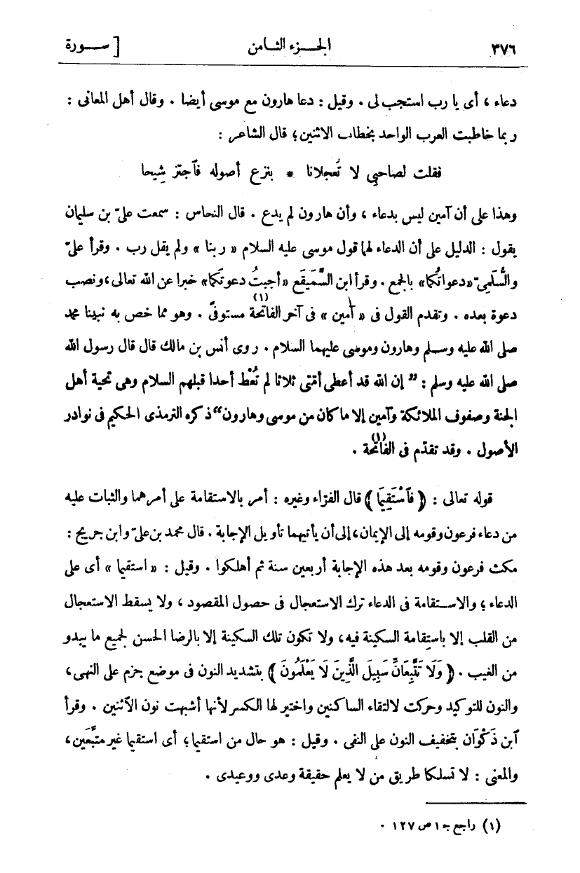 وَهَذَا عَلَى أَنَّ آمِينَ لَيْسَ بِدُعَاءٍ، وَأَنَّ هَارُونَ لَمْ يَدْعُ. قَالَ النَّحَّاسُ: سَمِعْتُ عَلِيَّ بْنَ سُلَيْمَانَ يَقُولُ: الدَّلِيلُ عَلَى أَنَّ الدُّعَاءَ لَهُمَا قَوْلُ مُوسَى عَلَيْهِ السَّلَامُ" رَبَّنا" وَلَمْ يَقُلْ رَبِّ. وَقَرَأَ عَلِيٌّ وَالسُّلَمِيُّ" دَعَوَاتُكُمَا" بِالْجَمْعِ. وَقَرَأَ ابْنُ السَّمَيْقَعِ" أَجَبْتُ دَعْوَتَكُمَا" خَبَرًا عَنِ اللَّهِ تَعَالَى، وَنَصَبَ دَعْوَةَ بَعْدَهُ. وَتَقَدَّمَ الْقَوْلُ فِي" آمِينَ" فِي آخِرِ الْفَاتِحَةِ «١» مُسْتَوْفًى. وَهُوَ مِمَّا خُصَّ بِهِ نَبِيُّنَا مُحَمَّدٌ صَلَّى اللَّهُ عَلَيْهِ وَسَلَّمَ وَهَارُونُ وَمُوسَى عَلَيْهِمَا السَّلَامُ. رَوَى أَنَسُ بْنُ مَالِكٍ قَالَ قَالَ رَسُولُ اللَّهِ صَلَّى اللَّهُ عَلَيْهِ وَسَلَّمَ: (إِنَّ اللَّهَ قَدْ أَعْطَى أُمَّتِي ثَلَاثًا لَمْ تُعْطَ أَحَدًا قَبْلَهُمُ السَّلَامَ وَهِيَ تَحِيَّةُ أَهْلِ الْجَنَّةِ وَصُفُوفُ الْمَلَائِكَةِ وَآمِينَ إِلَّا مَا كَانَ مِنْ مُوسَى وَهَارُونَ) ذَكَرَهُ التِّرْمِذِيُّ الْحَكِيمُ فِي نَوَادِرِ الْأُصُولِ. وَقَدْ تَقَدَّمَ فِي الْفَاتِحَةِ «٢». قَوْلُهُ تَعَالَى: (فَاسْتَقِيما) قَالَ الْفَرَّاءُ وَغَيْرُهُ: أَمْرٌ بِالِاسْتِقَامَةِ. عَلَى أَمْرِهِمَا وَالثَّبَاتِ عَلَيْهِ مِنْ دُعَاءِ فِرْعَوْنَ وَقَوْمِهِ إِلَى الْإِيمَانِ، إِلَى أَنْ يَأْتِيَهُمَا تَأْوِيلُ الْإِجَابَةِ. قَالَ مُحَمَّدُ بْنُ عَلِيٍّ وَابْنُ جُرَيْجٍ: مَكَثَ فِرْعَوْنُ وَقَوْمُهُ بَعْدَ هَذِهِ الْإِجَابَةِ أَرْبَعِينَ سنة ثم أهلكوا. وقيل:" فَاسْتَقِيما" أَيْ عَلَى الدُّعَاءِ، وَالِاسْتِقَامَةُ فِي الدُّعَاءِ تَرْكُ الِاسْتِعْجَالِ فِي حُصُولِ الْمَقْصُودِ، وَلَا يَسْقُطُ الِاسْتِعْجَالُ مِنَ الْقَلْبِ إِلَّا بِاسْتِقَامَةِ السَّكِينَةِ فِيهِ، وَلَا تَكُونُ تِلْكَ السَّكِينَةُ إِلَّا بِالرِّضَا الْحَسَنِ لِجَمِيعِ مَا يَبْدُو مِنَ الْغَيْبِ. (وَلا تَتَّبِعانِّ سَبِيلَ الَّذِينَ لَا يَعْلَمُونَ) بِتَشْدِيدِ النُّونِ فِي مَوْضِعِ جَزْمٍ عَلَى النَّهْيِ، وَالنُّونُ لِلتَّوْكِيدِ وَحُرِّكَتْ لِالْتِقَاءِ السَّاكِنَيْنِ وَاخْتِيرَ لَهَا الْكَسْرُ لِأَنَّهَا أَشْبَهَتْ نُونَ الِاثْنَيْنِ. وَقَرَأَ ابْنُ ذَكْوَانَ بِتَخْفِيفِ النُّونِ عَلَى النَّفْيِ. وَقِيلَ: هُوَ حَالٌ مِنِ اسْتَقِيمَا، أَيِ اسْتَقِيمَا غَيْرَ مُتَّبِعَيْنِ، وَالْمَعْنَى: لَا تَسْلُكَا طَرِيقَ من لا يعلم حقيقة وعدي ووعيدي.