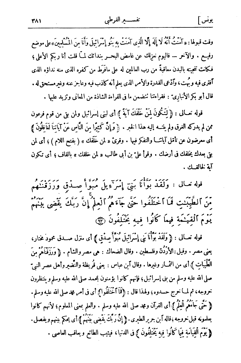 وَقْتُ قَبُولِهَا:" آمَنْتُ أَنَّهُ لَا إِلهَ إِلَّا الَّذِي آمَنَتْ بِهِ بَنُوا إِسْرائِيلَ وَأَنَا مِنَ الْمُسْلِمِينَ" [يونس: ٩٠] عَلَى مَوْضِعٍ رَفِيعٍ. وَالْآخَرُ- فَالْيَوْمَ نَعْزِلُكَ عَنْ غَامِضِ الْبَحْرِ بِنِدَائِكَ لَمَّا قُلْتَ أَنَا رَبُّكُمُ الْأَعْلَى، فَكَانَتْ تَنْجِيَتُهُ بِالْبَدَنِ مُعَاقَبَةً مِنْ رَبِّ الْعَالَمِينَ لَهُ عَلَى مَا فَرَطَ مِنْ كُفْرِهِ الَّذِي مِنْهُ نِدَاؤُهُ الَّذِي افْتَرَى فِيهِ وَبَهَتَ، وَادَّعَى الْقُدْرَةَ وَالْأَمْرَ الَّذِي يُعْلَمُ أَنَّهُ كَاذِبٌ فِيهِ وَعَاجِزٌ عَنْهُ وَغَيْرُ مُسْتَحِقٍّ لَهُ. قَالَ أَبُو بَكْرٍ الْأَنْبَارِيُّ: فَقِرَاءَتُنَا تَتَضَمَّنُ مَا فِي الْقِرَاءَةِ الشَّاذَّةِ مِنَ الْمَعَانِي وَتَزِيدُ عَلَيْهَا. قَوْلُهُ تَعَالَى: (لِتَكُونَ لِمَنْ خَلْفَكَ آيَةً) أَيْ لِبَنِي إِسْرَائِيلَ وَلِمَنْ بَقِيَ مِنْ قَوْمِ فِرْعَوْنَ مِمَّنْ لَمْ يُدْرِكْهُ الْغَرَقُ وَلَمْ يَنْتَهِ إِلَيْهِ هَذَا الْخَبَرُ. (وَإِنَّ كَثِيراً مِنَ النَّاسِ عَنْ آياتِنا لَغافِلُونَ) أَيْ مُعْرِضُونَ عَنْ تَأَمُّلِ آيَاتِنَا وَالتَّفَكُّرِ فيها. وقرى" لِمَنْ خَلَفَكَ" (بِفَتْحِ اللَّامِ)، أَيْ لِمَنْ بَقِيَ بَعْدَكَ يَخْلُفُكَ فِي أَرْضِكَ. وَقَرَأَ عَلِيُّ بْنُ أَبِي طَالِبٍ" لِمَنْ خَلَقَكَ" بِالْقَافِ، أَيْ تَكُونُ آية لخالقك.