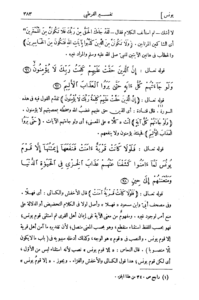 قَوْلُهُ تعالى: (فَلَوْلا كانَتْ قَرْيَةٌ آمَنَتْ) قَالَ الْأَخْفَشُ وَالْكِسَائِيُّ: أَيْ فَهَلَّا. وَفِي مُصْحَفِ أُبَيٍّ وَابْنِ مَسْعُودٍ" فَهَلَّا" وَأَصْلُ لَوْلَا فِي الْكَلَامِ التَّحْضِيضُ أَوِ الدَّلَالَةُ عَلَى مَنْعِ أَمْرٍ لِوُجُودِ غَيْرِهِ. وَمَفْهُومٌ مِنْ مَعْنَى الْآيَةِ نَفْيُ إِيمَانِ أَهْلِ الْقُرَى ثُمَّ اسْتَثْنَى قَوْمَ يُونُسَ، فَهُوَ بِحَسْبِ اللَّفْظِ اسْتِثْنَاءٌ مُنْقَطِعٌ، وَهُوَ بِحَسْبِ الْمَعْنَى مُتَّصِلٌ، لِأَنَّ تَقْدِيرَهُ مَا آمَنَ أَهْلُ قَرْيَةٍ إِلَّا قَوْمَ يُونُسَ. وَالنَّصْبُ فِي" قَوْمَ" هُوَ الْوَجْهُ، وَكَذَلِكَ أَدْخَلَهُ سيبويه في (باب مالا يَكُونُ إِلَّا مَنْصُوبًا). قَالَ النَّحَّاسُ:" إِلَّا قَوْمَ يُونُسَ" نُصِبَ لِأَنَّهُ اسْتِثْنَاءٌ لَيْسَ مِنَ الْأَوَّلِ، أَيْ لَكِنَّ قَوْمَ يُونُسَ، هَذَا قَوْلُ الْكِسَائِيِّ والأخفش والفراء. ويجوز." إِلَّا قَوْمَ يُونُسَ"