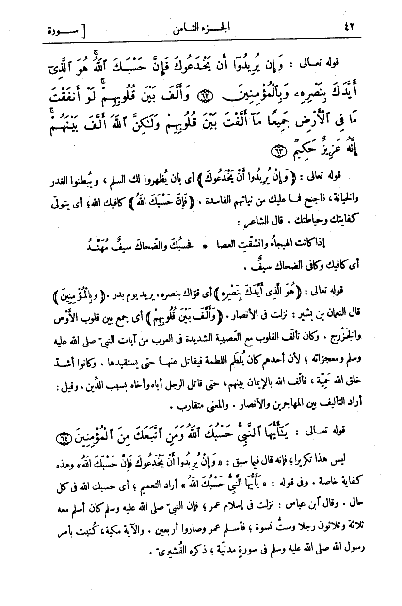 لَيْسَ هَذَا تَكْرِيرًا فَإِنَّهُ قَالَ فِيمَا سَبَقَ: (وَإِنْ يُرِيدُوا أَنْ يَخْدَعُوكَ فَإِنَّ حَسْبَكَ اللَّهُ) وَهَذِهِ كِفَايَةٌ خَاصَّةٌ. وَفِي قَوْلِهِ: (يَا أَيُّهَا النَّبِيُّ حَسْبُكَ اللَّهُ) أَرَادَ التَّعْمِيمَ، أَيْ حَسْبُكَ اللَّهُ فِي كُلِّ حَالٍ وَقَالَ ابْنُ عَبَّاسٍ: نَزَلَتْ فِي إِسْلَامِ عُمَرَ فَإِنَّ النَّبِيَّ صَلَّى اللَّهُ عَلَيْهِ وَسَلَّمَ كَانَ أَسْلَمَ مَعَهُ ثَلَاثَةٌ وَثَلَاثُونَ رَجُلًا وَسِتُّ نِسْوَةٍ، فَأَسْلَمَ عُمَرُ وَصَارُوا أَرْبَعِينَ. وَالْآيَةُ مَكِّيَّةٌ، كُتِبَتْ بِأَمْرِ رَسُولِ اللَّهِ صَلَّى اللَّهُ عَلَيْهِ وَسَلَّمَ في سُورَةٍ مَدَنِيَّةٍ، ذَكَرَهُ الْقُشَيْرِيُّ.