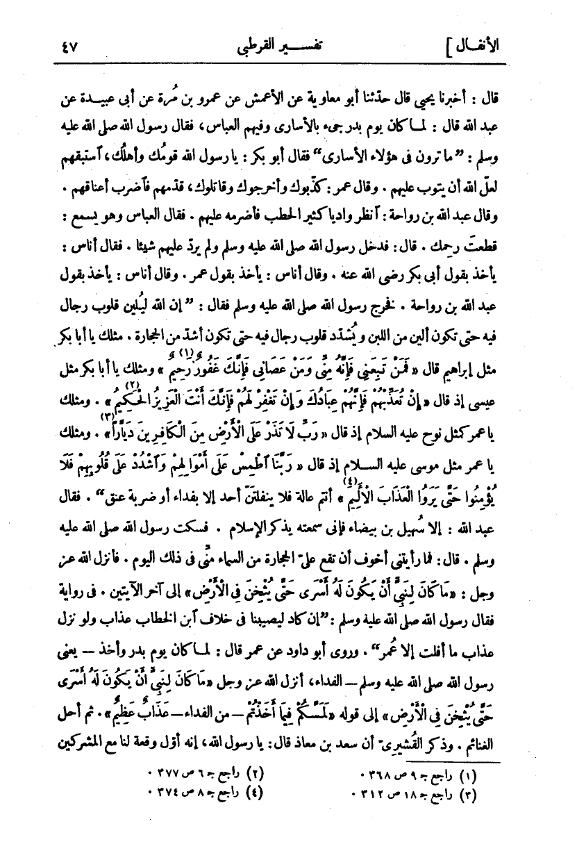 قَالَ: أَخْبَرَنَا يَحْيَى قَالَ حَدَّثَنَا أَبُو مُعَاوِيَةَ عَنِ الْأَعْمَشِ عَنْ عَمْرِو بْنِ مُرَّةَ عَنْ أَبِي عُبَيْدَةَ عَنْ عَبْدِ اللَّهِ قَالَ: لَمَّا كان يوم بدر جئ بِالْأُسَارَى وَفِيهِمُ الْعَبَّاسُ، فَقَالَ رَسُولُ اللَّهِ صَلَّى اللَّهُ عَلَيْهِ وَسَلَّمَ: (مَا تَرَوْنَ فِي هَؤُلَاءِ الْأُسَارَى) فَقَالَ أَبُو بَكْرٍ: يَا رَسُولَ اللَّهِ قَوْمُكَ وَأَهْلُكَ، اسْتَبْقِهِمْ لَعَلَّ اللَّهَ أَنْ يَتُوبَ عَلَيْهِمْ. وَقَالَ عُمَرُ: كَذَّبُوكَ وَأَخْرَجُوكَ وَقَاتَلُوكَ، قَدِّمْهُمْ فَاضْرِبْ أَعْنَاقَهُمْ. وَقَالَ عَبْدُ اللَّهِ بْنُ رَوَاحَةَ: انْظُرْ وَادِيًا كَثِيرَ الْحَطَبِ فَأَضْرِمْهُ عَلَيْهِمْ. فَقَالَ الْعَبَّاسُ وَهُوَ يَسْمَعُ: قَطَعْتَ رَحِمَكَ. قَالَ: فَدَخَلَ رَسُولُ اللَّهِ صَلَّى اللَّهُ عَلَيْهِ وَسَلَّمَ وَلَمْ يَرُدَّ عَلَيْهِمْ شَيْئًا. فَقَالَ أُنَاسٌ: يَأْخُذُ بِقَوْلِ أَبِي بَكْرٍ رَضِيَ اللَّهُ عَنْهُ. وَقَالَ أُنَاسٌ: يَأْخُذُ بِقَوْلِ عُمَرَ. وَقَالَ أُنَاسٌ: يَأْخُذُ بِقَوْلِ عَبْدِ اللَّهِ بْنِ رَوَاحَةَ. فَخَرَجَ رَسُولُ اللَّهِ صَلَّى اللَّهُ عَلَيْهِ وَسَلَّمَ فَقَالَ: (إِنَّ اللَّهَ لَيُلِينُ قُلُوبَ رِجَالٍ فِيهِ حَتَّى تَكُونَ أَلْيَنَ مِنَ اللَّبَنِ وَيَشْدُدُ قُلُوبَ رِجَالٍ فِيهِ حَتَّى تَكُونَ أَشَدَّ مِنَ الْحِجَارَةِ). مَثَلُكَ يَا أَبَا بَكْرٍ مَثَلُ إِبْرَاهِيمَ قَالَ" فَمَنْ تَبِعَنِي فَإِنَّهُ مِنِّي وَمَنْ عَصانِي فَإِنَّكَ غَفُورٌ رَحِيمٌ" «١» [إبراهيم: ٣٦] وَمَثَلُكَ يَا أَبَا بَكْرٍ مَثَلُ عِيسَى إِذْ قَالَ" إِنْ تُعَذِّبْهُمْ فَإِنَّهُمْ عِبادُكَ وَإِنْ تَغْفِرْ لَهُمْ فَإِنَّكَ أَنْتَ الْعَزِيزُ الْحَكِيمُ" «٢» [المائدة: ١١٨]. وَمَثَلُكَ يَا عُمَرُ كَمَثَلِ نُوحٍ عَلَيْهِ السَّلَامُ إِذْ قَالَ" رَبِّ لَا تَذَرْ عَلَى الْأَرْضِ مِنَ الْكافِرِينَ دَيَّاراً" «٣» [نوح: ٢٦]. وَمَثَلُكَ يَا عُمَرُ مَثَلُ مُوسَى عَلَيْهِ السَّلَامُ إِذْ قَالَ" رَبَّنَا اطْمِسْ عَلى أَمْوالِهِمْ وَاشْدُدْ عَلى قُلُوبِهِمْ فَلا يُؤْمِنُوا حَتَّى يَرَوُا الْعَذابَ الْأَلِيمَ" «٤» [يونس: ٨٨] أَنْتُمْ عَالَةٌ فَلَا يَنْفَلِتَنَّ أَحَدٌ إِلَّا بِفِدَاءٍ أَوْ ضَرْبَةِ عُنُقٍ (. فَقَالَ عَبْدُ اللَّهِ: إِلَّا سُهَيْلَ بْنَ بَيْضَاءَ فَإِنِّي سَمِعْتُهُ يَذْكُرُ الْإِسْلَامَ. فَسَكَتَ رَسُولُ اللَّهِ صَلَّى اللَّهُ عَلَيْهِ وَسَلَّمَ. قَالَ: فَمَا رَأَيْتُنِي أَخْوَفَ أَنْ تَقَعَ عَلَيَّ الْحِجَارَةُ مِنَ السَّمَاءِ مِنِّي فِي ذَلِكَ الْيَوْمِ. فَأَنْزَلَ اللَّهُ عَزَّ وَجَلَّ:" مَا كانَ لِنَبِيٍّ أَنْ يَكُونَ لَهُ أَسْرى حَتَّى يُثْخِنَ فِي الْأَرْضِ" إِلَى آخِرِ الْآيَتَيْنِ. فِي رِوَايَةٍ فَقَالَ رَسُولُ اللَّهِ صَلَّى اللَّهُ عَلَيْهِ وَسَلَّمَ: (إن كَادَ لَيُصِيبُنَا فِي خِلَافِ ابْنِ الْخَطَّابِ عَذَابٌ وَلَوْ نَزَلَ عَذَابٌ مَا أَفْلَتَ إِلَّا عُمَرُ). وَرَوَى أَبُو دَاوُدَ عَنْ عُمَرَ قَالَ: لَمَّا كَانَ يَوْمُ بَدْرٍ وَأَخَذَ- يَعْنِي رَسُولُ اللَّهِ صَلَّى اللَّهُ عَلَيْهِ وَسَلَّمَ- الْفِدَاءَ، أَنْزَلَ اللَّهُ عَزَّ وَجَلَّ" مَا كانَ لِنَبِيٍّ أَنْ يَكُونَ لَهُ أَسْرى حَتَّى يُثْخِنَ فِي الْأَرْضِ" إِلَى قَوْلِهِ" لَمَسَّكُمْ فِيما أَخَذْتُمْ"- مِنَ الْفِدَاءِ-" عَذابٌ عَظِيمٌ" [الأنفال: ٦٨]. ثُمَّ أَحَلَّ الْغَنَائِمَ. وَذَكَرَ الْقُشَيْرِيُّ أَنَّ سَعْدَ بْنَ مُعَاذٍ قَالَ: يَا رَسُولَ اللَّهِ، إِنَّهُ أول وقعة لنا مع المشركين