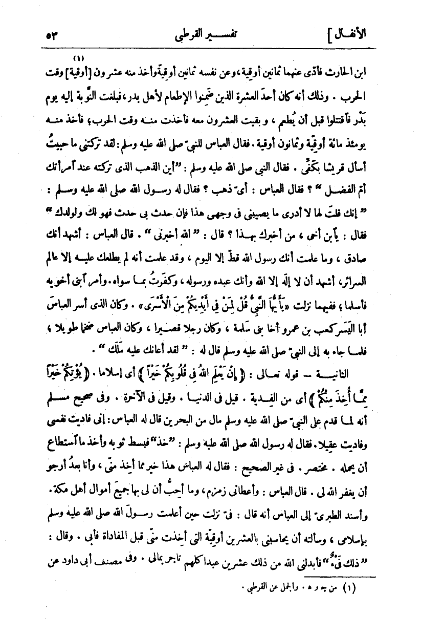 ابن الْحَارِثِ فَأَدَّى عَنْهُمَا ثَمَانِينَ أُوقِيَّةً، وَعَنْ نَفْسِهِ ثَمَانِينَ أُوقِيَّةً وَأُخِذَ مِنْهُ عِشْرُونَ [أُوقِيَّةً «١»] وَقْتَ الْحَرْبِ. وَذَلِكَ أَنَّهُ كَانَ أَحَدَ الْعَشَرَةِ الَّذِينَ ضَمِنُوا الْإِطْعَامَ لِأَهْلِ بَدْرٍ، فَبَلَغَتِ النَّوْبَةُ إِلَيْهِ يَوْمَ بَدْرٍ فَاقْتَتَلُوا قَبْلَ أَنْ يُطْعِمَ، وَبَقِيَتِ الْعِشْرُونَ مَعَهُ فَأُخِذَتْ مِنْهُ وَقْتَ الْحَرْبِ، فَأُخِذَ مِنْهُ يَوْمَئِذٍ مِائَةُ أُوقِيَّةٍ وَثَمَانُونَ أُوقِيَّةً. فَقَالَ الْعَبَّاسُ لِلنَّبِيِّ صَلَّى اللَّهُ عَلَيْهِ وَسَلَّمَ: لَقَدْ تَرَكْتَنِي مَا حَيِيتُ أَسْأَلُ قُرَيْشًا بِكَفِّي. فَقَالَ النَّبِيُّ صَلَّى اللَّهُ عَلَيْهِ وَسَلَّمَ: (أَيْنَ الذَّهَبُ الَّذِي تَرَكْتَهُ عِنْدَ امْرَأَتِكَ أُمِّ الْفَضْلِ)؟ فَقَالَ الْعَبَّاسُ: أَيُّ ذَهَبٍ؟ فَقَالَ لَهُ رَسُولُ اللَّهِ صَلَّى اللَّهُ عَلَيْهِ وَسَلَّمَ: (إِنَّكَ قُلْتَ لَهَا لَا أَدْرِي مَا يُصِيبُنِي فِي وَجْهِي هَذَا فَإِنْ حَدَثَ بِي حَدَثٌ فَهُوَ لَكِ وَلِوَلَدِكِ) فَقَالَ: يَا بْنَ أَخِي، مَنْ أَخْبَرَكَ بِهَذَا؟ قَالَ: (اللَّهُ أَخْبَرَنِي). قَالَ الْعَبَّاسُ: أَشْهَدُ أَنَّكَ صَادِقٌ، وَمَا عَلِمْتُ أَنَّكَ رَسُولُ اللَّهِ قَطُّ إِلَّا الْيَوْمَ، وَقَدْ عَلِمْتُ أَنَّهُ لَمْ يُطْلِعْكَ عَلَيْهِ إِلَّا عَالِمُ السَّرَائِرِ، أَشْهَدُ أَنْ لَا إِلَهَ إِلَّا اللَّهُ وَأَنَّكَ عَبْدُهُ وَرَسُولُهُ، وَكَفَرْتُ بِمَا سِوَاهُ. وَأَمَرَ ابْنَيْ أَخَوَيْهِ فَأَسْلَمَا، فَفِيهِمَا نَزَلَتْ" يَا أَيُّهَا النَّبِيُّ قُلْ لِمَنْ فِي أَيْدِيكُمْ مِنَ الْأَسْرى ". وَكَانَ الَّذِي أَسَرَ الْعَبَّاسَ أَبَا الْيُسْرِ كَعْبَ بْنَ عَمْرٍو أَخَا بَنِي سَلَمَةَ، وَكَانَ رَجُلًا قَصِيرًا، وَكَانَ الْعَبَّاسُ ضَخْمًا طَوِيلًا، فَلَمَّا جَاءَ بِهِ إِلَى النَّبِيَّ صَلَّى اللَّهُ عَلَيْهِ وَسَلَّمَ قَالَ لَهُ: (لَقَدْ أَعَانَكَ عَلَيْهِ مَلَكٌ). الثَّانِيَةُ- قَوْلُهُ تَعَالَى: (إِنْ يَعْلَمِ اللَّهُ فِي قُلُوبِكُمْ خَيْراً) أَيْ إِسْلَامًا. يُؤْتِكُمْ خَيْرًا مِمَّا أُخِذَ مِنْكُمْ) أَيْ مِنَ الْفِدْيَةِ. قِيلَ فِي الدُّنْيَا. وَقِيلَ فِي الْآخِرَةِ. وَفِي صَحِيحِ مُسْلِمٍ أَنَّهُ لَمَّا قَدِمَ عَلَى النَّبِيِّ صَلَّى اللَّهُ عَلَيْهِ وَسَلَّمَ مَالٌ مِنْ الْبَحْرَيْنِ قَالَ لَهُ الْعَبَّاسُ: إِنِّي فَادَيْتُ نَفْسِي وَفَادَيْتُ عَقِيلًا. فَقَالَ لَهُ رَسُولُ اللَّهِ صَلَّى اللَّهُ عَلَيْهِ وَسَلَّمَ: (خُذْ) فَبَسَطَ ثَوْبَهُ وَأَخَذَ مَا اسْتَطَاعَ أَنْ يَحْمِلَهُ. مُخْتَصَرٌ. فِي غَيْرِ الصَّحِيحِ: فَقَالَ لَهُ الْعَبَّاسُ هَذَا خَيْرٌ مِمَّا أُخِذَ مِنِّي، وَأَنَا بَعْدُ أَرْجُو أَنْ يَغْفِرَ اللَّهُ لِي. قَالَ الْعَبَّاسُ: وَأَعْطَانِي زَمْزَمَ، وَمَا أُحِبُّ أَنَّ لِي بِهَا جَمِيعَ أَمْوَالِ أَهْلِ مَكَّةَ. وَأَسْنَدَ الطَّبَرِيُّ إِلَى