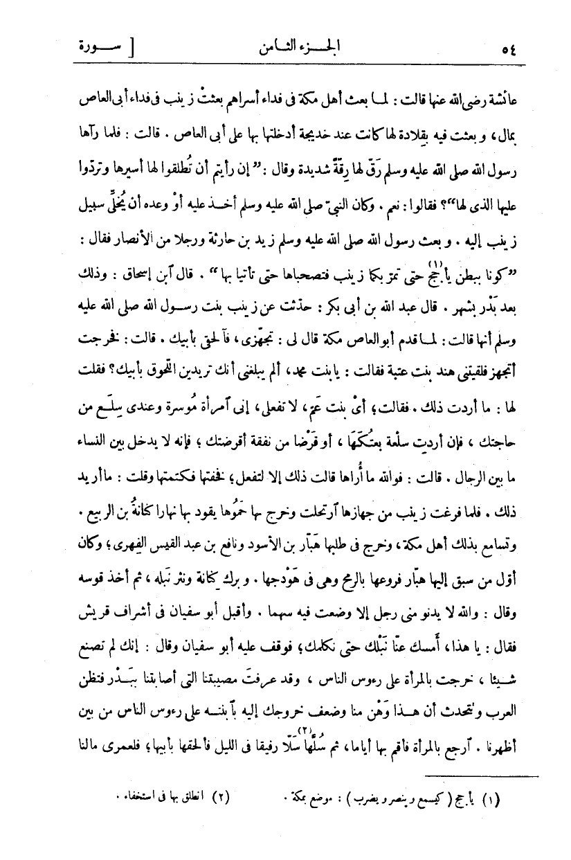 عَائِشَةَ رَضِيَ اللَّهُ عَنْهَا قَالَتْ: لَمَّا بَعَثَ أَهْلُ مَكَّةَ فِي فِدَاءِ أَسْرَاهُمْ بَعَثَتْ زَيْنَبُ فِي فِدَاءِ أَبِي الْعَاصِ بِمَالٍ، وَبَعَثَتْ فِيهِ بِقِلَادَةٍ لَهَا كَانَتْ عِنْدَ خَدِيجَةَ أَدْخَلَتْهَا بِهَا عَلَى أَبِي الْعَاصِ. قَالَتْ: فَلَمَّا رَآهَا رَسُولُ اللَّهِ صَلَّى اللَّهُ عَلَيْهِ وَسَلَّمَ رَقَّ لَهَا رِقَّةً شَدِيدَةً وَقَالَ: (إِنْ رَأَيْتُمْ أَنْ تُطْلِقُوا لَهَا أَسِيرَهَا وَتَرُدُّوا عَلَيْهَا الَّذِي لَهَا)؟ فَقَالُوا: نَعَمْ. وَكَانَ النَّبِيُّ صَلَّى اللَّهُ عَلَيْهِ وَسَلَّمَ أَخَذَ عَلَيْهِ أَوْ وَعَدَهُ أَنْ يُخَلِّيَ سَبِيلَ زَيْنَبَ إِلَيْهِ. وَبَعَثَ رَسُولُ اللَّهِ صَلَّى اللَّهُ عَلَيْهِ وَسَلَّمَ زَيْدُ بْنَ حَارِثَةَ وَرَجُلًا مِنَ الْأَنْصَارِ فَقَالَ: (كُونَا بِبَطْنِ يَأْجَجَ «١» حَتَّى تَمُرَّ بِكُمَا زَيْنَبُ فَتَصْحَبَاهَا حَتَّى تَأْتِيَا بِهَا). قَالَ ابْنُ إِسْحَاقَ: وَذَلِكَ بَعْدَ بَدْرٍ بِشَهْرٍ. قَالَ عَبْدُ اللَّهِ بْنُ أَبِي بَكْرٍ: حُدِّثْتُ عَنْ زَيْنَبَ بِنْتِ رَسُولُ اللَّهِ صَلَّى اللَّهُ عَلَيْهِ وَسَلَّمَ إِنَّهَا قَالَتْ: لَمَّا قَدِمَ أَبُو الْعَاصِ مَكَّةَ قَالَ لِي: تَجَهَّزِي، فَالْحَقِي بِأَبِيكِ. قَالَتْ: فَخَرَجْتُ أَتَجَهَّزُ فَلَقِيَتْنِي هِنْدُ بِنْتُ عُتْبَةَ فَقَالَتْ: يَا بِنْتَ مُحَمَّدٍ، أَلَمْ يَبْلُغْنِي أَنَّكِ تُرِيدِينَ اللُّحُوقَ بِأَبِيكِ؟ فَقُلْتُ لَهَا: مَا أَرَدْتُ ذَلِكَ. فَقَالَتْ، أَيْ بِنْتَ عَمِّ، لَا تَفْعَلِي، إِنِّي امْرَأَةٌ مُوسِرَةٌ وَعِنْدِي سِلَعٌ مِنْ حَاجَتِكَ، فَإِنْ أَرَدْتِ سِلْعَةً بِعْتُكِهَا، أَوْ قَرْضًا مِنْ نَفَقَةٍ أَقْرَضْتُكِ، فَإِنَّهُ لَا يَدْخُلُ بَيْنَ النِّسَاءِ مَا بَيْنَ الرِّجَالِ. قَالَتْ: فَوَاللَّهِ مَا أَرَاهَا قَالَتْ ذَلِكَ إِلَّا لِتَفْعَلَ، فَخِفْتُهَا فَكَتَمْتُهَا وَقُلْتُ: مَا أُرِيدُ ذَلِكَ. فَلَمَّا فَرَغَتْ زَيْنَبُ مِنْ جِهَازِهَا ارْتَحَلَتْ وَخَرَجَ بِهَا حَمُوهَا يَقُودُ بِهَا نَهَارًا كِنَانَةُ بْنُ الرَّبِيعِ. وَتَسَامَعَ بِذَلِكَ أَهْلُ مَكَّةَ، وَخَرَجَ فِي طَلَبِهَا هَبَّارُ بْنُ الْأَسْوَدِ وَنَافِعُ بْنُ عَبْدِ الْقَيْسِ الْفِهْرِيُّ، وَكَانَ أَوَّلَ مَنْ مبق إِلَيْهَا هَبَّارٌ فَرَوَّعَهَا بِالرُّمْحِ وَهِيَ فِي هَوْدَجِهَا. وَبَرَكَ كِنَانَةُ وَنَثَرَ نَبْلَهُ، ثُمَّ أَخَذَ قَوْسَهُ وَقَالَ: وَاللَّهِ لَا يَدْنُو مِنِّي رَجُلٌ إِلَّا وَضَعْتُ فِيهِ سَهْمًا. وَأَقْبَلَ أَبُو سُفْيَانَ فِي أَشْرَافِ قُرَيْشٍ فَقَالَ: يَا هَذَا، أَمْسِكْ عَنَّا نَبْلَكَ حَتَّى نُكَلِّمَكَ، فَوَقَفَ عَلَيْهِ أَبُو سُفْيَانَ وَقَالَ: إِنَّكَ لَمْ تَصْنَعْ شَيْئًا، خَرَجْتَ بِالْمَرْأَةِ عَلَى رُءُوسِ النَّاسِ، وَقَدْ عَرَفْتَ مُصِيبَتَنَا الَّتِي أَصَابَتْنَا بِبَدْرٍ فَتَظُنُّ الْعَرَبُ وَتَتَحَدَّثُ أَنَّ هَذَا وَهَنٌ مِنَّا وَضَعْفٌ خُرُوجُكَ إِلَيْهِ بِابْنَتِهِ عَلَى رُءُوسِ النَّاسِ مِنْ بَيْنِ أَظْهُرِنَا. ارْجِعْ بِالْمَرْأَةِ فَأَقِمْ بِهَا أَيَّامًا، ثُمَّ سُلَّهَا «٢» سَلًّا رَفِيقًا فِي اللَّيْلِ فَأَلْحِقْهَا بِأَبِيهَا، فَلَعَمْرِي مَا لَنَا