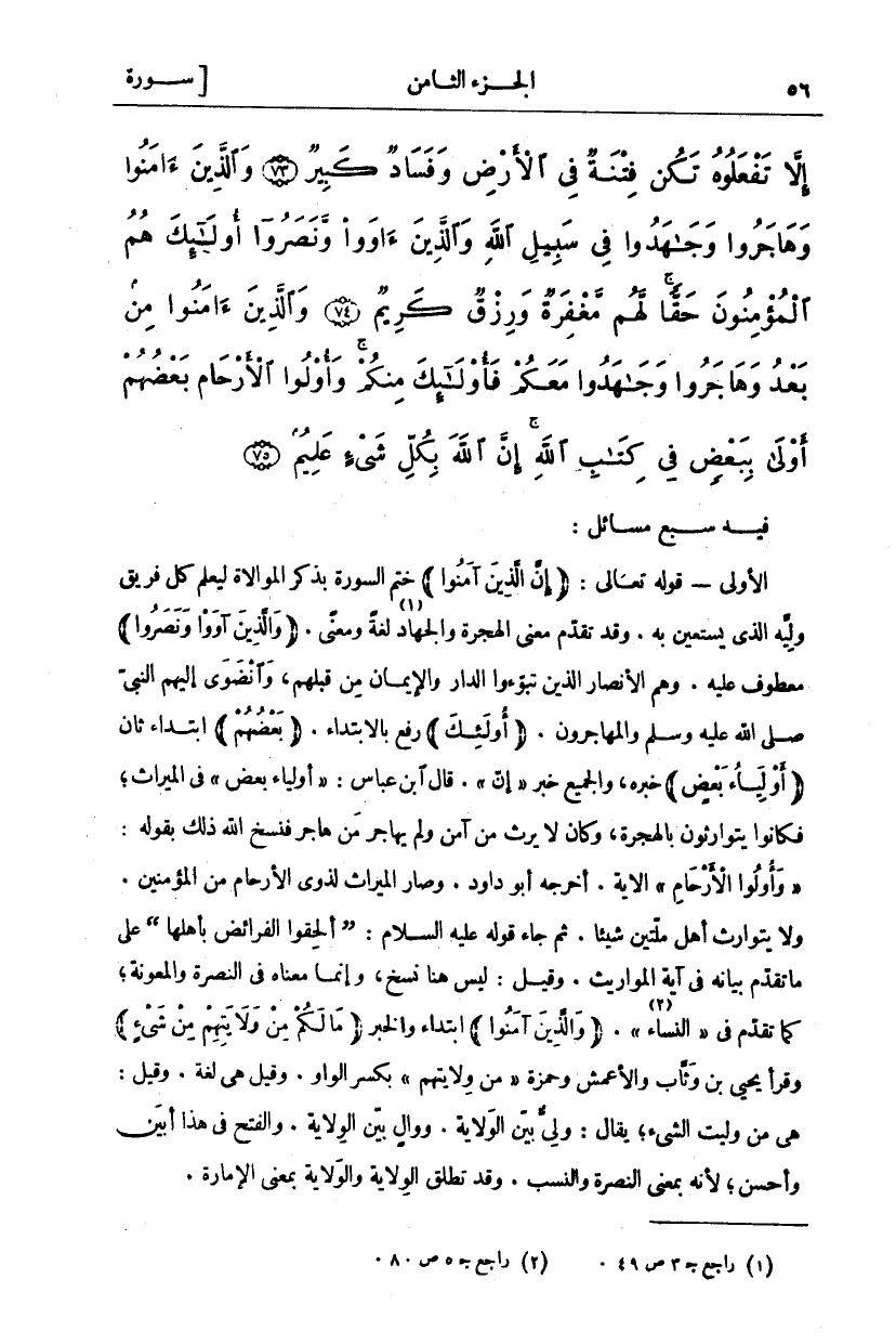 فِيهِ سَبْعُ مَسَائِلَ: الْأُولَى- قَوْلُهُ تَعَالَى: (إِنَّ الَّذِينَ آمَنُوا) خَتَمَ السُّورَةَ بِذِكْرِ الْمُوَالَاةِ لِيَعْلَمَ كُلُّ فَرِيقٍ وَلِيَّهُ الَّذِي يَسْتَعِينُ بِهِ. وَقَدْ تَقَدَّمَ مَعْنَى الْهِجْرَةِ وَالْجِهَادِ «١» لُغَةً وَمَعْنًى. (وَالَّذِينَ آوَوْا وَنَصَرُوا) مَعْطُوفٌ عَلَيْهِ. وَهُمُ الْأَنْصَارُ الَّذِينَ تَبَوَّءُوا الدَّارَ وَالْإِيمَانَ مِنْ قَبْلِهِمْ، وَانْضَوَى إِلَيْهِمُ النَّبِيُّ صَلَّى اللَّهُ عَلَيْهِ وَسَلَّمَ وَالْمُهَاجِرُونَ. (أُولئِكَ) رَفْعٌ بِالِابْتِدَاءِ. (بَعْضُهُمْ) ابْتِدَاءٌ ثَانٍ (أَوْلِياءُ بَعْضٍ) خَبَرُهُ، وَالْجَمِيعُ خَبَرُ" إِنَّ". قَالَ ابْنُ عَبَّاسٍ:" أَوْلِياءُ بَعْضٍ" فِي الْمِيرَاثِ، فَكَانُوا يَتَوَارَثُونَ بِالْهِجْرَةِ، وَكَانَ لَا يَرِثُ مَنْ آمَنَ وَلَمْ يُهَاجِرْ من هاجر فنسخ الله ذلك بقوله:" وَأُولُوا الْأَرْحامِ" الْآيَةَ. أَخْرَجَهُ أَبُو دَاوُدَ. وَصَارَ الْمِيرَاثُ لِذَوِي الْأَرْحَامِ مِنَ الْمُؤْمِنِينَ. وَلَا يَتَوَارَثُ أَهْلُ مِلَّتَيْنِ شَيْئًا. ثُمَّ جَاءَ قَوْلُهُ عَلَيْهِ السَّلَامُ: (أَلْحِقُوا الْفَرَائِضَ بِأَهْلِهَا) عَلَى مَا تَقَدَّمَ بَيَانُهُ فِي آيَةِ الْمَوَارِيثِ. وَقِيلَ: لَيْسَ هُنَا نَسْخٌ، وَإِنَّمَا مَعْنَاهُ فِي النُّصْرَةِ وَالْمَعُونَةُ، كَمَا تَقَدَّمَ فِي" النِّسَاءِ" «٢». (وَالَّذِينَ آمَنُوا) ابْتِدَاءٌ وَالْخَبَرُ (مَا لَكُمْ مِنْ وَلايَتِهِمْ مِنْ شَيْءٍ) وَقَرَأَ يَحْيَى بْنُ وَثَّابٍ وَالْأَعْمَشُ وَحَمْزَةُ" مِنْ وَلايَتِهِمْ" بِكَسْرِ الْوَاوِ. وَقِيلَ هِيَ لُغَةٌ. وَقِيلَ: هِيَ مِنْ وَلَّيْتُ الشَّيْءَ، يُقَالُ: وَلِيٌّ بَيِّنُ الْوَلَايَةِ. وَوَالٍ بَيِّنُ الْوَلَايَةِ. وَالْفَتْحُ فِي هَذَا أَبْيَنُ وَأَحْسَنُ، لِأَنَّهُ بِمَعْنَى النُّصْرَةِ وَالنَّسَبِ. وَقَدْ تُطْلَقُ الْوَلَايَةُ والولاية بمعنى الامارة.
