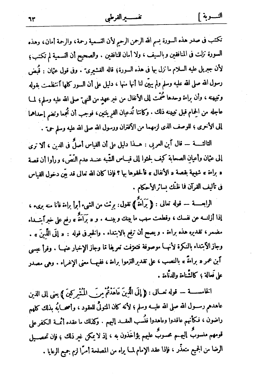تُكْتَبْ فِي صَدْرِ هَذِهِ السُّورَةِ بِسْمِ اللَّهِ الرَّحْمَنِ الرَّحِيمِ لِأَنَّ التَّسْمِيَةَ رَحْمَةٌ وَالرَّحْمَةُ أَمَانٌ وَهَذِهِ السُّورَةُ نَزَلَتْ فِي الْمُنَافِقِينَ وَبِالسَّيْفِ وَلَا أَمَانَ لِلْمُنَافِقِينَ. وَالصَّحِيحُ أَنَّ التَّسْمِيَةَ لَمْ تُكْتَبْ لِأَنَّ جِبْرِيلَ عَلَيْهِ السَّلَامُ مَا نَزَلَ بِهَا فِي هَذِهِ السُّورَةِ قَالَهُ الْقُشَيْرِيُّ. وَفِي قَوْلِ عُثْمَانَ: قُبِضَ رَسُولُ اللَّهِ صَلَّى اللَّهُ عَلَيْهِ وَسَلَّمَ وَلَمْ يُبَيِّنْ لَنَا أَنَّهَا مِنْهَا دَلِيلٌ عَلَى أَنَّ السُّوَرَ كُلَّهَا انْتَظَمَتْ بِقَوْلِهِ وَتَبْيِينِهِ وَأَنَّ بَرَاءَةٌ وَحْدَهَا ضُمَّتْ إِلَى الْأَنْفَالِ مِنْ غَيْرِ عَهْدٍ مِنَ النَّبِيِّ صَلَّى اللَّهُ عَلَيْهِ وَسَلَّمَ لِمَا عَاجَلَهُ مِنَ الْحِمَامِ قَبْلَ تَبْيِينِهِ ذَلِكَ. وَكَانَتَا تُدْعَيَانِ الْقَرِينَتَيْنِ فَوَجَبَ أَنْ تُجْمَعَا وَتُضَمَّ إِحْدَاهُمَا إِلَى الْأُخْرَى لِلْوَصْفِ الَّذِي لَزِمَهُمَا مِنَ الِاقْتِرَانِ وَرَسُولُ اللَّهِ صَلَّى اللَّهُ عَلَيْهِ وَسَلَّمَ حَيٌّ. الثَّالِثَةُ- قَالَ ابْنُ الْعَرَبِيِّ: هَذَا دَلِيلٌ عَلَى أَنَّ الْقِيَاسَ أَصْلٌ فِي الدِّينِ أَلَا تَرَى إِلَى عُثْمَانَ وَأَعْيَانِ الصَّحَابَةِ كَيْفَ لَجَئُوا إِلَى قِيَاسِ الشَّبَهِ عِنْدَ عَدَمِ النَّصِّ وَرَأَوْا أَنَّ قِصَّةَ" بَرَاءَةٌ" شَبِيهَةٌ بِقِصَّةِ" الْأَنْفَالِ" فَأَلْحَقُوهَا بِهَا؟ فَإِذَا كَانَ اللَّهُ تَعَالَى قَدْ بَيَّنَ دُخُولَ الْقِيَاسِ فِي تَأْلِيفِ الْقُرْآنِ فَمَا ظَنُّكَ بِسَائِرِ الْأَحْكَامِ. الرَّابِعَةُ- قَوْلُهُ تَعَالَى:" بَراءَةٌ" تَقُولُ: بَرِئْتُ مِنَ الشَّيْءِ أَبْرَأُ بَرَاءَةً فَأَنَا منه برئ إِذَا أَزَلْتَهُ عَنْ نَفْسِكَ وَقَطَعْتَ سَبَبَ مَا بَيْنَكَ وَبَيْنَهُ. وَ" بَراءَةٌ" رَفْعٌ عَلَى خَبَرِ ابْتِدَاءٍ مُضْمَرٍ تَقْدِيرُهُ هَذِهِ بَرَاءَةٌ. وَيَصِحُّ أَنْ تُرْفَعَ بِالِابْتِدَاءِ. وَالْخَبَرُ فِي قَوْلِهِ:" إِلَى الَّذِينَ". وَجَازَ الِابْتِدَاءُ بِالنَّكِرَةِ لِأَنَّهَا مَوْصُوفَةٌ فَتَعَرَّفَتْ تَعْرِيفًا ما وجاز الاخبار عنها. وقرا عيسى ابن عُمَرَ" بَرَاءَةً" بِالنَّصْبِ عَلَى تَقْدِيرٍ الْتَزِمُوا بَرَاءَةً فَفِيهَا مَعْنَى الْإِغْرَاءِ. وَهِيَ مَصْدَرٌ عَلَى فَعَالَةٍ كَالشَّنَاءَةِ وَالدَّنَاءَةِ. الْخَامِسَةُ- قَوْلُهُ تَعَالَى: (إِلَى الَّذِينَ عاهَدْتُمْ مِنَ الْمُشْرِكِينَ) يَعْنِي إِلَى الَّذِينَ عَاهَدَهُمْ رَسُولِ اللَّهِ صَلَّى اللَّهُ عَلَيْهِ وَسَلَّمَ لِأَنَّهُ كَانَ المتولي للعقود وأصحا به بذلك كلهم راضون فكأنهم عاقد وا وعاهد وا فَنُسِبَ الْعَقْدُ إِلَيْهِمْ. وَكَذَلِكَ مَا عَقَدَهُ أَئِمَّةُ الْكُفْرِ عَلَى قَوْمِهِمْ مَنْسُوبٌ إِلَيْهِمْ مَحْسُوبٌ عَلَيْهِمْ يُؤَاخَذُونَ بِهِ إِذْ لَا يُمْكِنُ غَيْرُ ذَلِكَ فَإِنَّ تَحْصِيلَ الرِّضَا مِنَ الْجَمِيعِ مُتَعَذَّرٌ فَإِذَا عَقَدَ الْإِمَامُ لِمَا يَرَاهُ مِنَ الْمَصْلَحَةِ أَمْرًا لزم جميع الرعايا.
