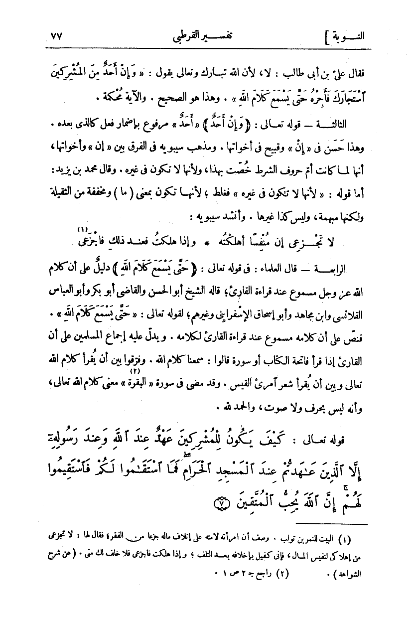 فَقَالَ عَلِيُّ بْنُ أَبِي طَالِبٍ: لَا، لِأَنَّ اللَّهَ تَبَارَكَ وَتَعَالَى يَقُولُ:" وَإِنْ أَحَدٌ مِنَ الْمُشْرِكِينَ اسْتَجارَكَ فَأَجِرْهُ حَتَّى يَسْمَعَ كَلامَ اللَّهِ". وهذا هو صحيح. وَالْآيَةُ مُحْكَمَةٌ." الثَّالِثَةُ- قَوْلُهُ تَعَالَى: (وَإِنْ أَحَدٌ) " أَحَدٌ" مَرْفُوعٌ بِإِضْمَارِ فِعْلٍ كَالَّذِي بَعْدَهُ. وَهَذَا حَسَنٌ فِي" إِنْ" وَقَبِيحٌ فِي أَخَوَاتِهَا. وَمَذْهَبُ سِيبَوَيْهِ فِي الْفَرْقِ بَيْنَ" إِنْ" وَأَخَوَاتِهَا، أَنَّهَا لَمَّا كَانَتْ أُمَّ حُرُوفِ الشَّرْطِ خُصَّتْ بِهَذَا، وَلِأَنَّهَا لَا تَكُونُ فِي غَيْرِهِ. وَقَالَ مُحَمَّدُ بْنُ يَزِيدَ: أَمَّا قَوْلُهُ- لِأَنَّهَا لَا تَكُونُ فِي غَيْرِهِ- فَغَلَطٌ، لِأَنَّهَا تَكُونُ بِمَعْنَى (مَا) وَمُخَفَّفَةً مِنَ الثَّقِيلَةِ وَلَكِنَّهَا مُبْهَمَةٌ، وَلَيْسَ كَذَا غير ها. وَأَنْشَدَ سِيبَوَيْهِ:
