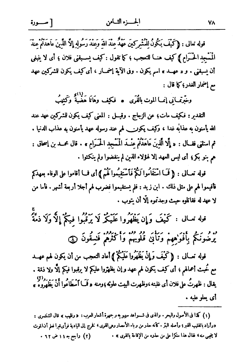 التَّقْدِيرُ: فَكَيْفَ مَاتَ، عَنِ الزَّجَّاجِ. وَقِيلَ: الْمَعْنَى كَيْفَ يَكُونُ لِلْمُشْرِكِينَ عَهْدٌ عِنْدَ اللَّهِ يَأْمَنُونَ بِهِ عَذَابَهُ غَدًا، وَكَيْفَ يَكُونُ لَهُمْ عِنْدَ رَسُولِهِ عَهْدٌ يَأْمَنُونَ بِهِ عَذَابَ الدُّنْيَا. ثُمَّ اسْتَثْنَى فَقَالَ:" إِلَّا الَّذِينَ عاهَدْتُمْ عِنْدَ الْمَسْجِدِ الْحَرامِ". قَالَ مُحَمَّدُ بْنُ إِسْحَاقَ: هُمْ بَنُو بَكْرٍ، أَيْ لَيْسَ الْعَهْدُ إِلَّا لِهَؤُلَاءِ الَّذِينَ لَمْ يَنْقُضُوا وَلَمْ يَنْكُثُوا. قَوْلُهُ تَعَالَى: (فَمَا اسْتَقامُوا لَكُمْ فَاسْتَقِيمُوا لَهُمْ) أي فما أقاموا على الوفاء بعهد كم فَأَقِيمُوا لَهُمْ عَلَى مِثْلِ ذَلِكَ. ابْنُ زَيْدٍ: فَلَمْ يَسْتَقِيمُوا فَضَرَبَ لَهُمْ أَجَلًا أَرْبَعَةَ أَشْهُرٍ. فَأَمَّا مَنْ لَا عَهْدَ لَهُ فَقَاتِلُوهُ حَيْثُ وجدتموه إلا أن يتوب.