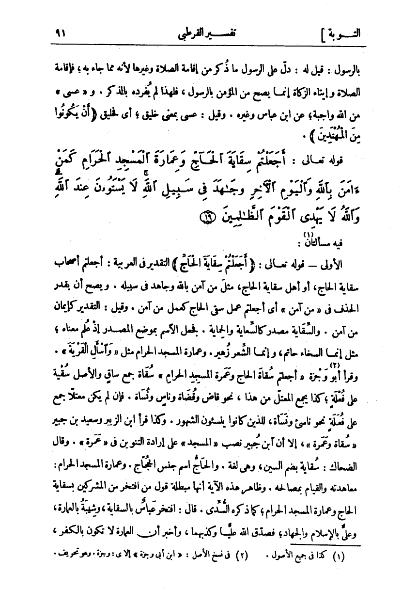 فِيهِ مَسْأَلَتَانِ «١»: الْأُولَى- قَوْلُهُ تعالى:" أَجَعَلْتُمْ سِقايَةَ الْحاجِّ" التَّقْدِيرُ فِي الْعَرَبِيَّةِ: أَجَعَلْتُمْ أَصْحَابَ سِقَايَةِ الْحَاجِّ أَوْ أَهْلَ سِقَايَةِ الْحَاجِّ مِثْلَ مَنْ آمَنَ بِاللَّهِ وَجَاهَدَ فِي سَبِيلِهِ. وَيَصِحُّ أَنْ يُقَدَّرَ الْحَذْفُ فِي" مَنْ آمَنَ" أَيْ أَجَعَلْتُمْ عَمَلَ سَقْيِ الْحَاجِّ كَعَمَلِ مَنْ آمَنَ. وَقِيلَ: التَّقْدِيرُ كَإِيمَانِ مَنْ آمَنَ. وَالسِّقَايَةُ مَصْدَرٌ كَالسِّعَايَةِ وَالْحِمَايَةِ. فَجَعَلَ الِاسْمَ بِمَوْضِعِ الْمَصْدَرِ إِذْ عُلِمَ مَعْنَاهُ، مِثْلَ إِنَّمَا السَّخَاءُ حَاتِمٌ، وَإِنَّمَا الشِّعْرُ زُهَيْرٌ. وَعِمَارَةَ الْمَسْجِدِ الْحَرَامِ مِثْلُ" وَسْئَلِ الْقَرْيَةَ" [يوسف: ٨٢]. وَقَرَأَ أَبُو «٢» وَجْزَةَ" أَجَعَلْتُمْ سُقَاةَ الْحَاجِّ وَعَمَرَةَ الْمَسْجِدِ الْحَرَامِ" سُقَاةُ جَمْعُ سَاقٍ وَالْأَصْلُ سُقْيَةٌ عَلَى فُعْلَةٍ، كَذَا يُجْمَعُ الْمُعْتَلُّ مِنْ هَذَا، نَحْوَ قَاضٍ وَقُضَاةٍ وَنَاسٍ وَنُسَاةٍ. فَإِنْ لَمْ يَكُنْ مُعْتَلًّا جُمِعَ عَلَى فُعَلَةٍ نَحْوَ نَاسِئٍ وَنُسَأَةٍ، لِلَّذِينَ كَانُوا يُنْسِئُونَ الشُّهُورَ. وَكَذَا قَرَأَ ابْنُ الزُّبَيْرِ وَسَعِيدُ بْنُ جُبَيْرٍ" سُقَاةَ وَعَمَرَةَ" إِلَّا أَنَّ ابْنَ جُبَيْرٍ نَصَبَ" الْمَسْجِدَ" عَلَى إِرَادَةِ التَّنْوِينِ فِي" عَمَرَةً". وَقَالَ الضَّحَّاكُ: سُقَايَةً بِضَمِّ السِّينِ، وَهِيَ لُغَةٌ. وَالْحَاجُّ اسْمُ جِنْسِ الْحُجَّاجِ. وَعِمَارَةُ الْمَسْجِدِ الْحَرَامِ: مُعَاهَدَتُهُ وَالْقِيَامُ بِمَصَالِحِهِ. وَظَاهِرُ هَذِهِ الْآيَةِ أَنَّهَا مُبْطِلَةٌ قَوْلَ مَنِ افْتَخَرَ مِنَ الْمُشْرِكِينَ بِسِقَايَةِ الْحَاجِّ وَعِمَارَةِ الْمَسْجِدِ الْحَرَامِ، كَمَا ذَكَرَهُ السُّدِّيُّ. قَالَ: افْتَخَرَ عَبَّاسٌ بِالسِّقَايَةِ، وَشَيْبَةٌ بِالْعِمَارَةِ، وَعَلِيٌّ بِالْإِسْلَامِ وَالْجِهَادِ، فَصَدَّقَ اللَّهُ عَلِيًّا وَكَذَّبَهُمَا، وَأَخْبَرَ أَنَّ الْعِمَارَةَ لَا تكون بالكفر،